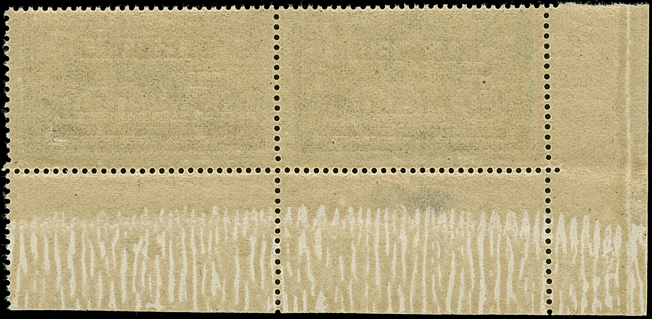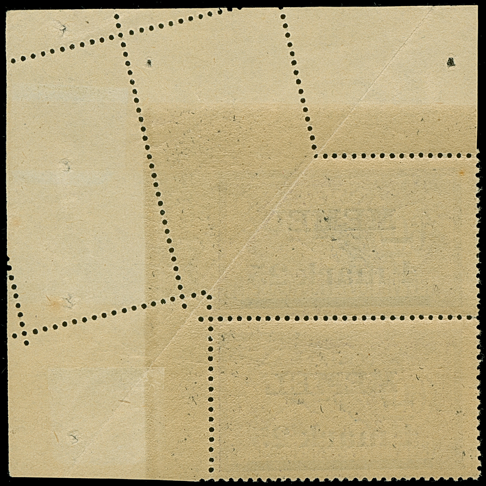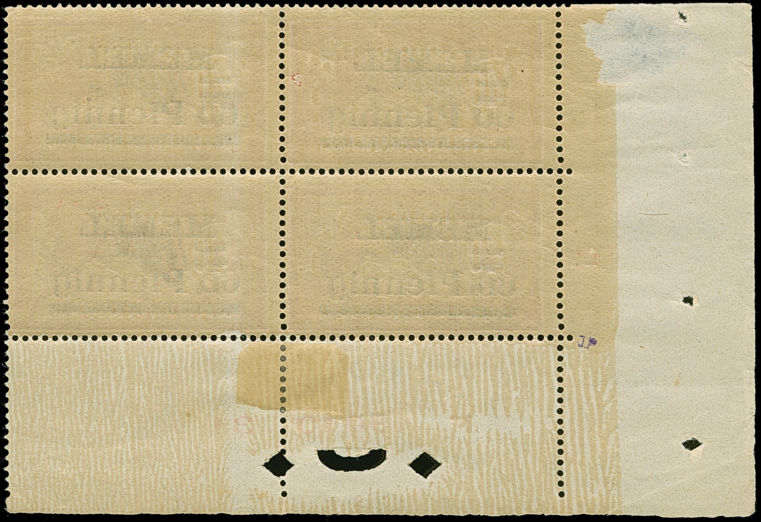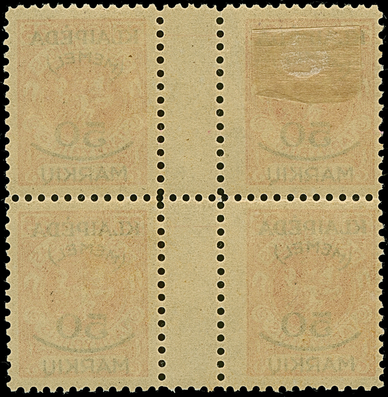 1923, Sicheraufdruck 50 Markiu auf 25 Centai, Viererblock mit zwei Zwischensstegpaaren, die rechte obere Marke ungebraucht, sonst postfrisch, tadellos