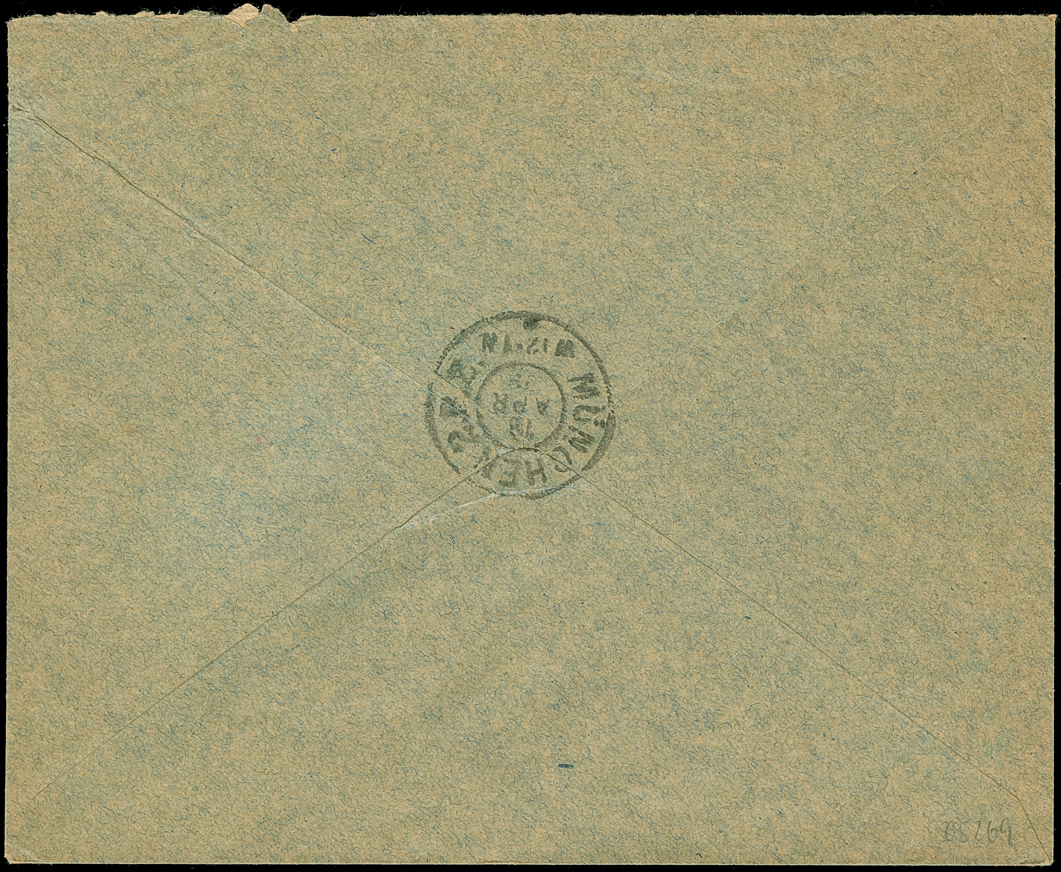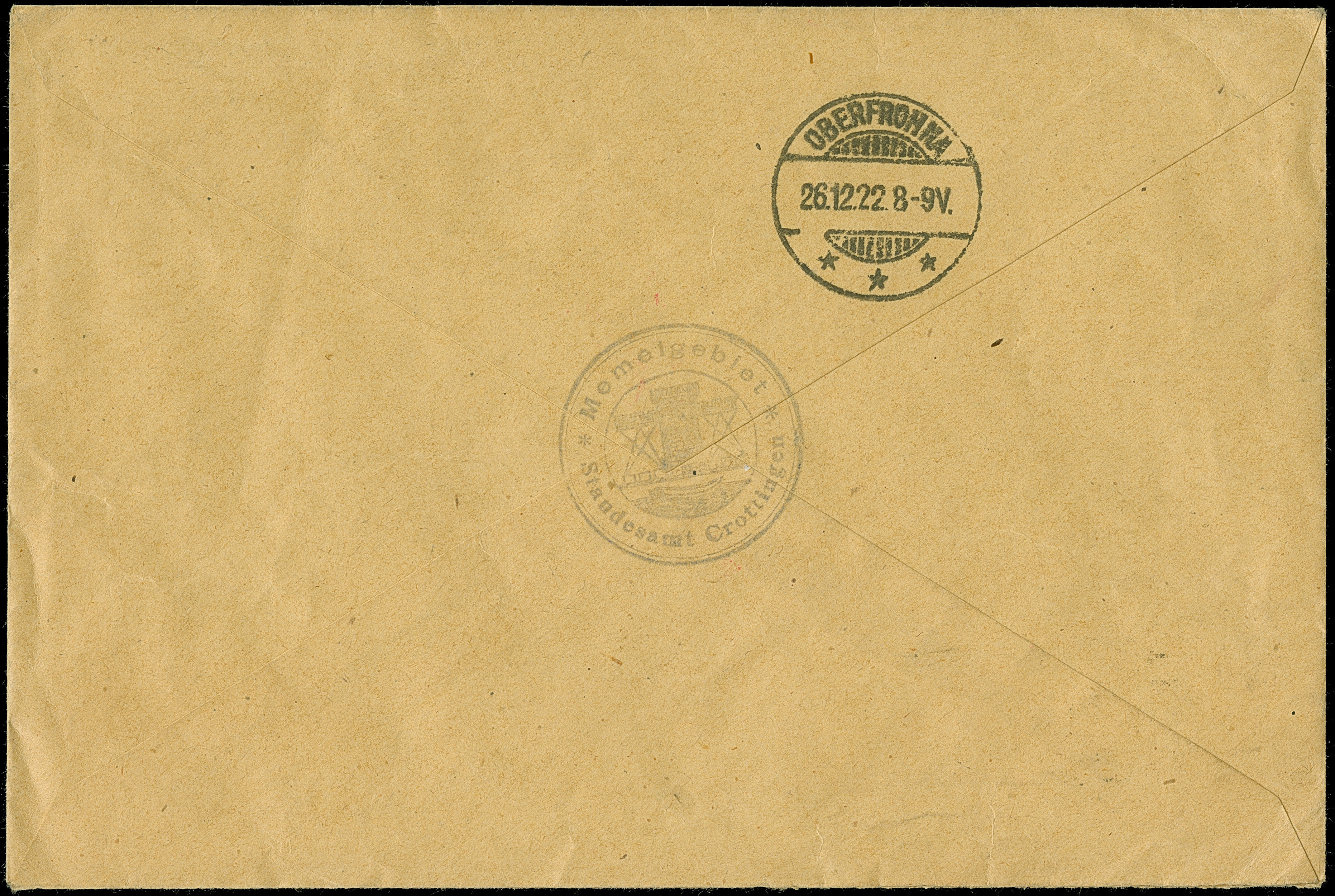 1923, Sichelaufdruck 25 Markes auf 5 Centai, 8er-Block mit zwei Zwischenstegpaaren, farbfrisch und ausgabetypisch gezähnt, sauber mit zwei EKr. “GAIDELLEN 15 4 23” auf portogerechtem R-Brief nach München mit Ankunftsstempel, die rechte äußere Marke kleiner Eckbug, winzig fleckig, oben etwas rauh geöffnet, sonst in tadelloser Erhaltung, ein sehr seltener Brief, gelaufen einen Tag vor Einführung der neuen Währung im Memelgebiet, ProFi hat keinen weiteren derartigen Brief registriert