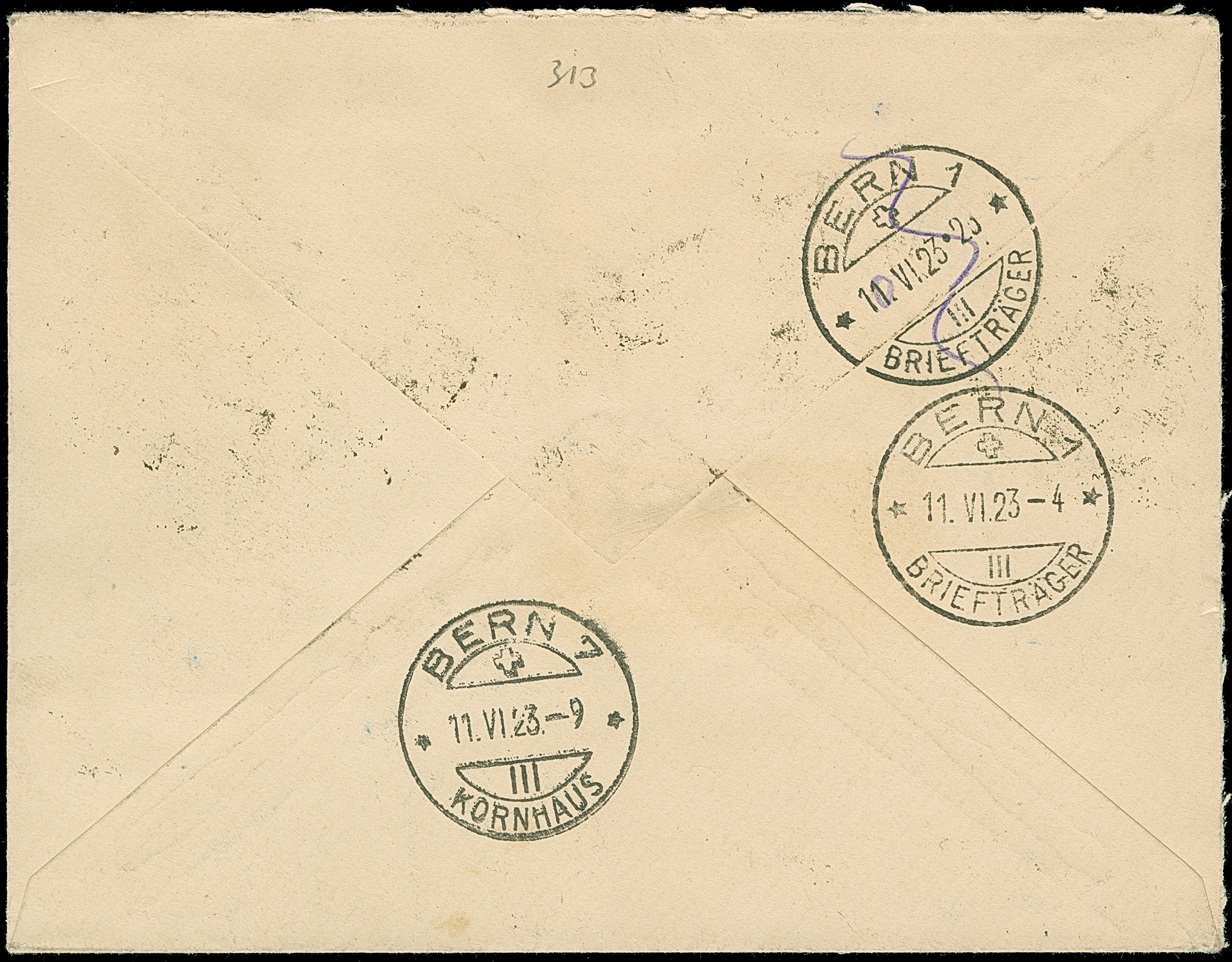 1920, 3 mark auf 2 franc rötlichorange/hellgrünlichblau auf GC-Papier, farbfrisch und gut gezähnt, sauber mit klarem EKr. “GAIDELLEN 7 3 21 8-9 V.” auf Eil-R-Brief aus der Dahmann-Korrespondenz nach Kalkberge mit Ankunftstempel, tadellos, eine seltene Marke