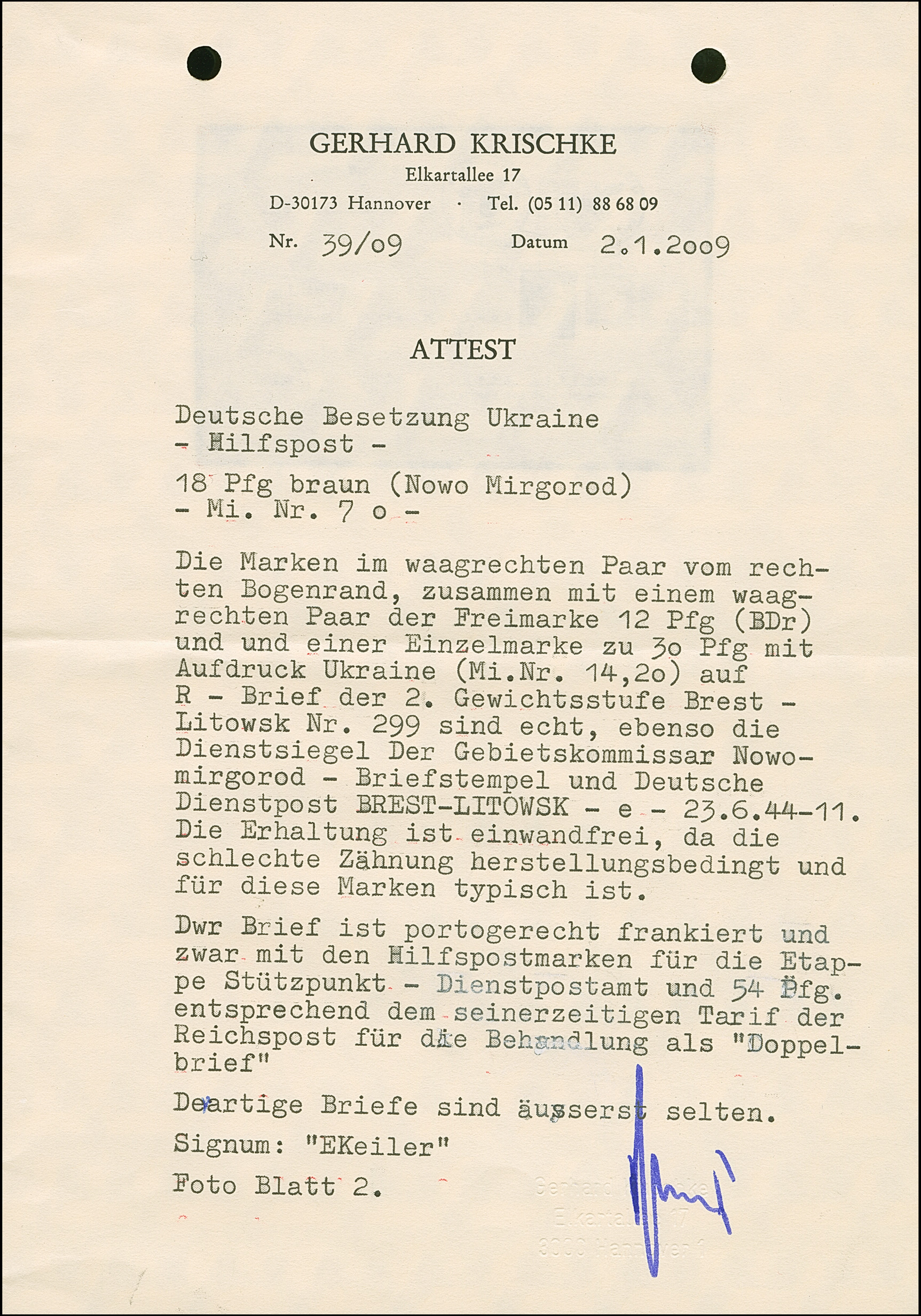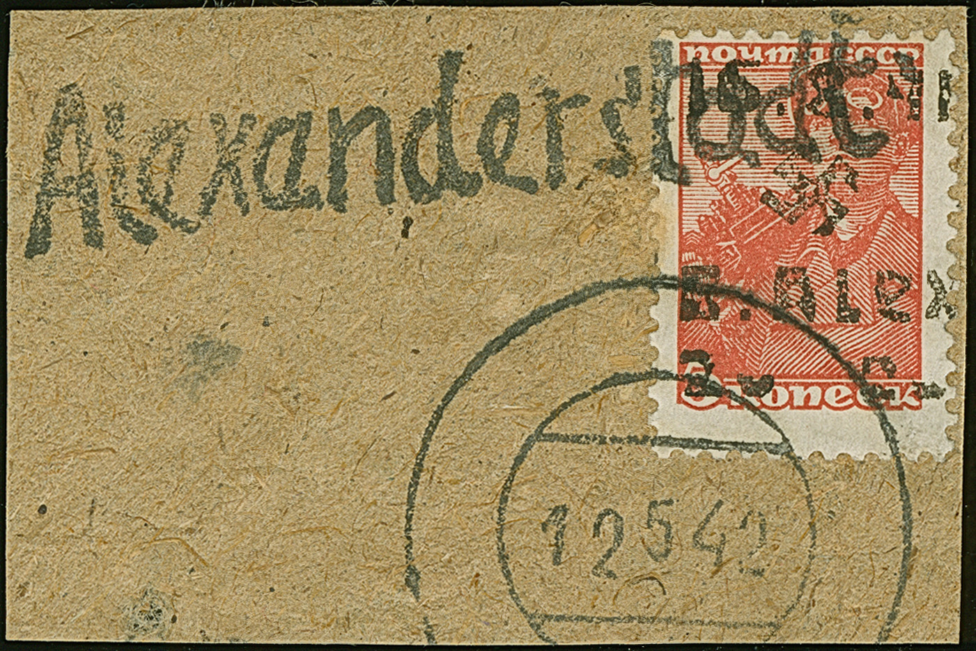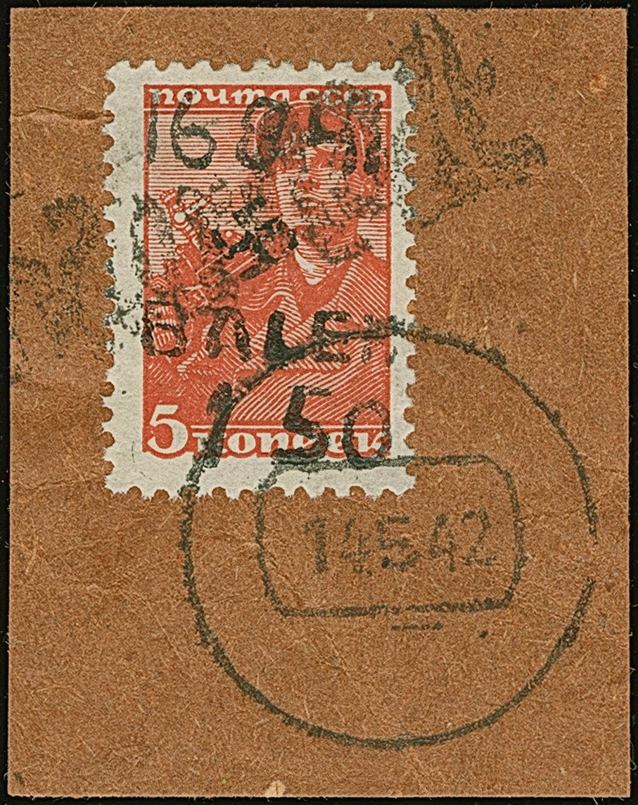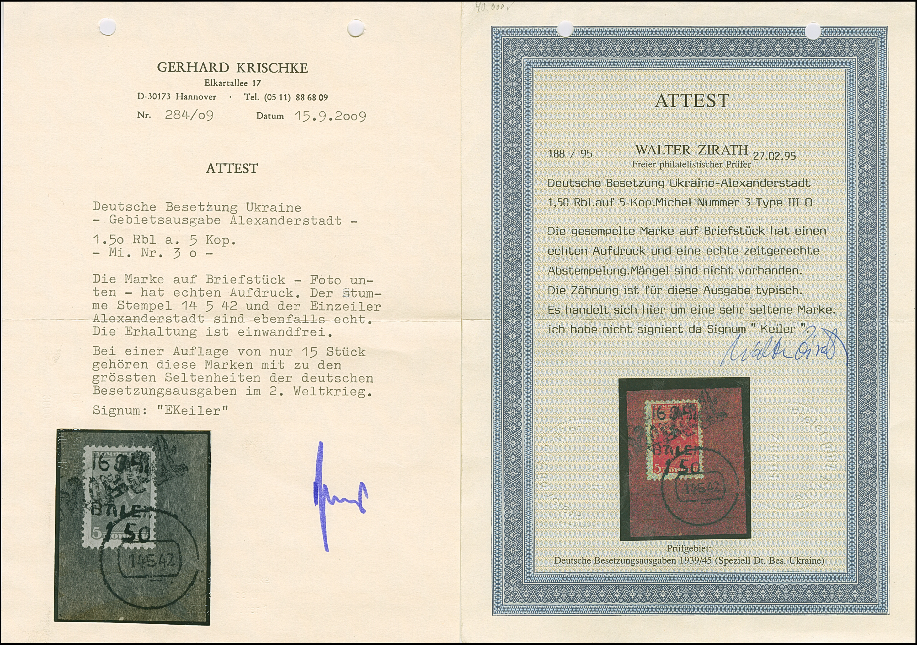 1942, Aufdrucktype III, Hakenkreuz 4mm: 1,50 Rubel auf 5 Kopeken bräunlichrot, farbfrisch und gut gezähnt, sauber mit L1 “Alexanderstadt” und stummem Stempel “14 5 42” auf Briefstück, tadellos. Eine der ganz großen Seltenheiten mit einer Auflage von lediglich 15 Stück, sign. EKeiler sowie Fotoatteste Zirath (1995) und Krischke (2009)