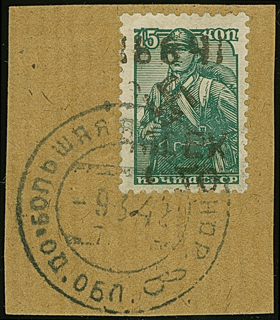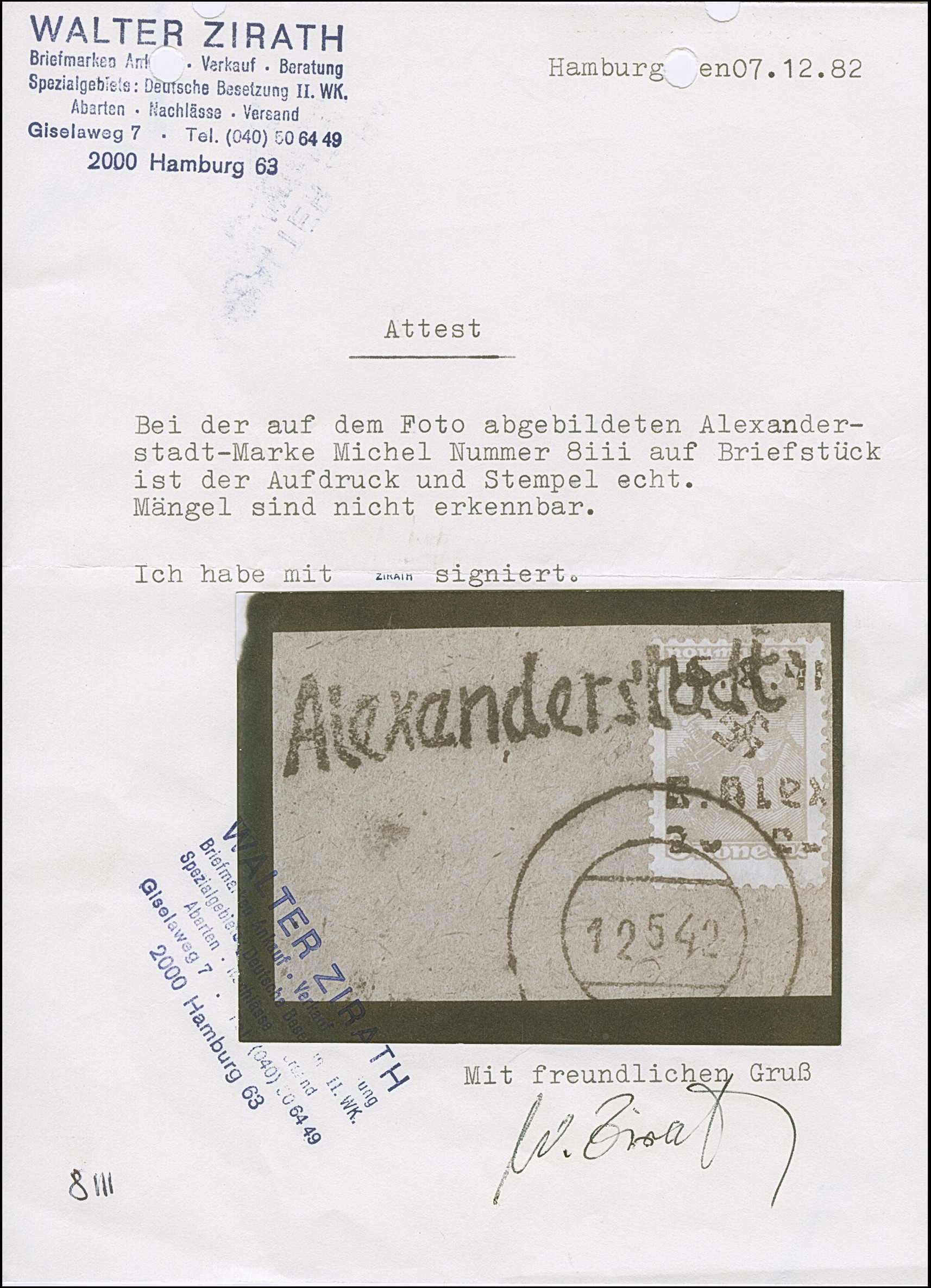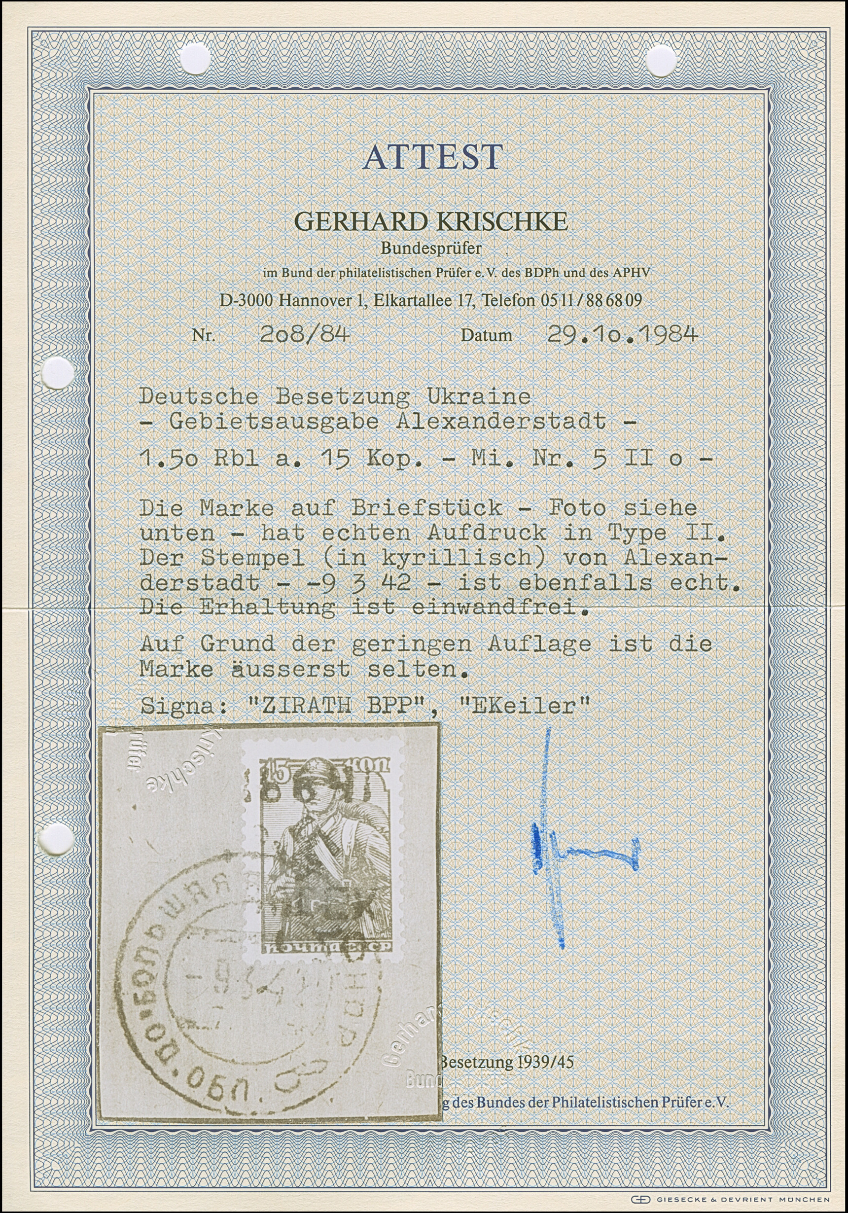 1942, Aufdrucktype II, Hakenkreuz 6mm: 1,50 Rubel auf 15 Kopeken dunkelgraugrün, farbfrisch und gut gezähnt, sauber mit kyrillischem Stempel “ALEXANDERSTADT -9 3 42” auf Briefstück, tadellos. Eine sehr seltene Marke, ProFi hat lediglich 8 gebrauchte Stücke registriert, sign. Zirath BPP sowie EKeiler und Fotoattest Krischke BPP (1984)