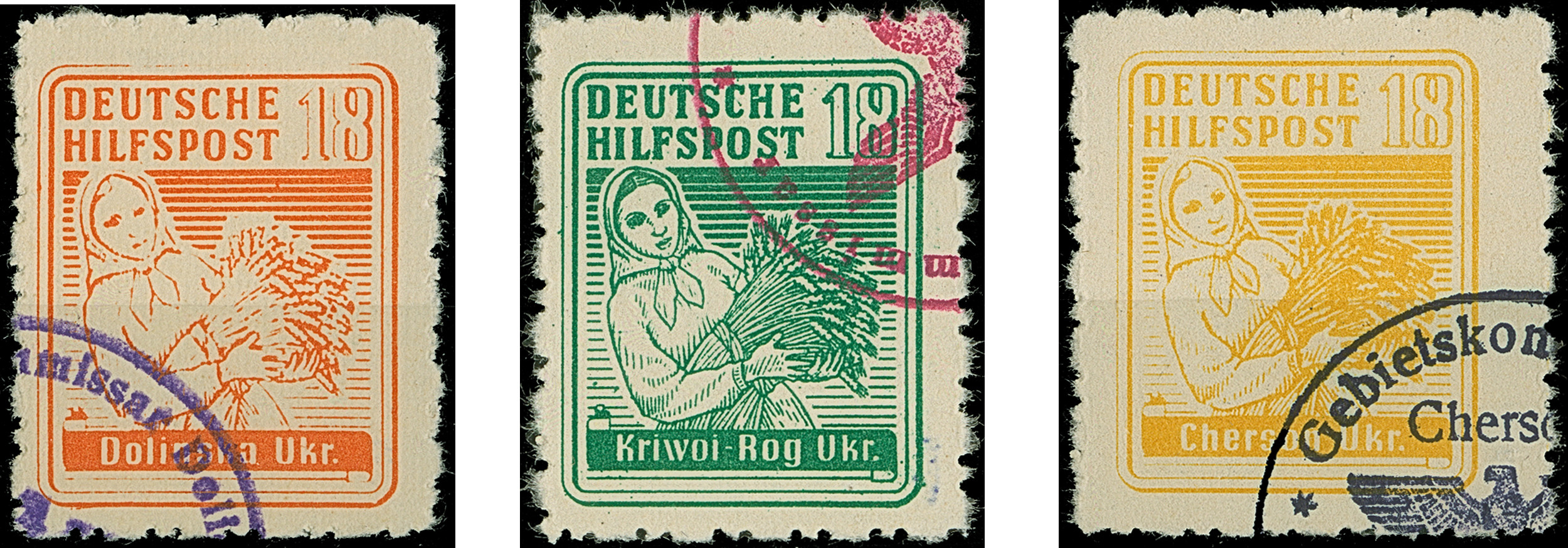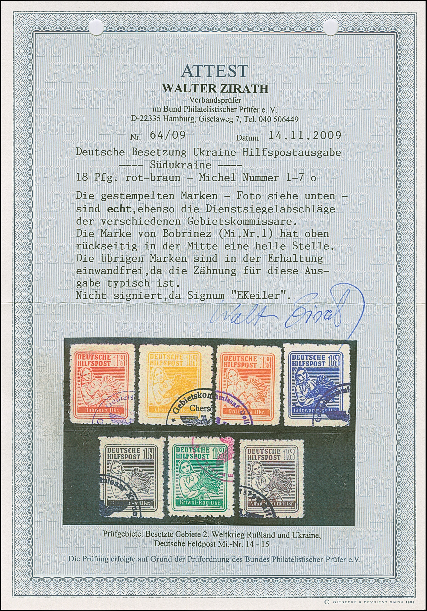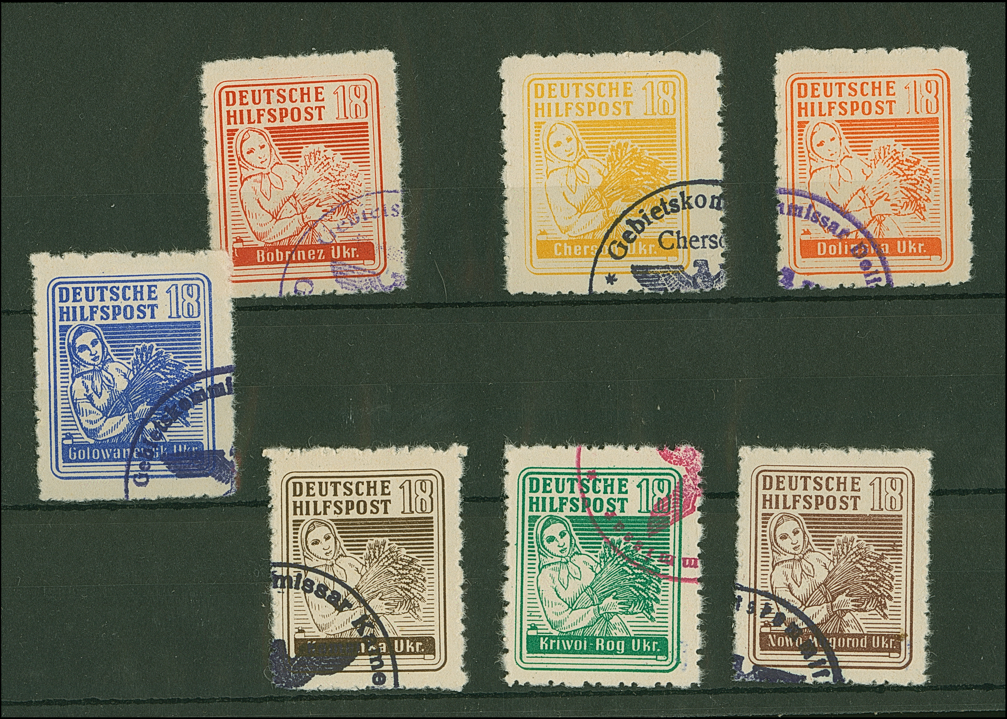SÜDUKRAINE: 1944, Bäuerin 18 Pfennig, 7 Werte, je farbfrisch und gut gezähnt, sauber gestempelt, Bobrinez 18 Pfennig kleine dünne Stelle, sonst tadellos, sehr selten, sign. EKeiler sowie Fotoattest Zirath BPP (2009)