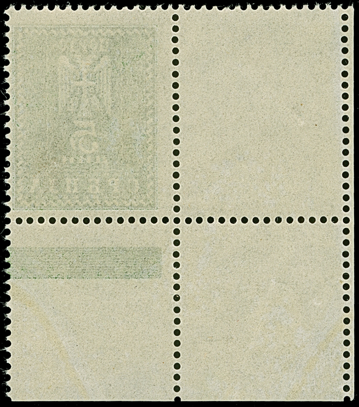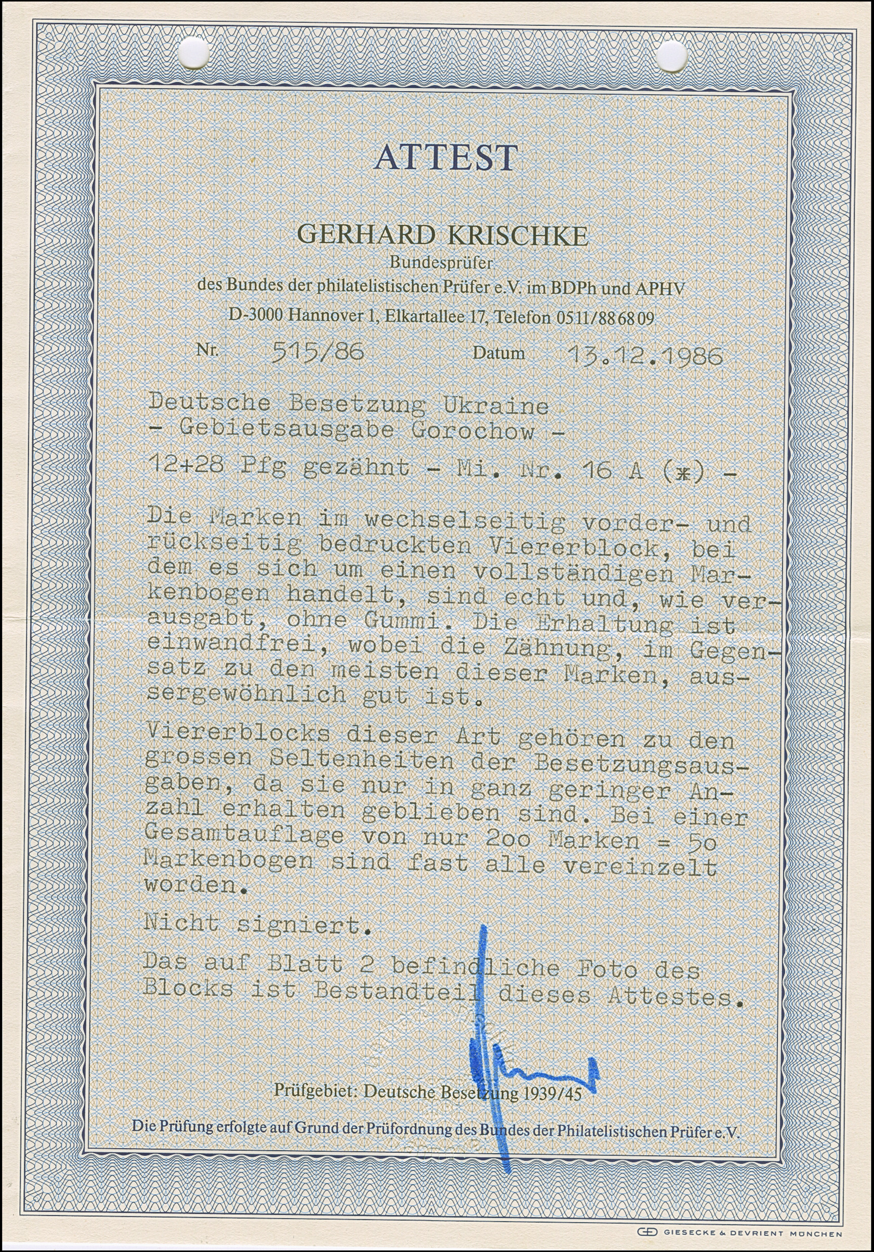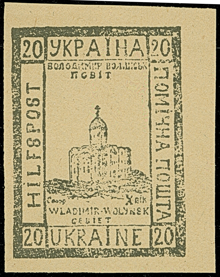 1. AUSGABE: Bahnhof 85 Gr. auf blassgrün auf großformatigem Papier (72x131MM) sogen. “Ministerblocks”, mit Siegel von Cholm und hektographierter Unterschrift von Kapitän S. Shramchenko, tadellos