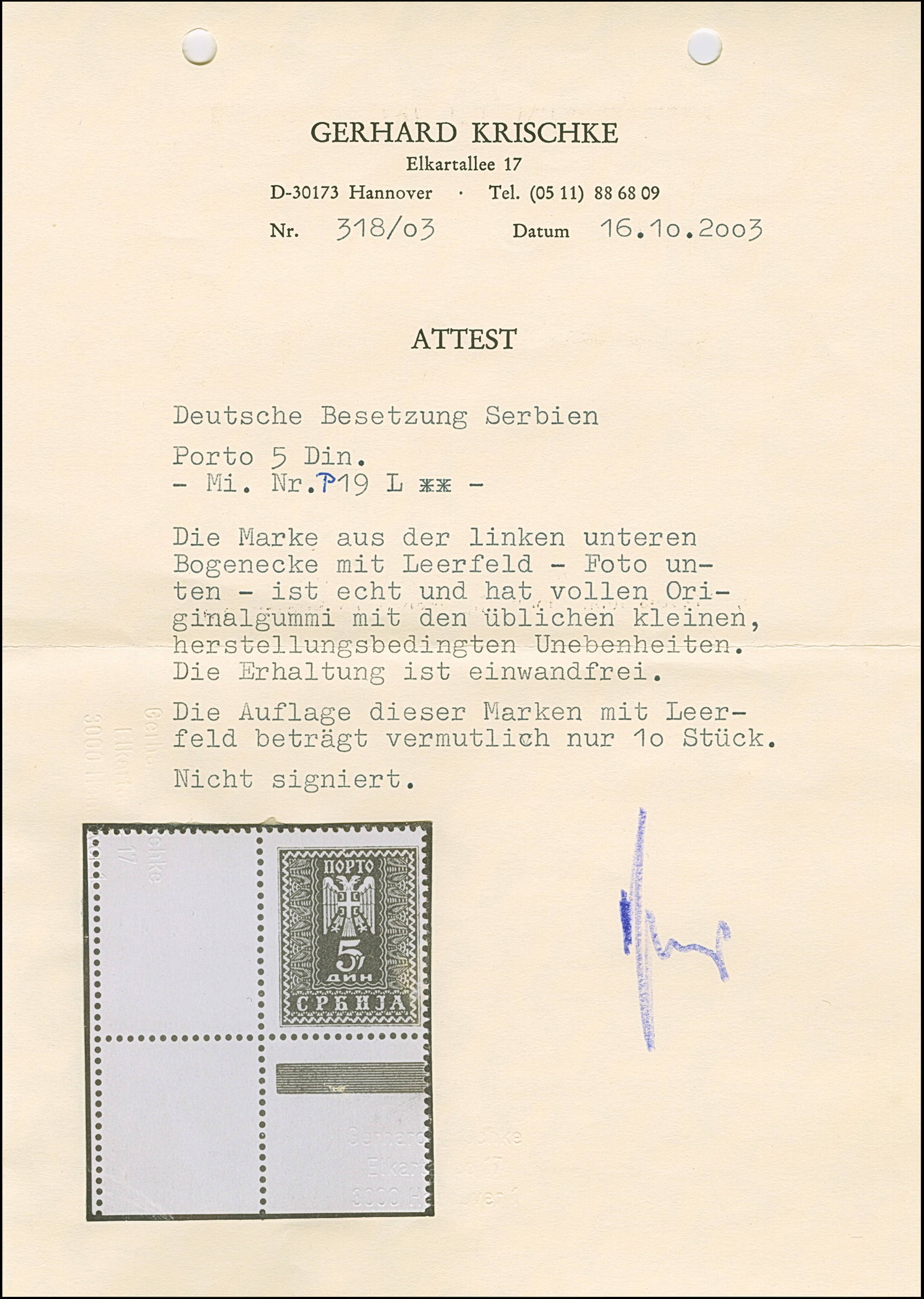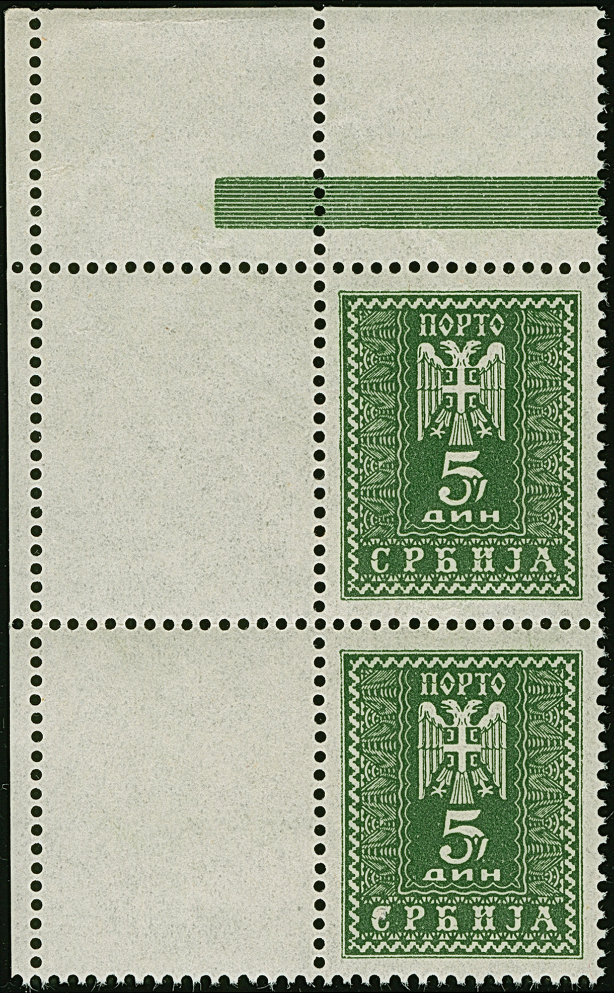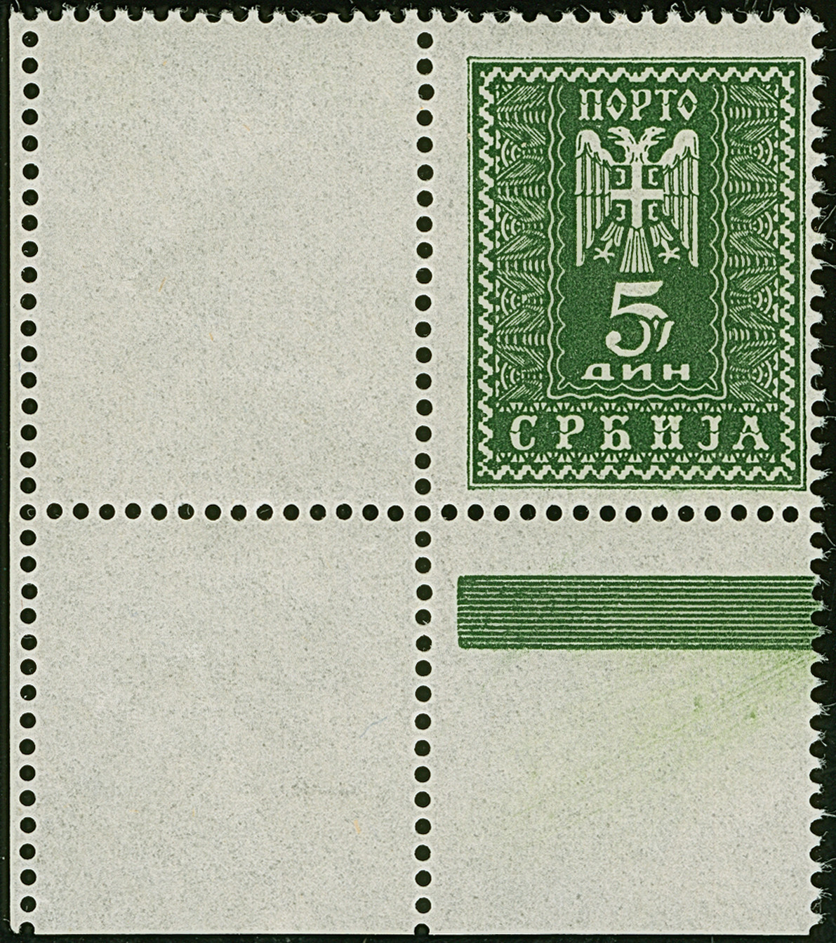 1942, Serbischer Doppeladler 5 Dinar schwarzgelblichgrün, aus der linken unteren Bogenecke mit vollständig gezähnten Leerfeld in Markengröße, postfrisch, tadellos, sehr selten, Auflage nur 10 Stück, unsigniert mit Fotoattest Krischke (2003)