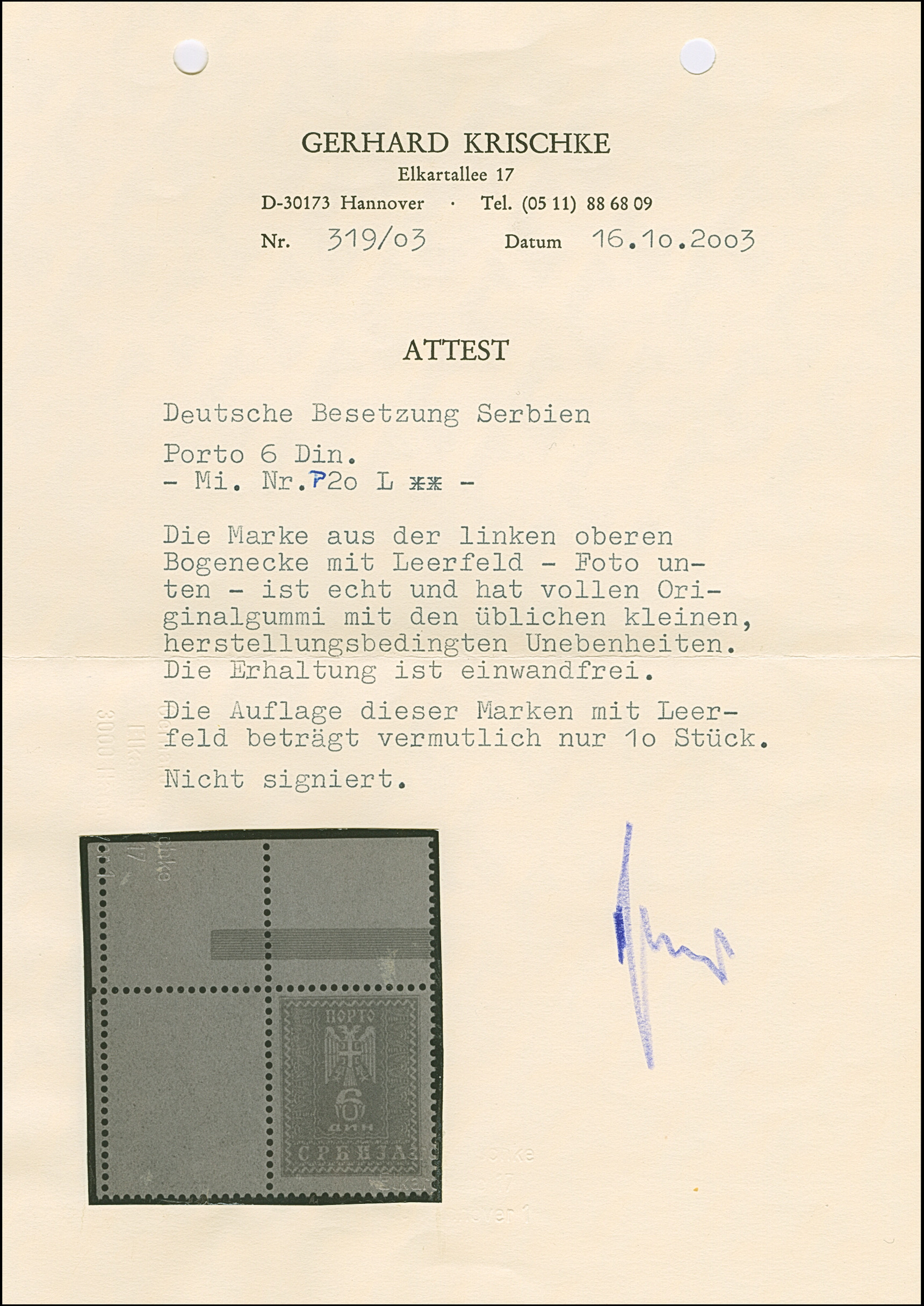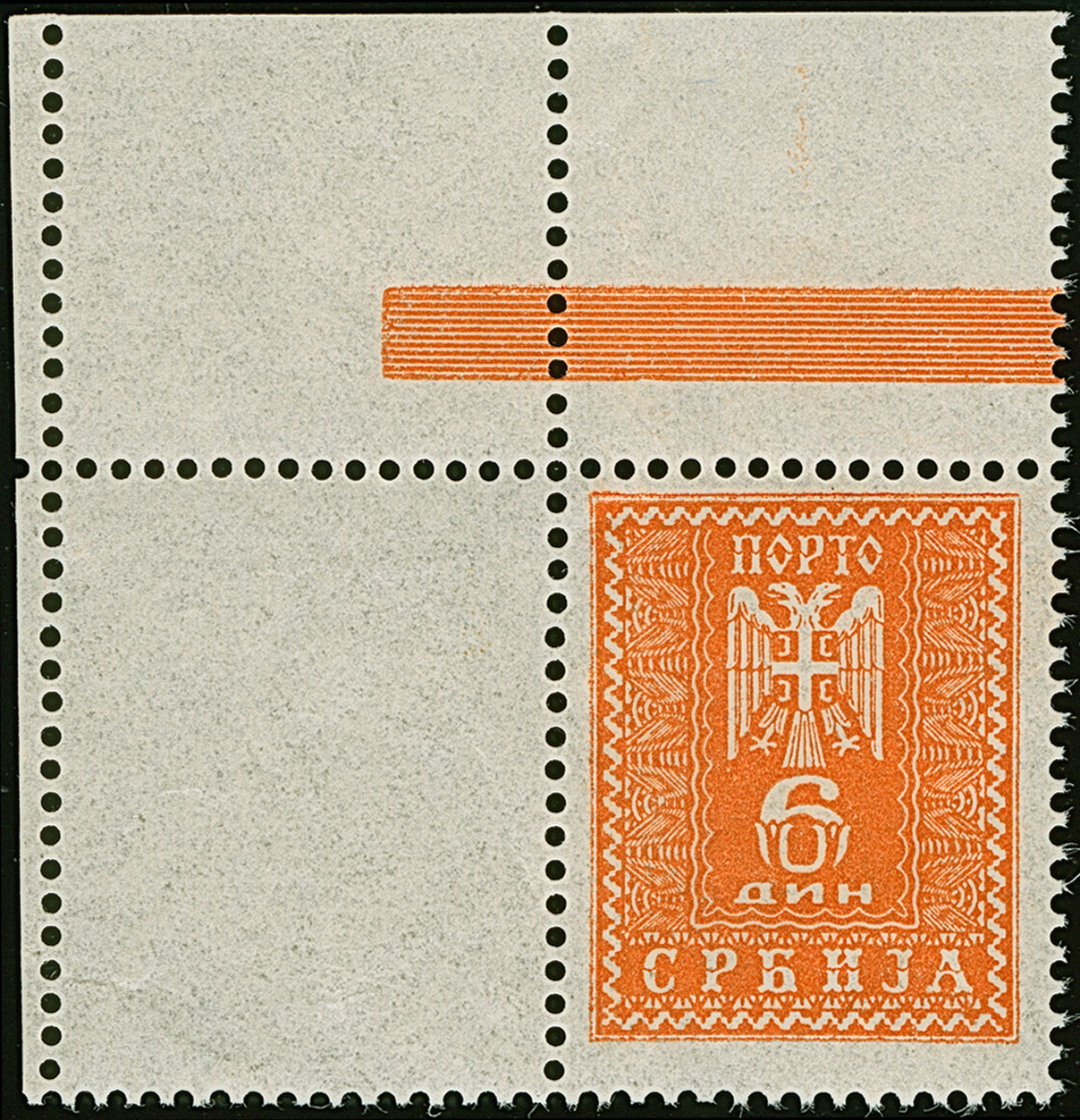 1942, Serbischer Doppeladler 6 Dinar dunkelrötlichoranyge, aus der linken oberen Bogenecke mit vollständig gezähnten Leerfeld in Markengröße, postfrisch, tadellos, sehr selten, Auflage nur 10 Stück, unsigniert mit Fotoattest Krischke (2003)