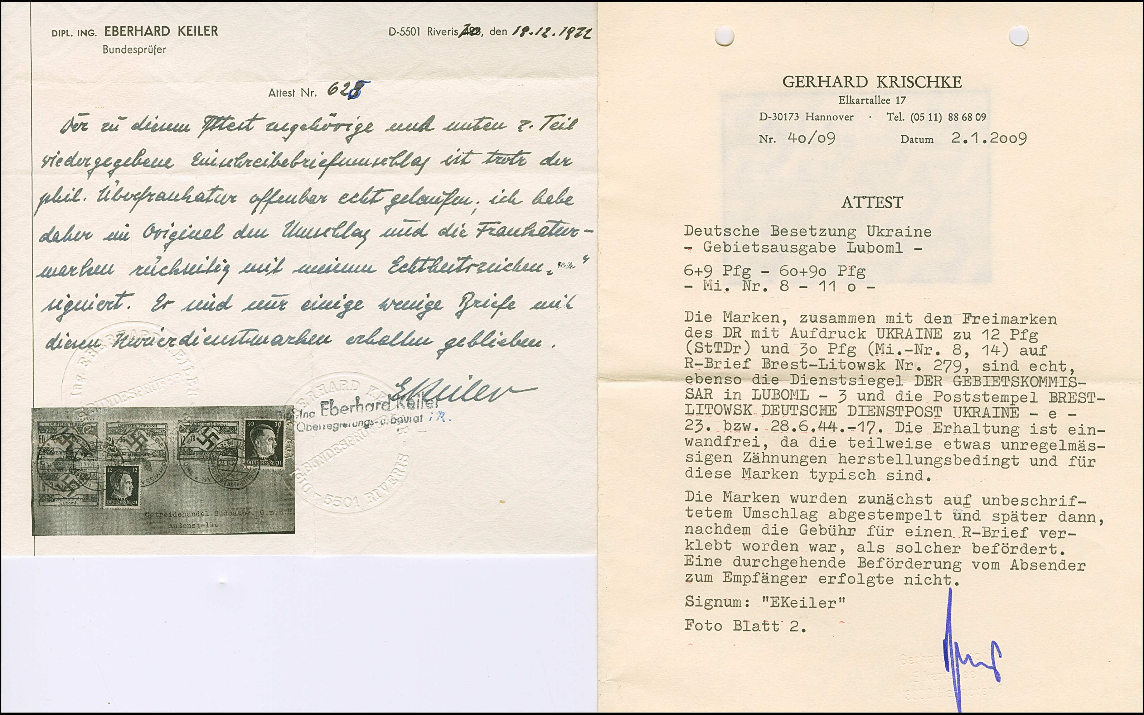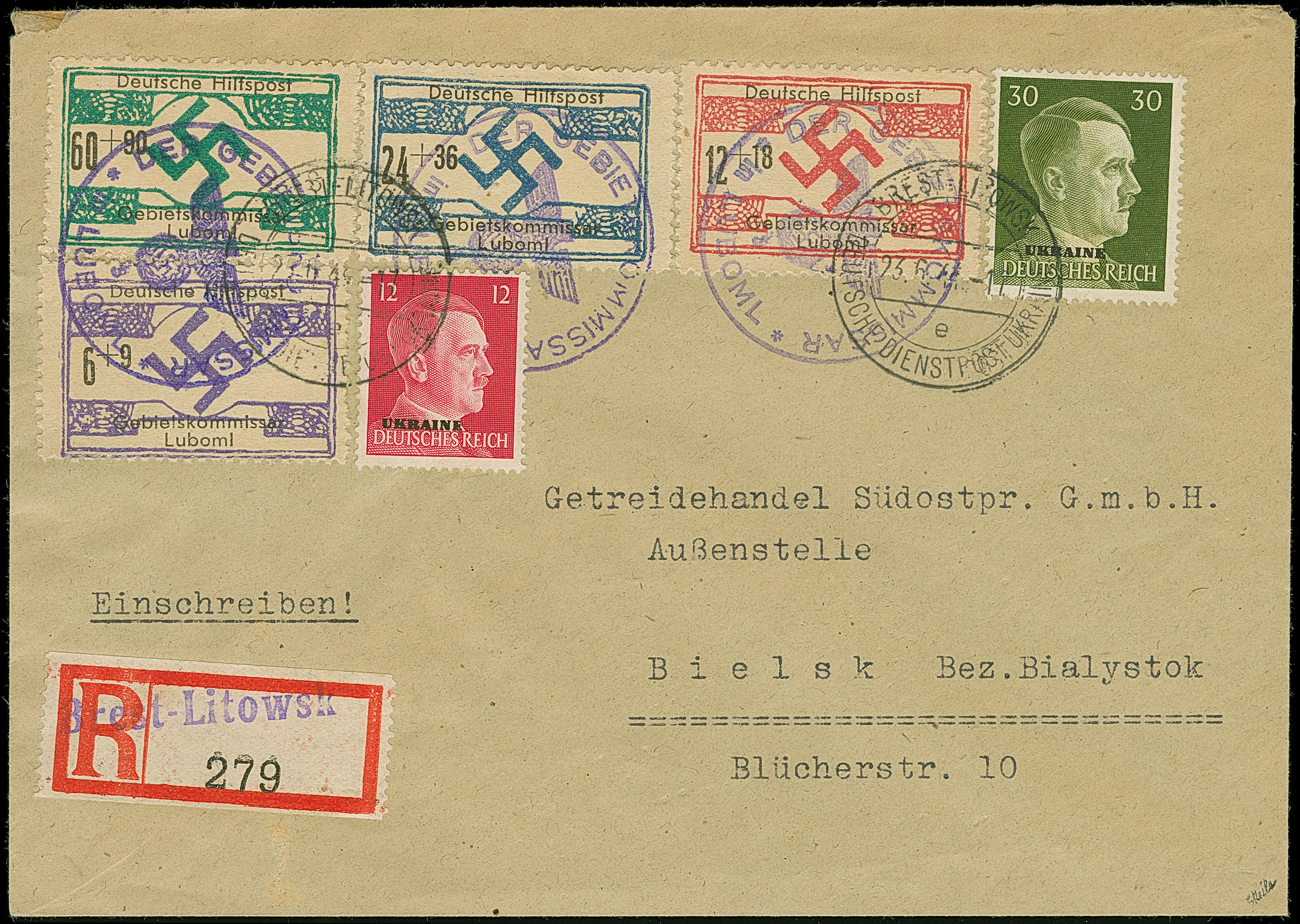 1944, Luboml 6-60 Pfennig mit Dienstsiegelentwertung zusammen mit Ostland Hitler 12 und 30 Pfennig mit Stempel “BREST-LITWOSK 23.6.44” auf R-Brief an den “Getreidehandle Südostpr. Außenstelle Bielsk, Bialystok”. tadellos, sehr selten, sign. EKeiler mit Fotoattest (1972) sowie Fotoattest Krischke (2009)