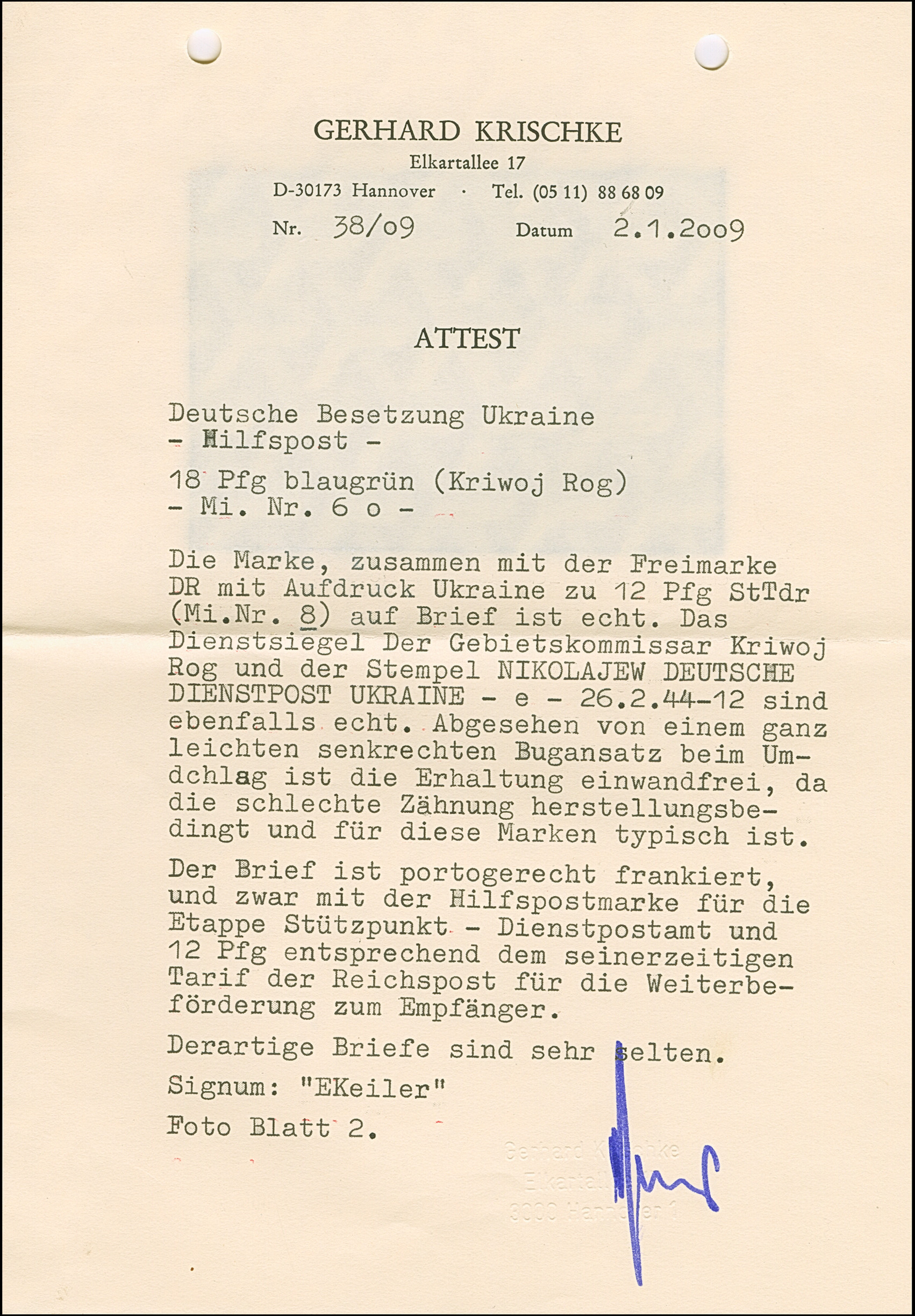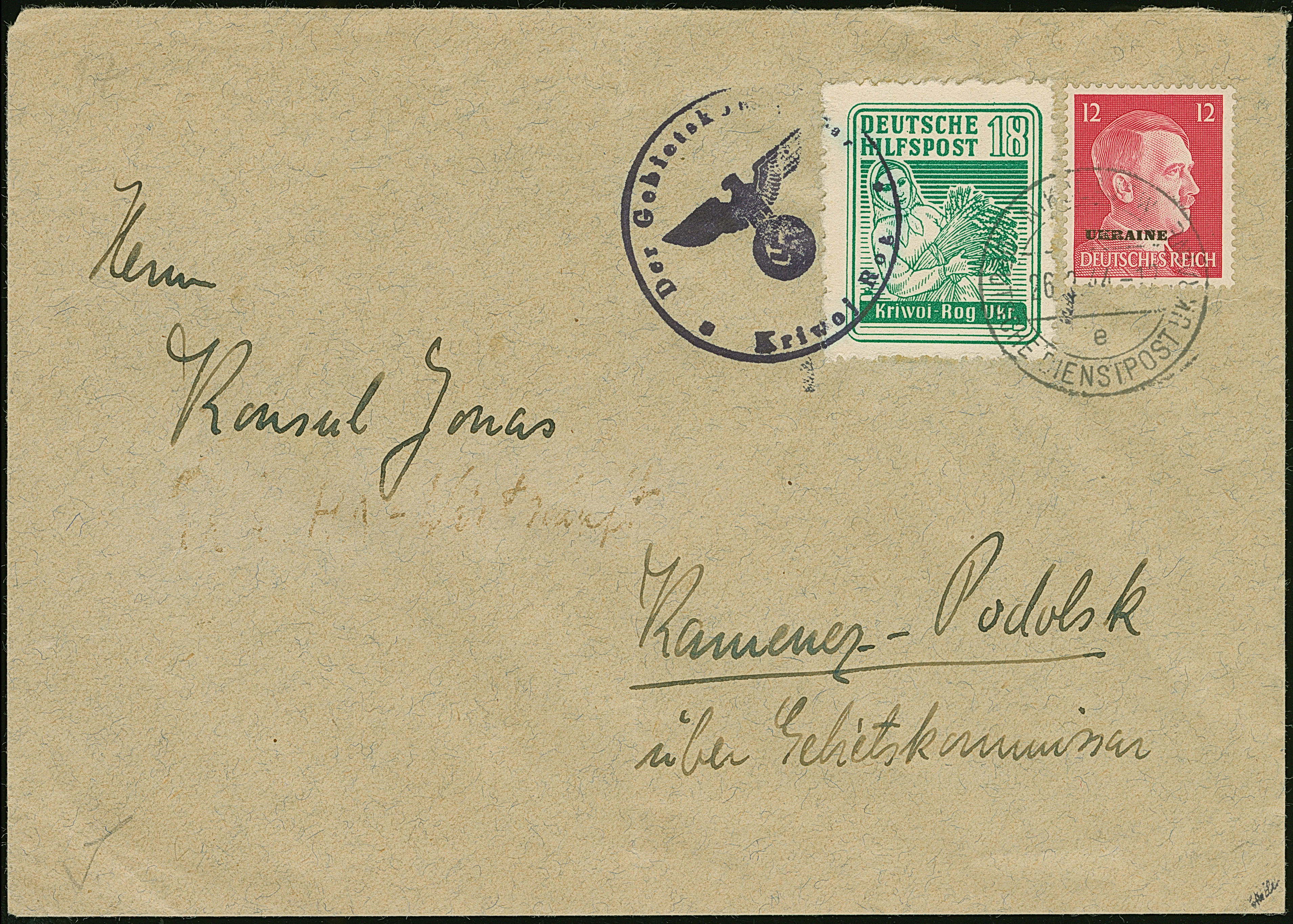 18 Pfennig Kriwoj Rog mit Dienstsiegelentwertung auf echt gelaufenem Brief mit entsprechender Zufrankatur Allgemeine Ausgabe 12 Pfennig mit Stempel "NIKOLAJEW 26.2.44" nach Kamenz-Podolsk, einmal unauffällig senkrecht gefaltet, sonst tadellos, sehr selten, sign. EKeiler und Fotoattest Krischke (2009)
