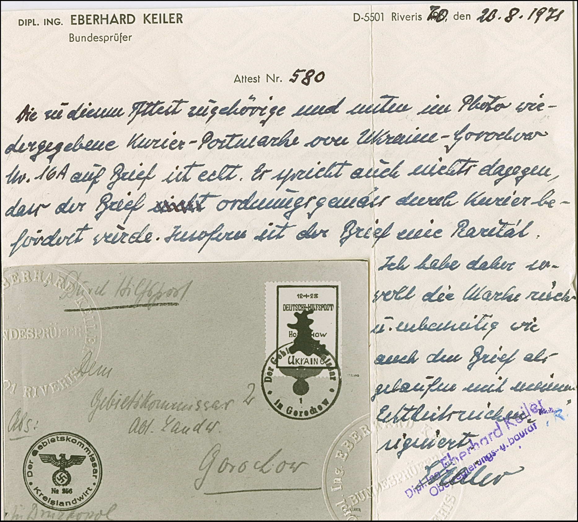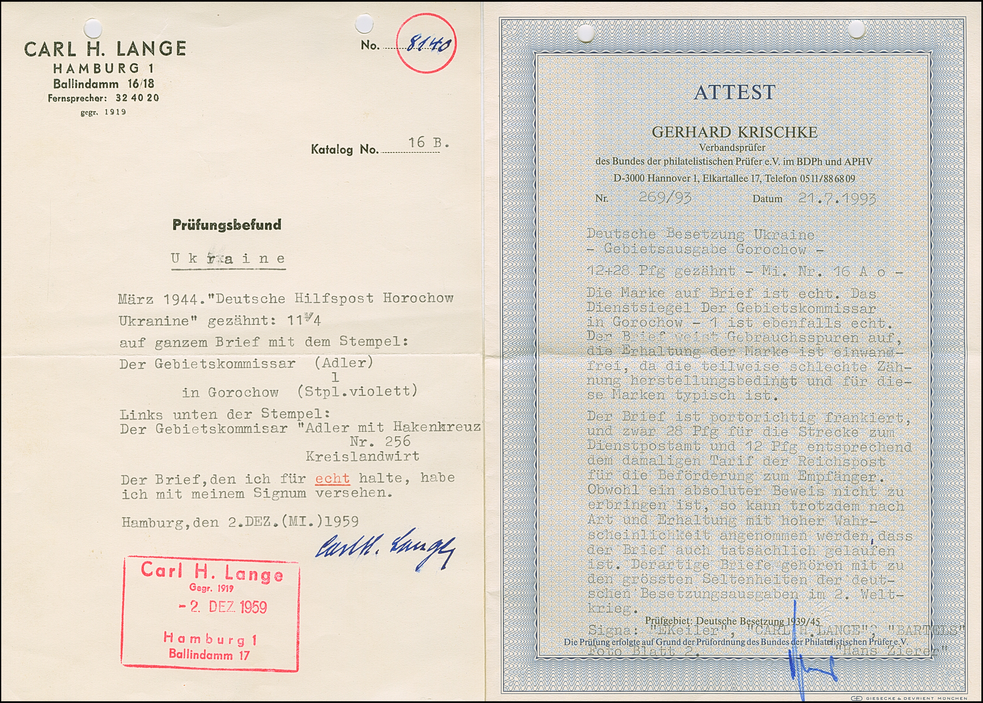 LOKALAUSGABE GOROCHOW: 1944, Freimarke 12+28 Pfennig gezähnt, sauber mit Dienstsiegel "Der Gebietskommissar in Gorochow" auf Ortsbrief mit nebengesetztem Absenderstempel "Der Gebietskommissar. Kreislandwirt No. 256", der Umschlag leichte Beförderungsspuren, sonst tadellos. Diese Ausgabe auf Brief gehört zu den ganz großen Seltenheiten der Besetzungsausgaben, ProFi hat lediglich 5 Briefe mit dieser Marke frankiert registriert, davon nur eine weitere Einzelfrankatur, mehrfach sign. sowie Fotoatteste Keiler (1971) und Krischke BPP (1993)