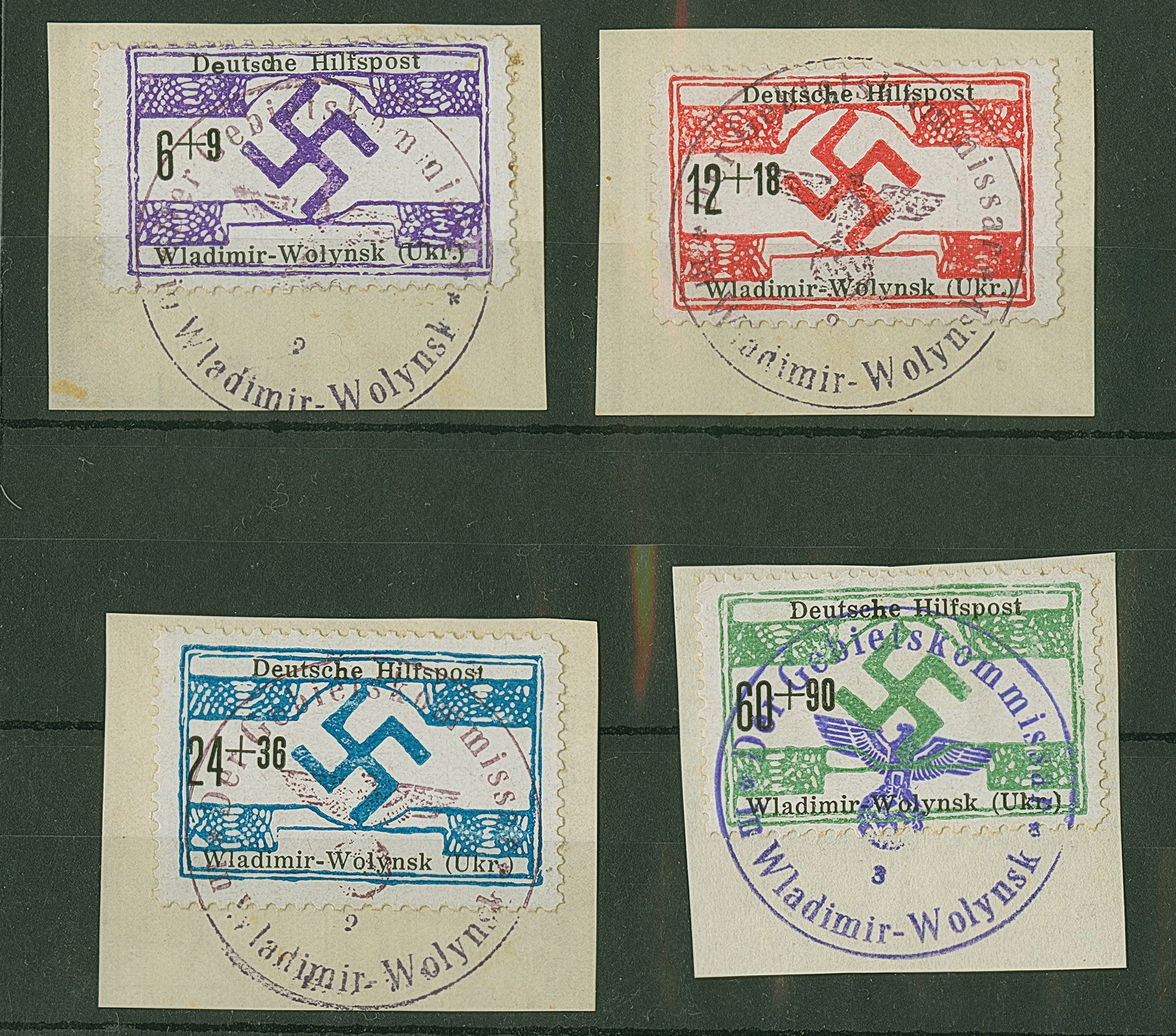 1944, Waldimir-Wolynsk 6-60 Pfennig, 6 Pfennig mit Plattenfehler “kleines s in Deutsche”, je sauber mit Dienstiegel auf Briefstück, tadellos, u.a. sign. Krischke BPP