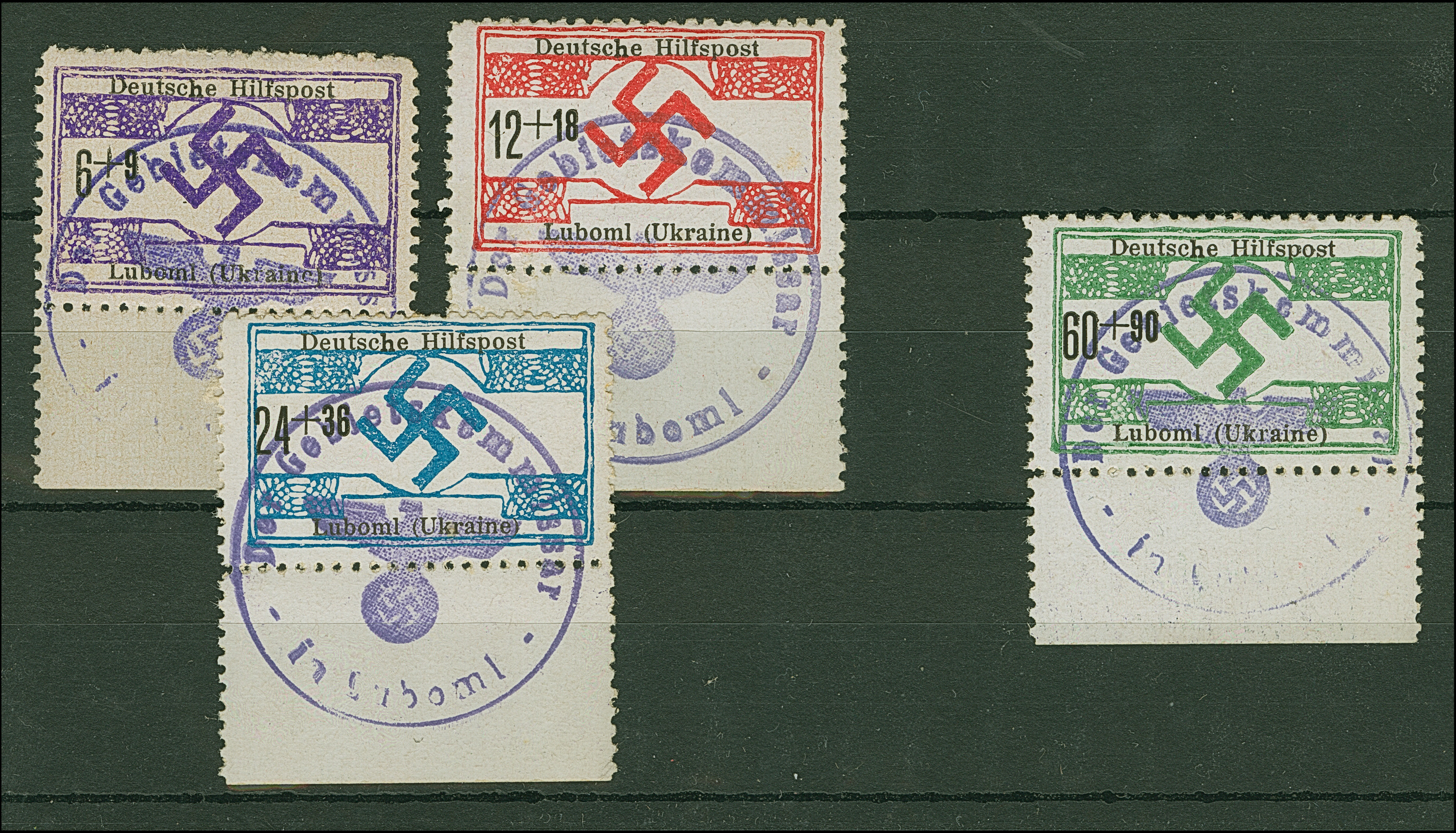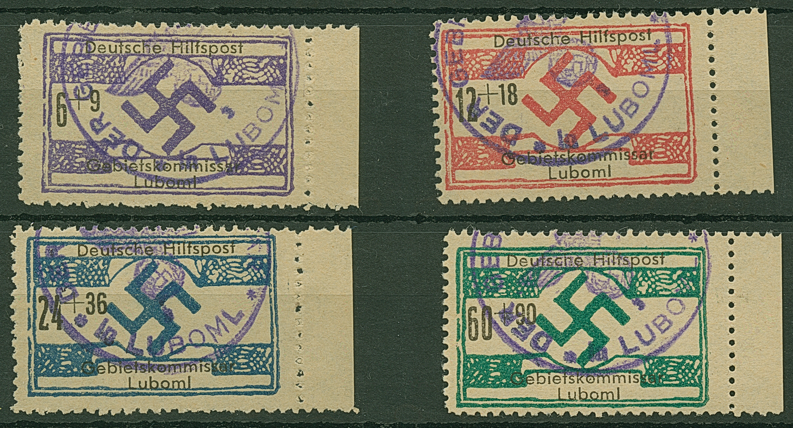 1944, Luboml 6-60 Pfennig, einheitlich als Unterrandstücke, je sauber mit Dienstiegel entwertet, tadellos, sign. Zirath BPP