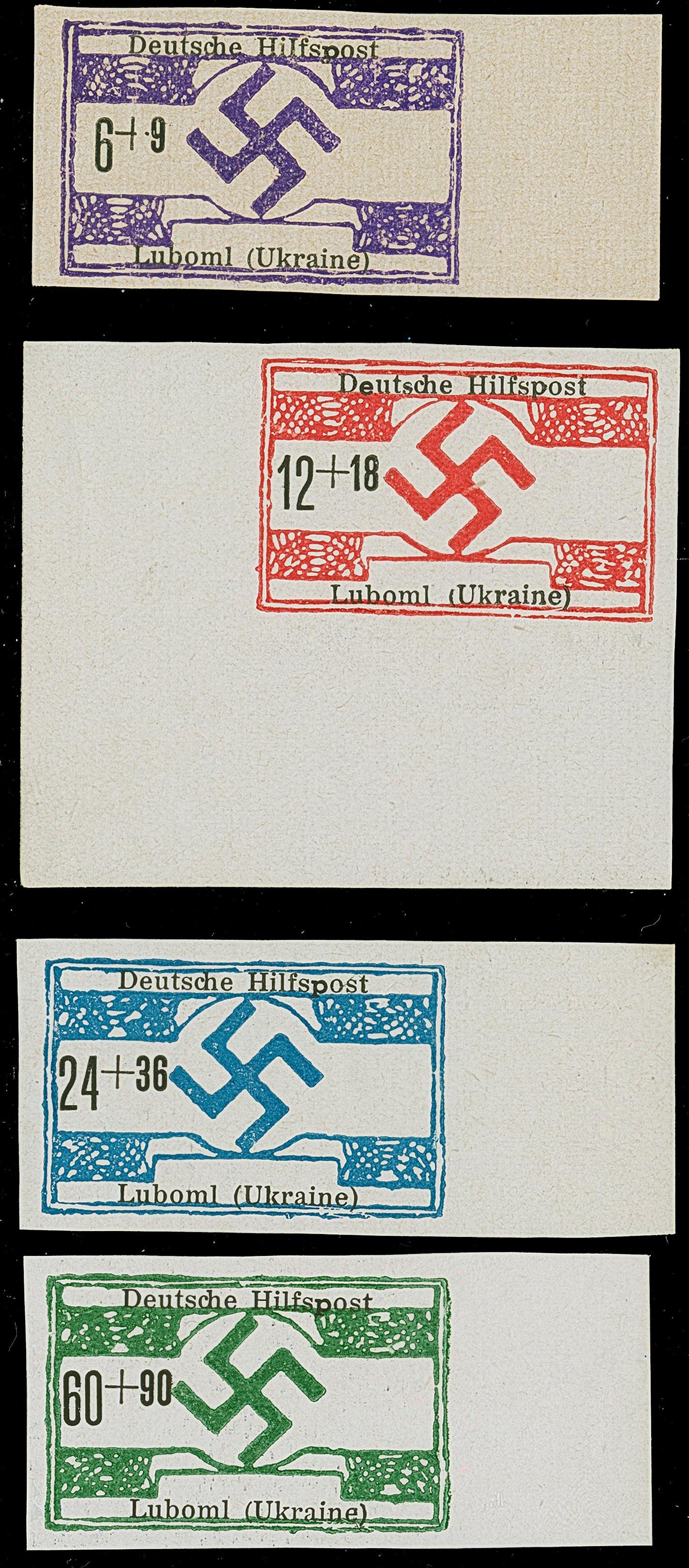 1944, Luboml 6-60 Pfennig ungezähnt, durchweg Randstücke, die 12 Pfennig aus der linken unteren Bogenecke, postfrisch, tadellos, selten, sign. Keiler BPP