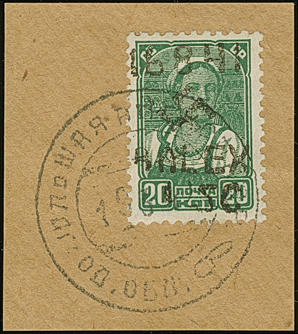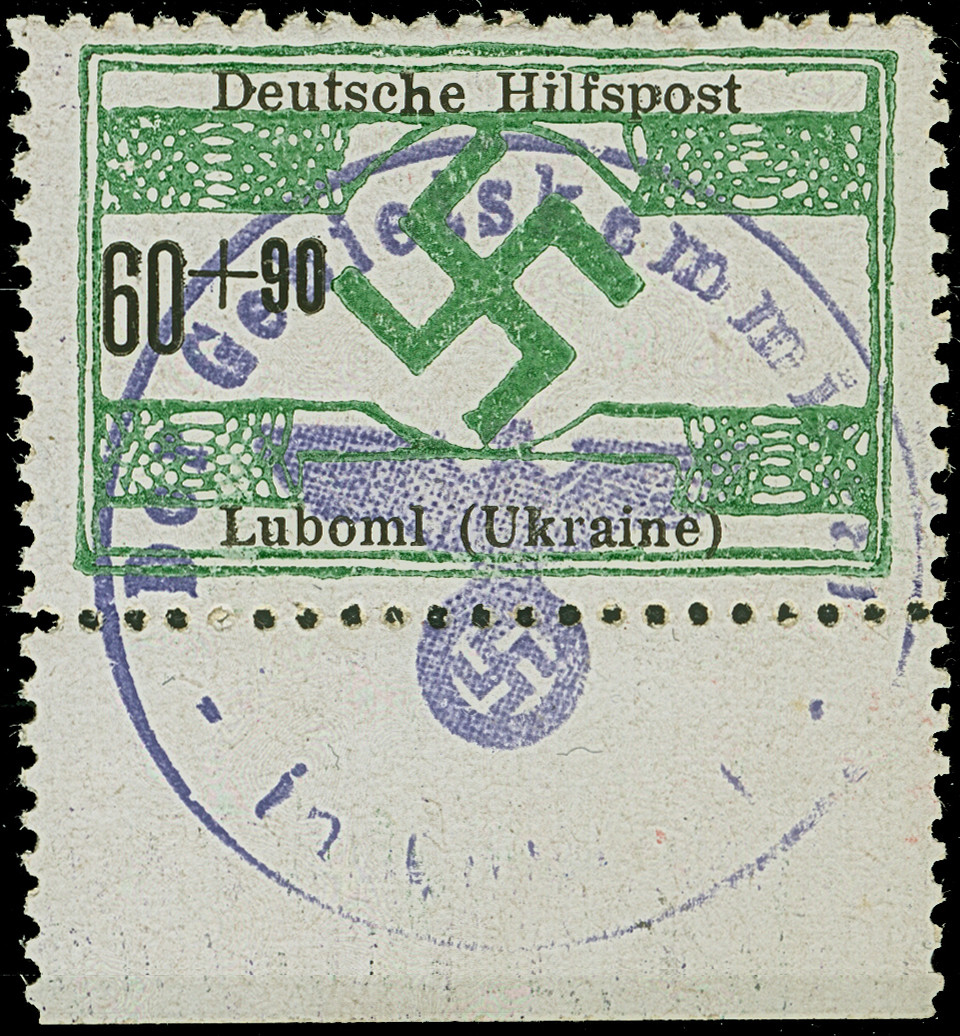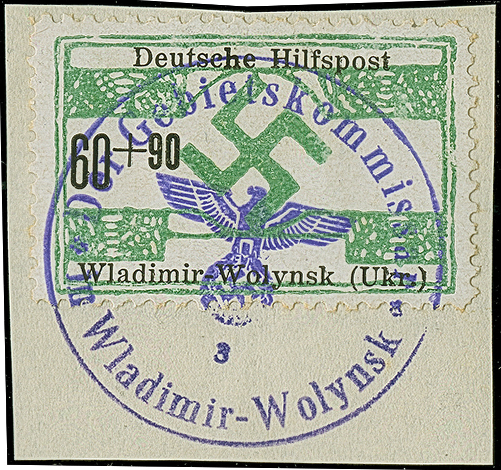 1942, Aufdrucktype II, Hakenkreuz 6mm: 1,50 Rubel auf 20 Kopeken schwarzgelbgrün, farbfrisch und gut gezähnt, sauber mit kyrillischem Stempel “ALEXANDERSTADT 19 3 42” auf Briefstück, tadellos. Eine sehr seltene Marke, sign. Keiler sowie Fotoattest Zirath BPP (2008)