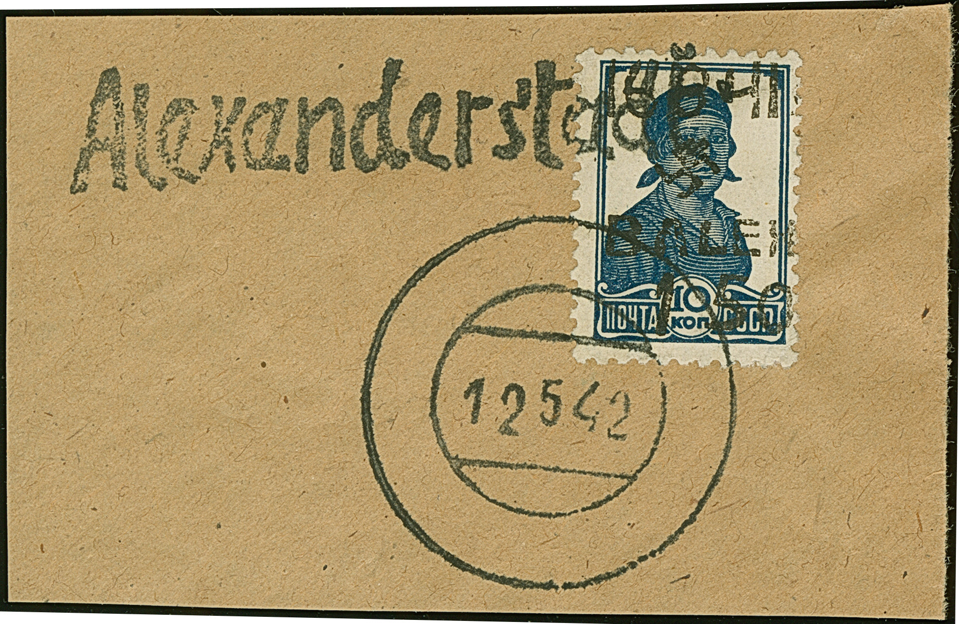 1942, Aufdrucktype III Hakenkreuz 4mm: 1,50 Rubel auf 10 Kopeken dunkelpreußischblau, farbfrisch und üblich gezähnt, sauber mit L1 “Alexanderstadt” und stummem Stempel “12 5 42” auf Briefstück, tadellos, eine seltene Marke, sign. Zirath BPP