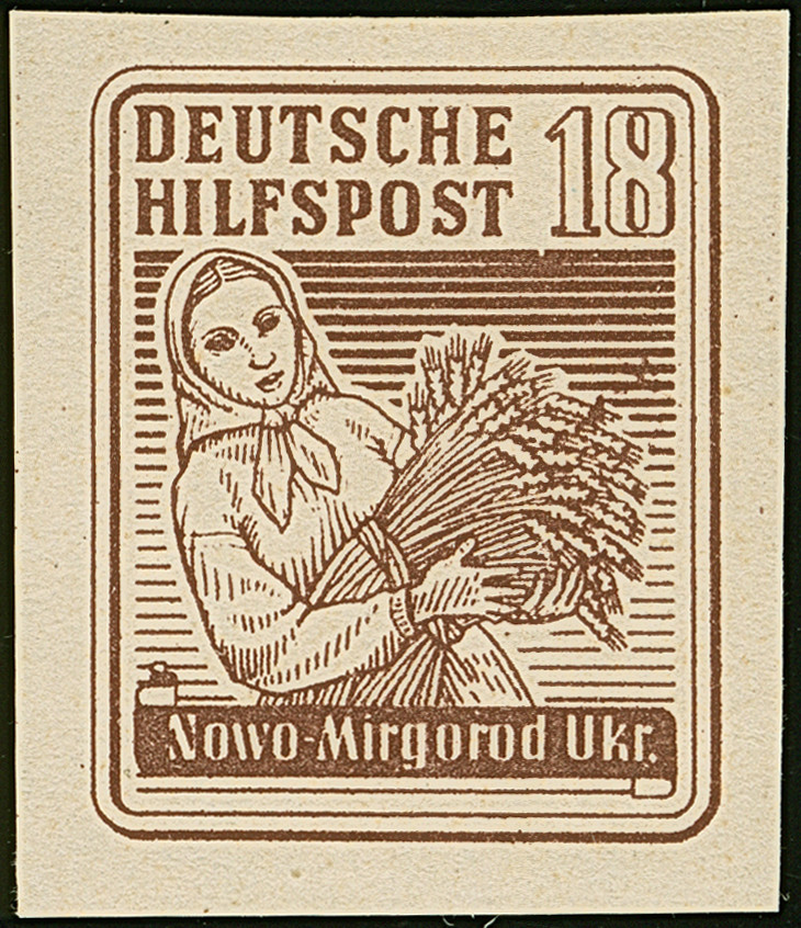 SÜDUKRAINE: 1944, Nowo Mirgorod 18 Pfennig dunkelrotbraun, breitrandig ungezähnt, ohne Gummi wie verausgabt, tadellos, sehr selten, Auflage nur 42 Stück, sign. EKeiler sowie Fotoattest Krischke BPP (1998)