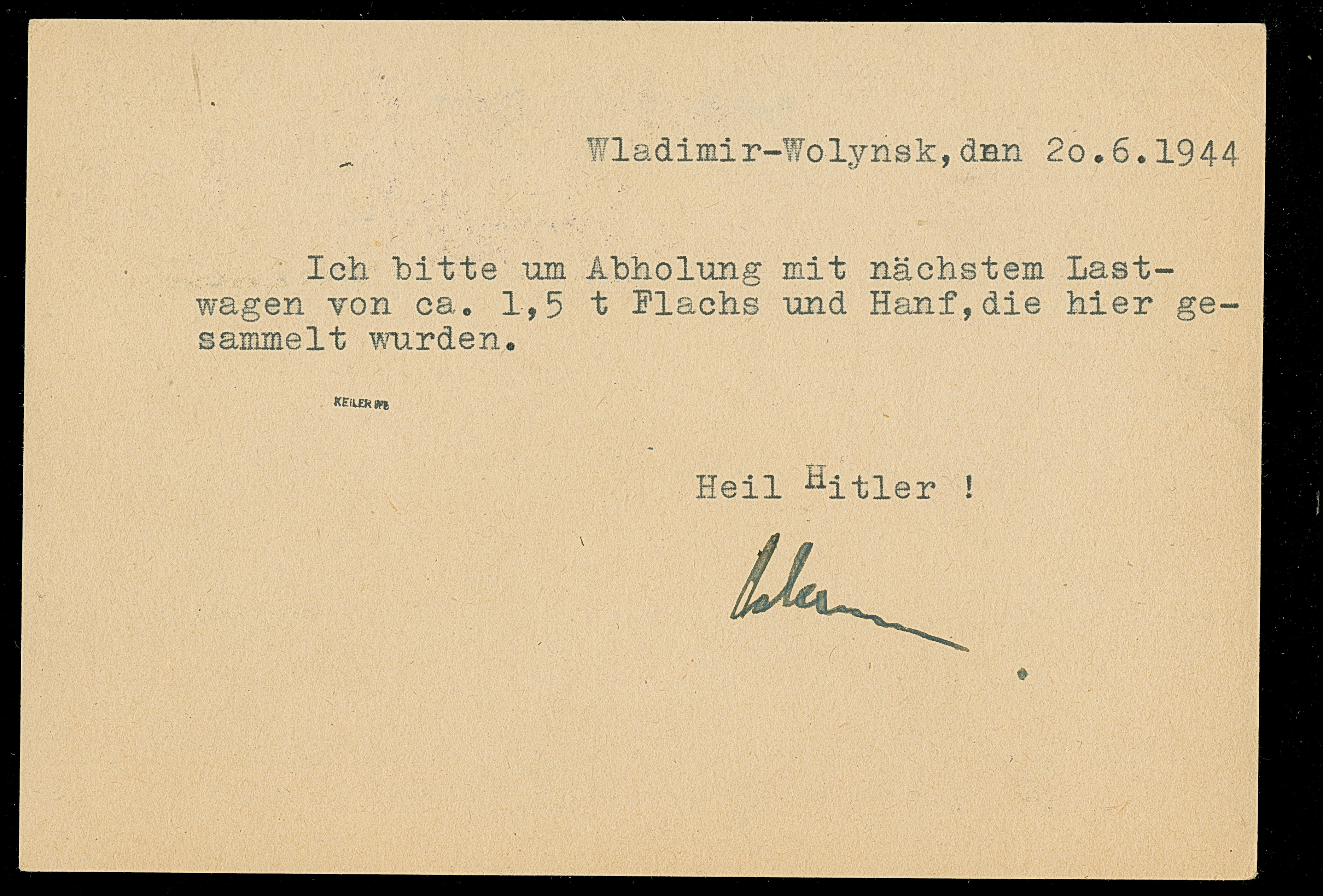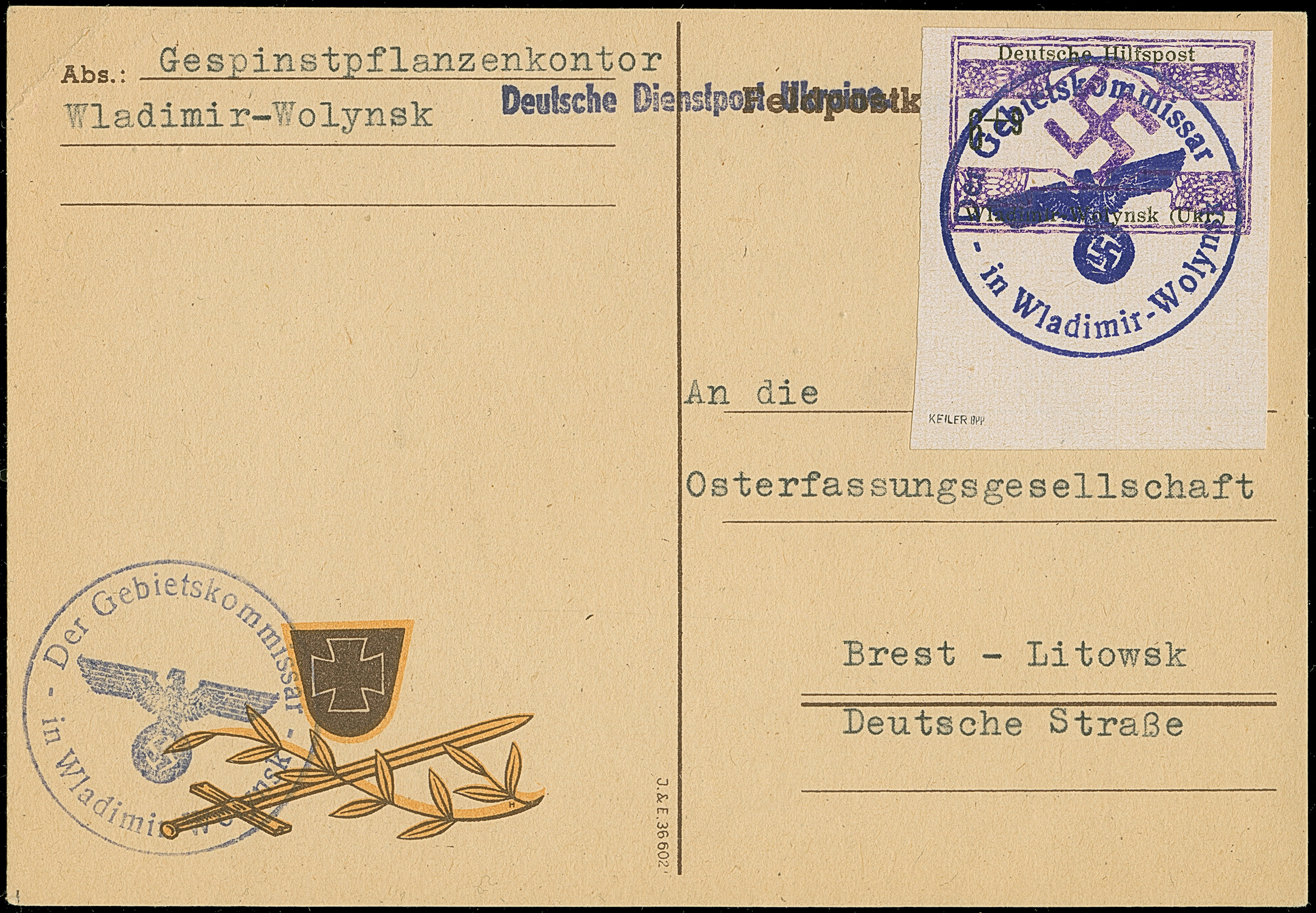 1944, Wladimir-Wolynsk 6 Pfennig, Unterrandstück, breitrandig ungezähnt mit Dienstiegel-Entwertung auf nach Brest-Litowsk adressierter Karte, tadellos, sign. Keiler BPP