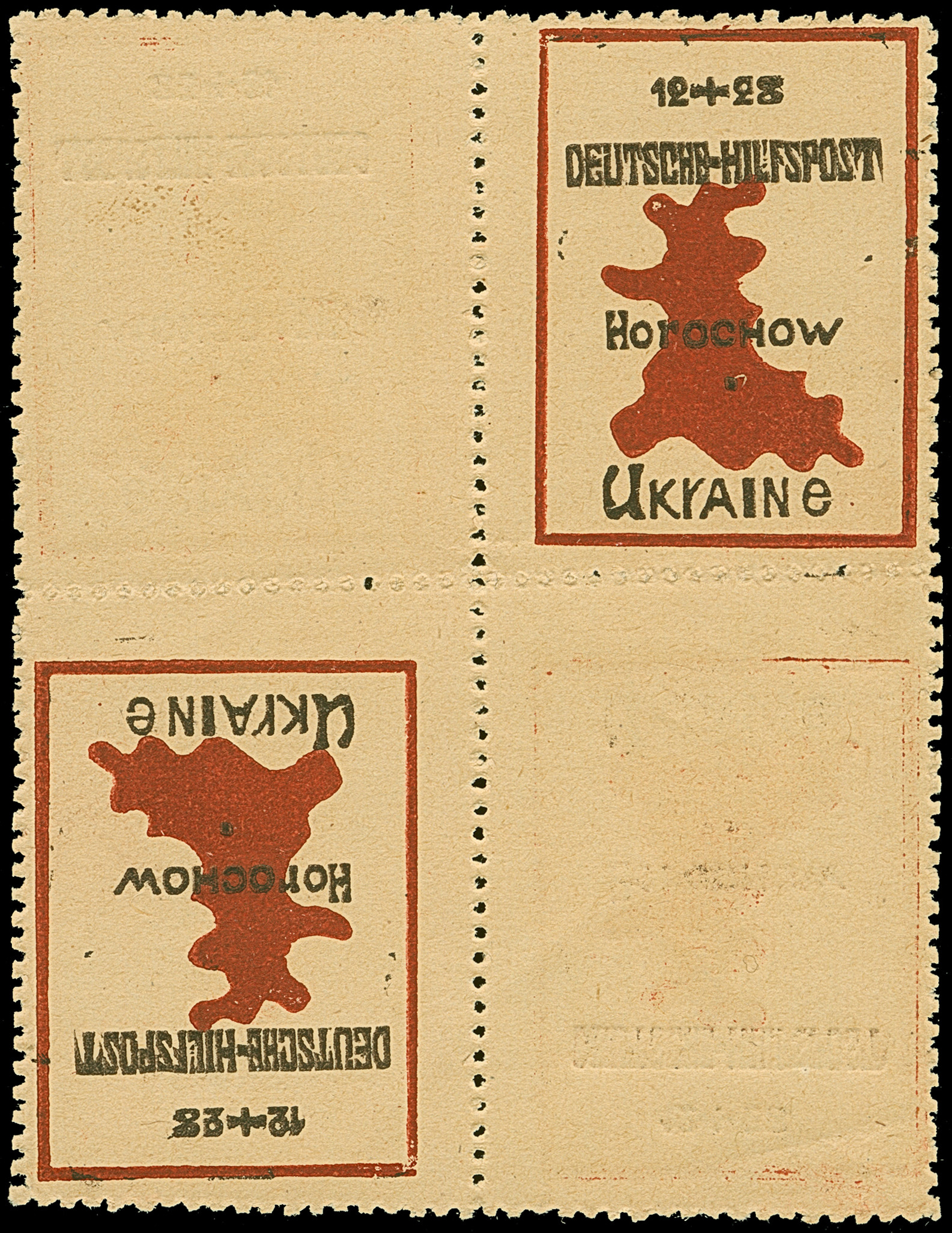 NORDUKRAINE: Gorochow Landkarte 12+28 Pfennig braunrot/schwarz, kompletter Kleinbogen zu vier Werten, bestehend aus zwei vorder- und rückseitig bedruckten Kehrdruckpaaren, ohne Gummi wie verausgabt, außer einer Marke mit winziger Druckspur, tadellos. Eine der ganz großen Seltenheiten, bei einer Gesamtauflage von 192 Einzelmarken sind nur noch wenige Druckbogen erhalten, unsigniert mit Fotoattest Krischke BPP (1986)