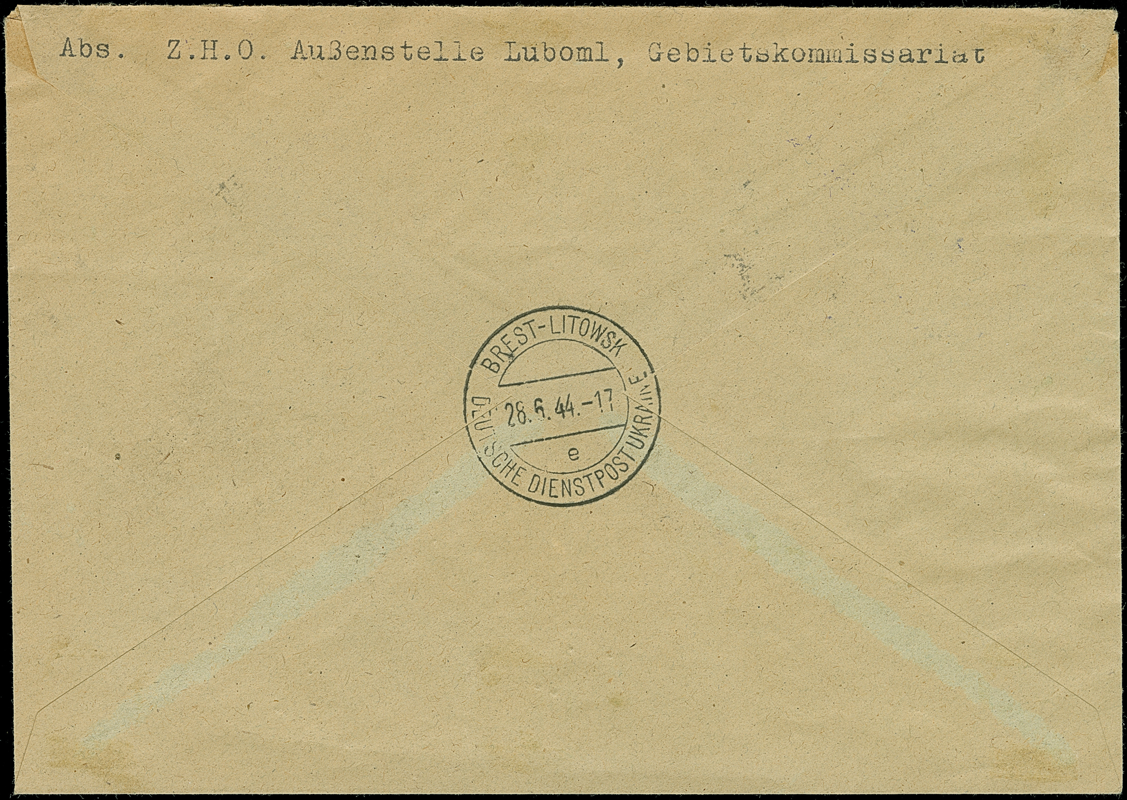 1944, Gorochow 6-60 Pfennig mit Dienstsiegelentwertung zusammen mit Ostland Hitler 12 und 30 Pfennig mit Stempel “BREST-LITWOSK 20.6.44” auf R-Brief Berlin-Charlottenburg mit Ankunftsstempel. Der Umschlag rechts etwas getönt, die 6 Pfennig und Hitler 30 Pfennig mit kleinen Einschränkungen, kleiner Teil der Rückklappe fehlend, sonst tadellos, ein sehr seltener Brief
