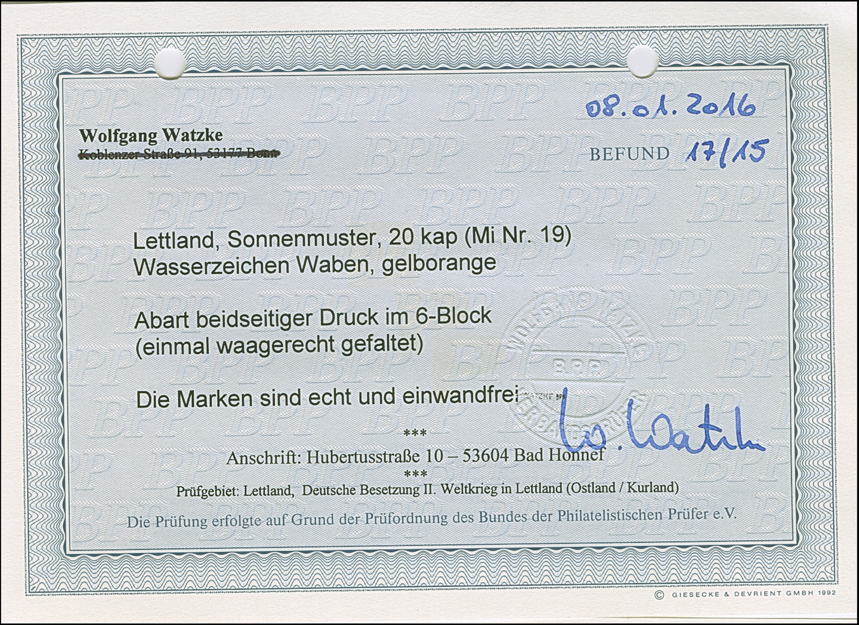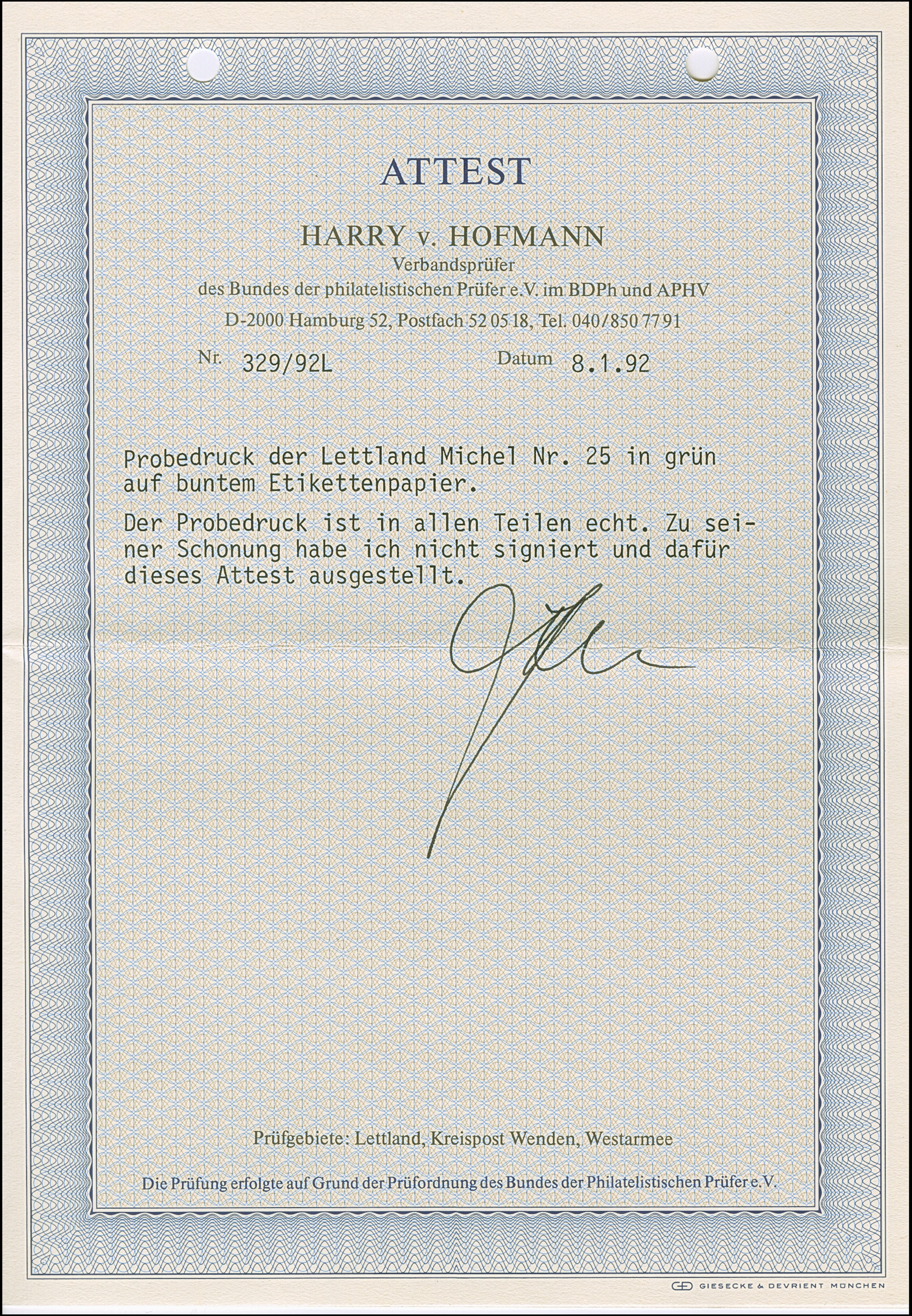 1919, Liberation of Riga 5 and 15 kopeks green, on multicolored resp. red label paper, without gum, in addition 15 kopek on multivolored paper, used, fine, certificate v. Hofmann BPP (1992; for unused multiclored)