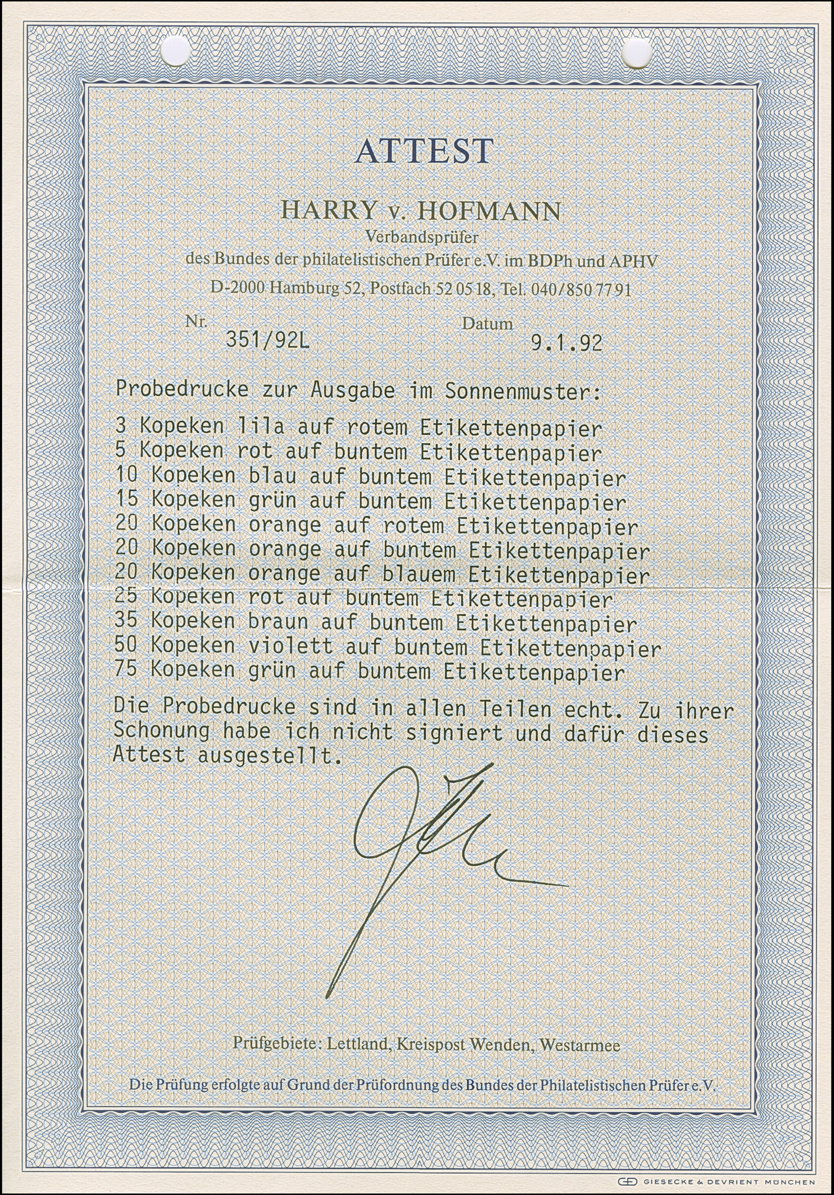 1919, Ear of corn 3-75 kopeks, in issued colors on multicolored label paper, 20 k. in addition on blue and red label paper, without gum, fine, certificiate v. Hofmann BPP (1992)