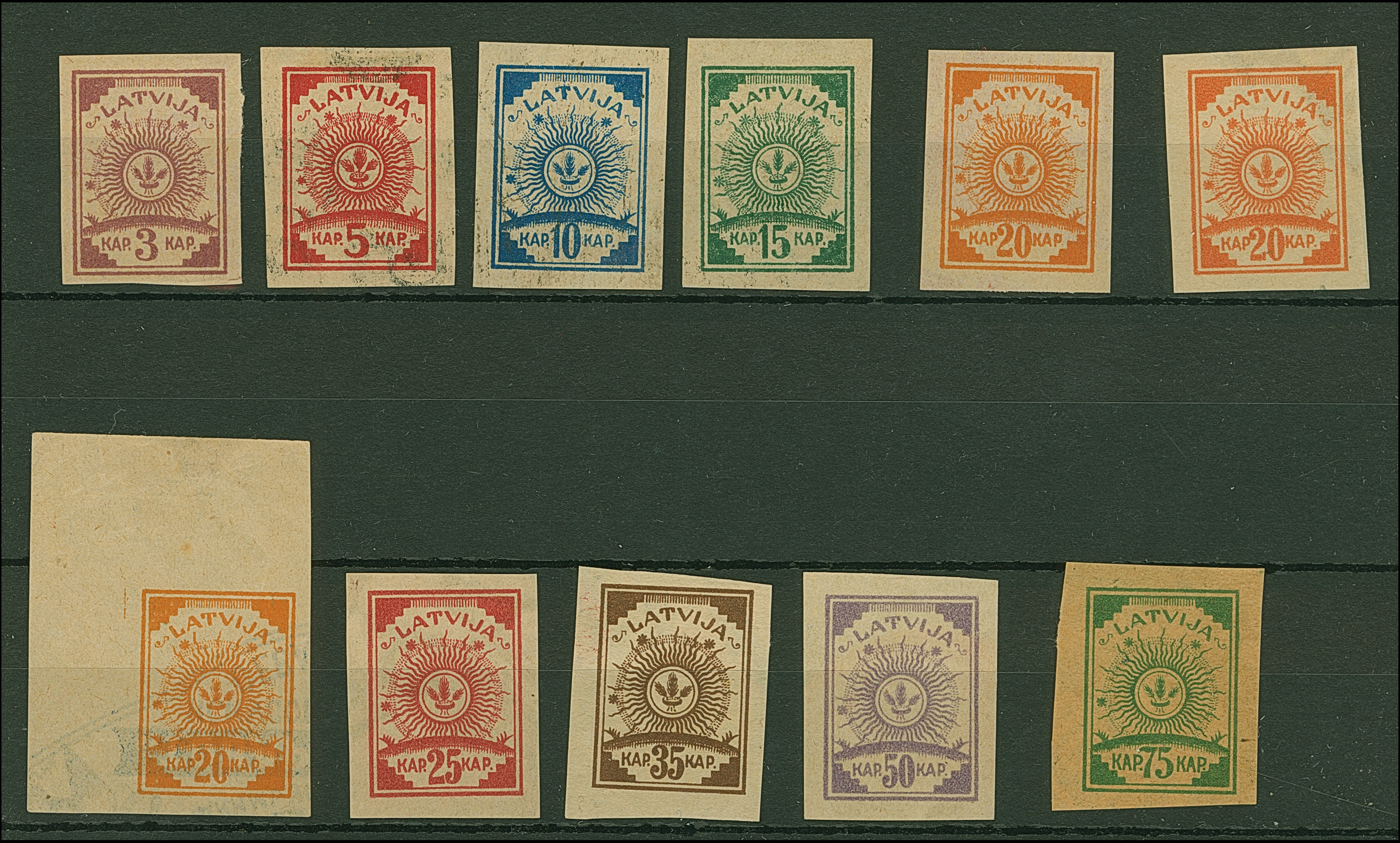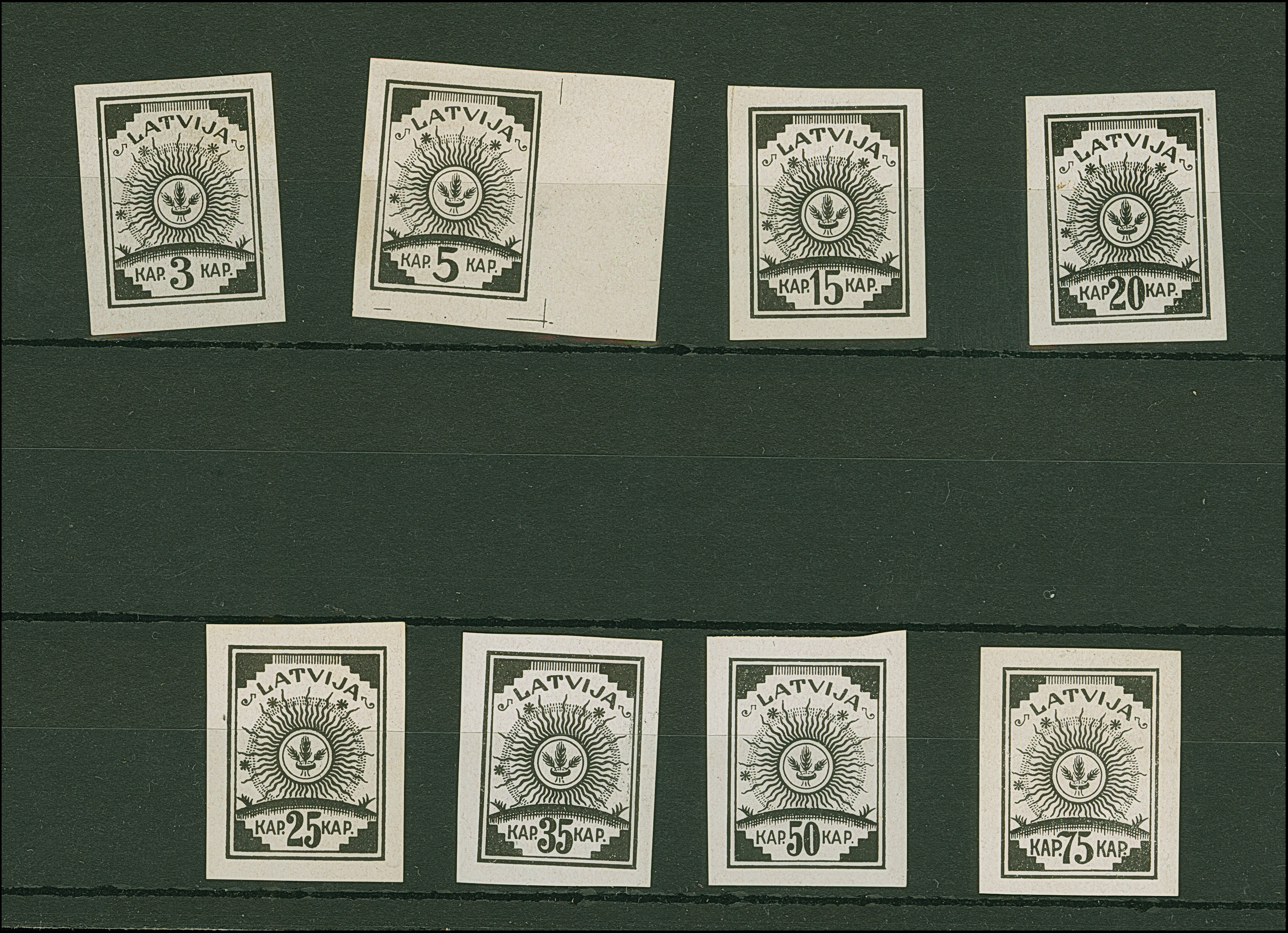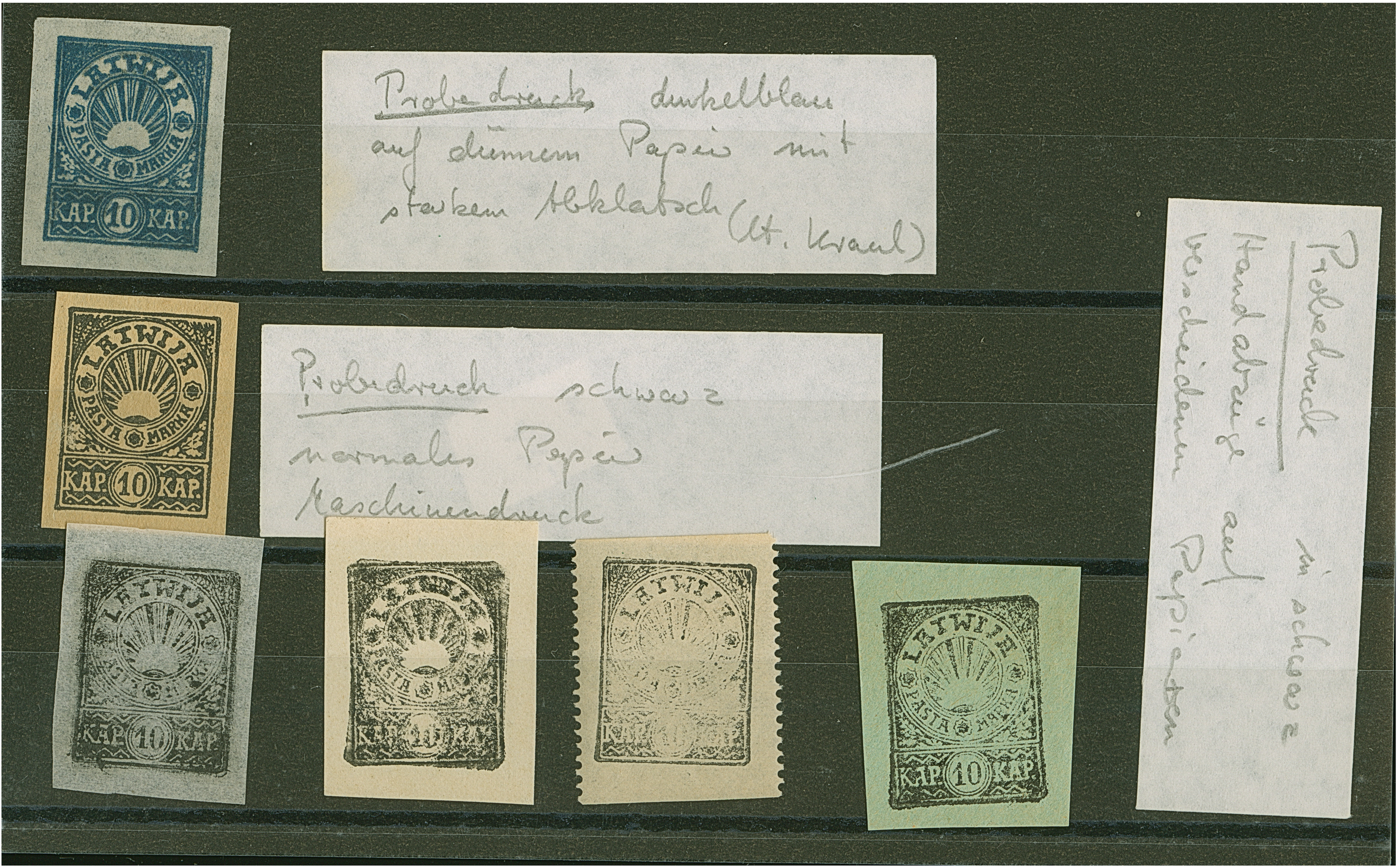 1919, Issue for North-Latvia 10 kopek, six proofs, dark-blue on thin paper, black on thin and thick paper imperforated, on thick paper perforated on two sides, black on ordinary paper and on green paper, unused without gum, the one on ordinary paper small surface rub, otherwise fine