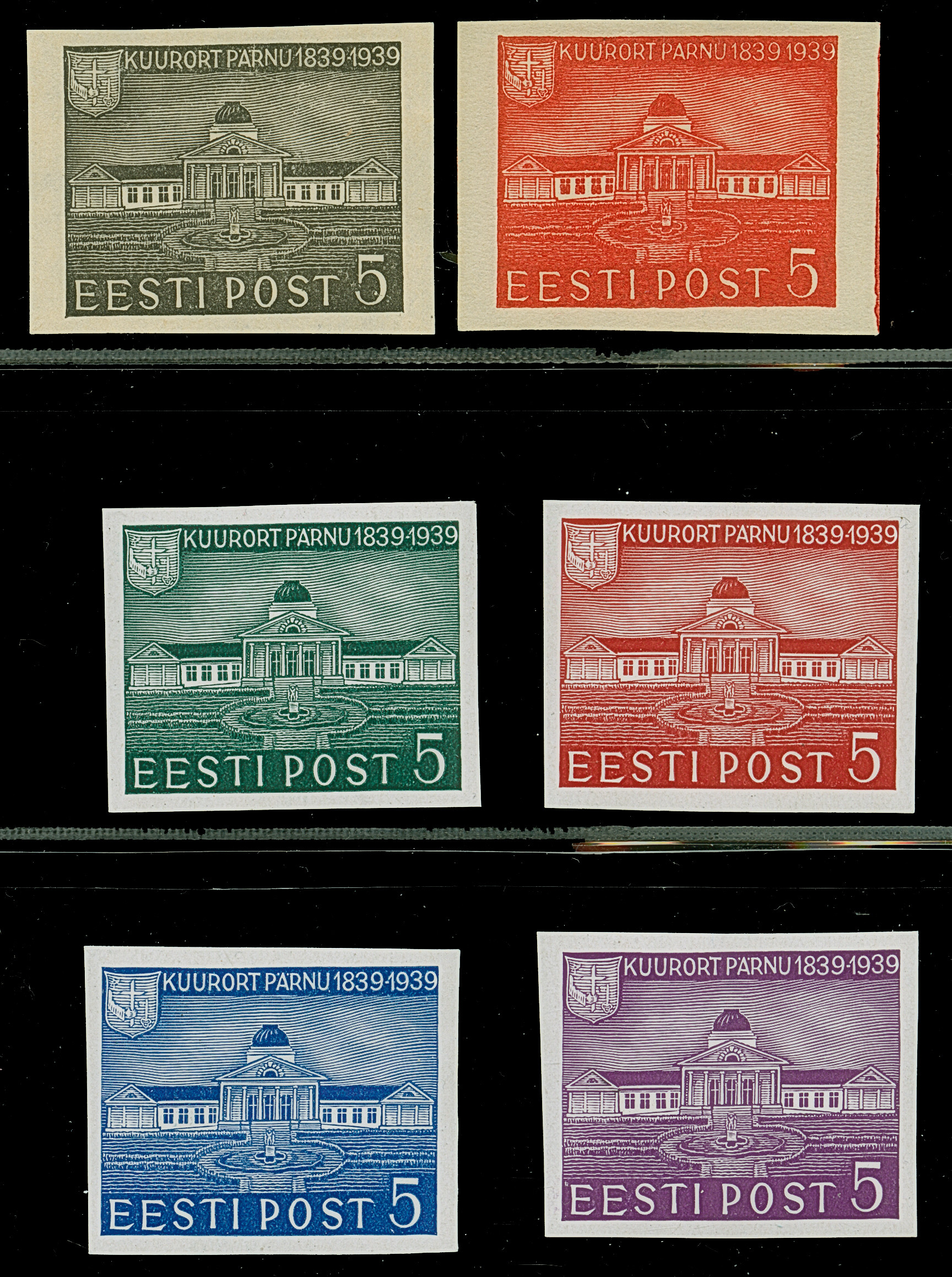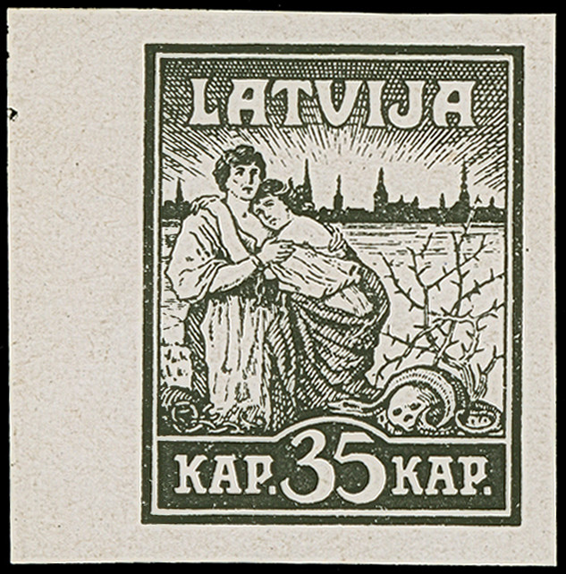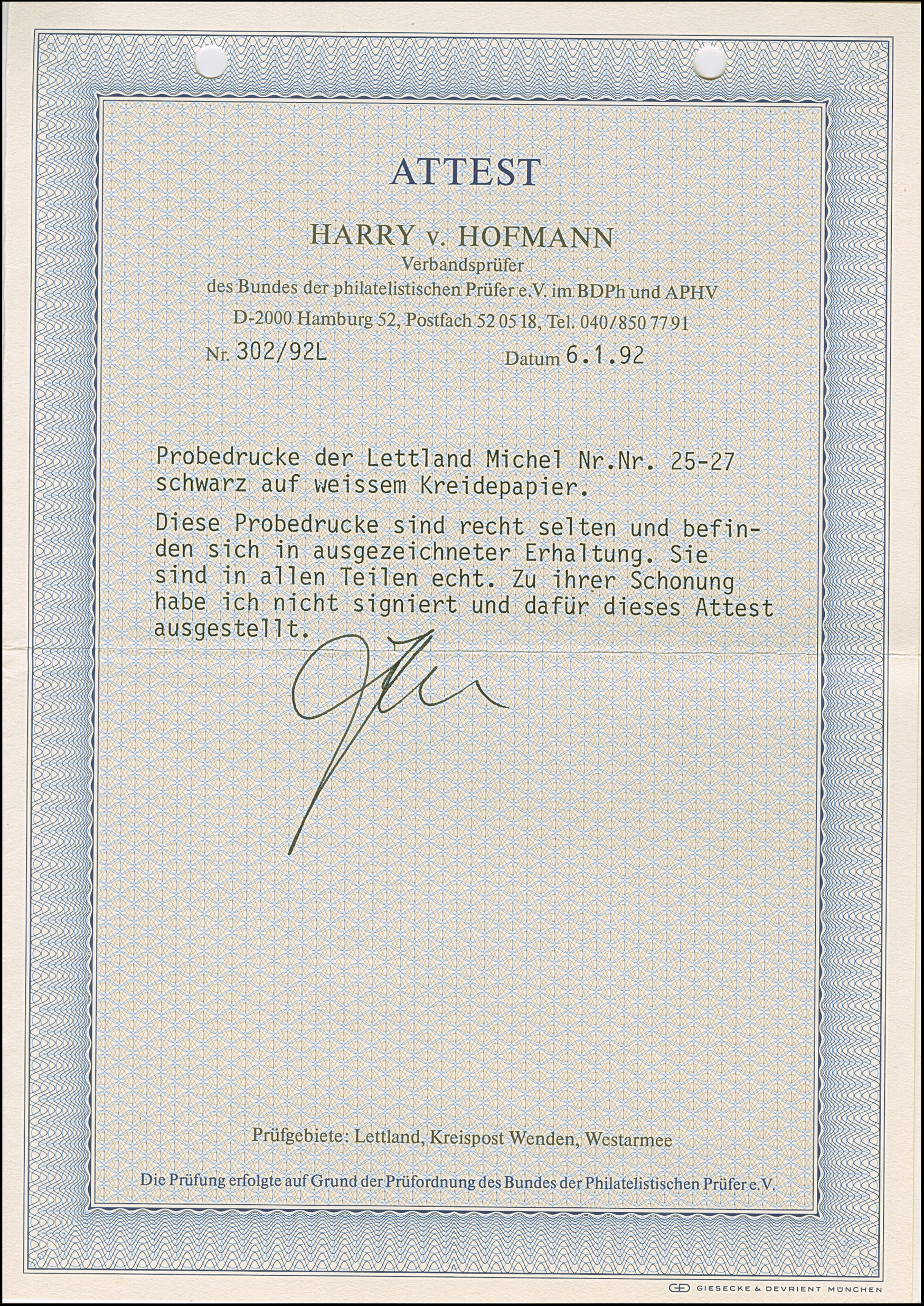 1919, Issue for North-Latvia 10 kopek, six proofs, dark-blue on thin paper, black on thin and thick paper imperforated, on thick paper perforated on two sides, black on ordinary paper and on green paper, unused without gum, the one on ordinary paper small surface rub, otherwise fine