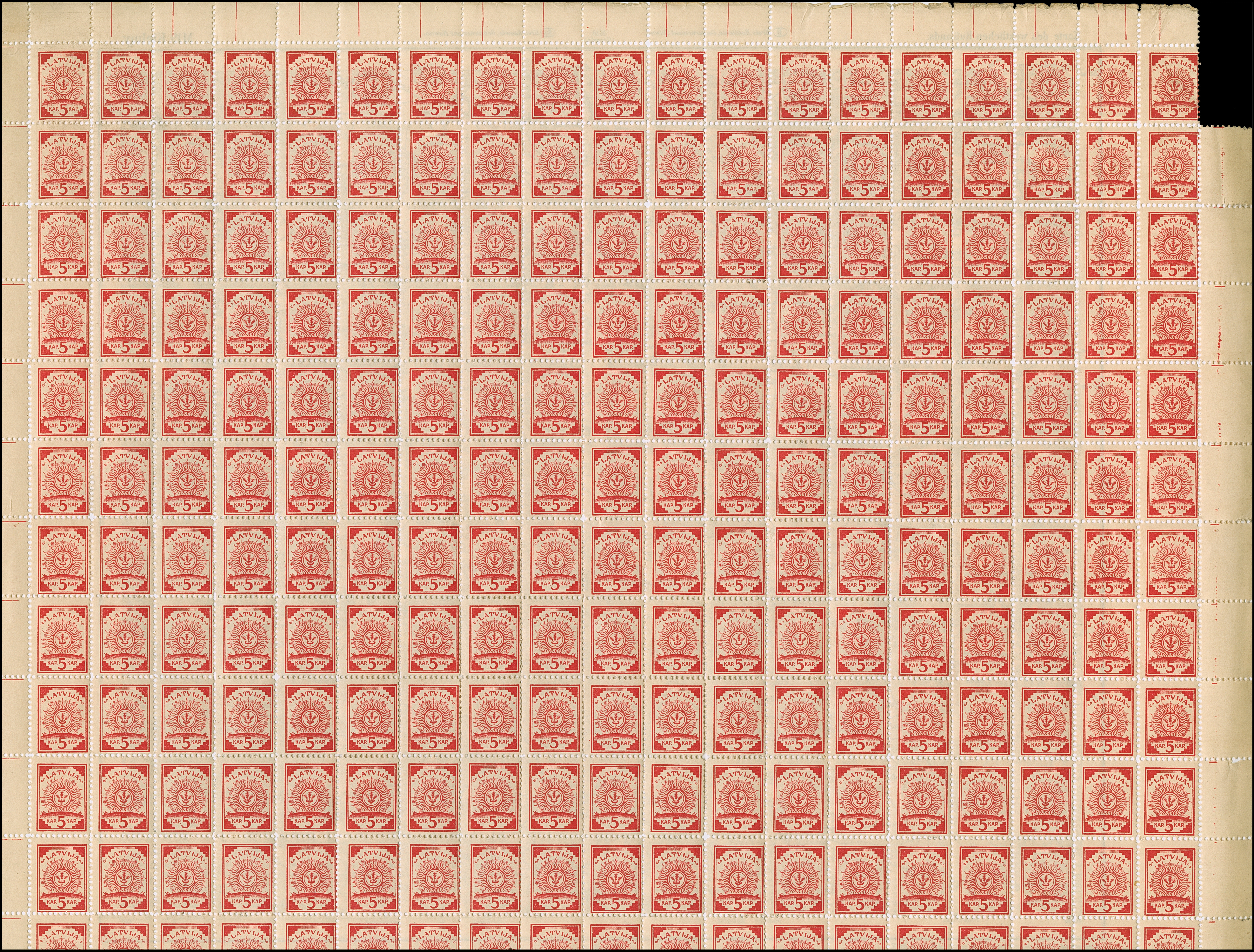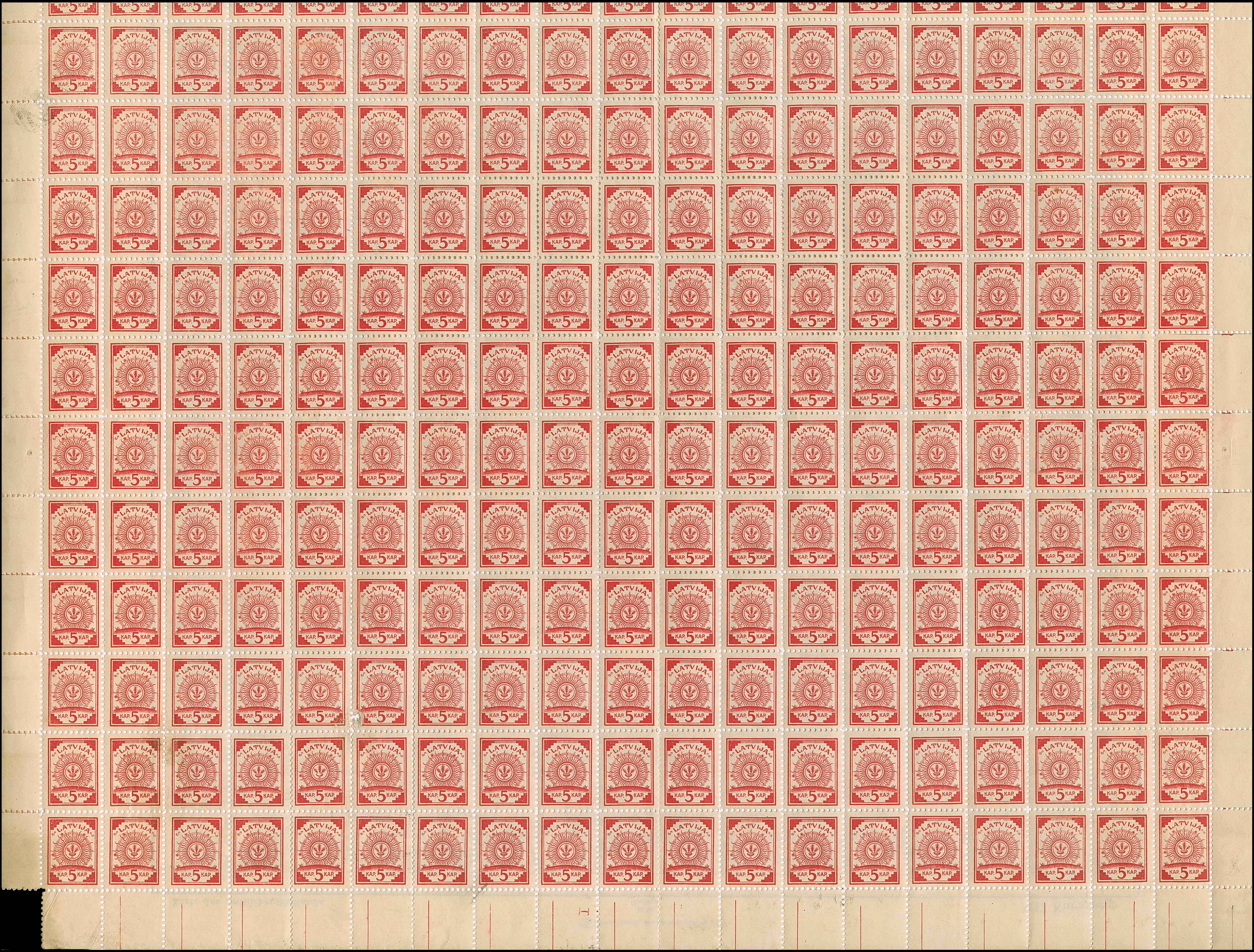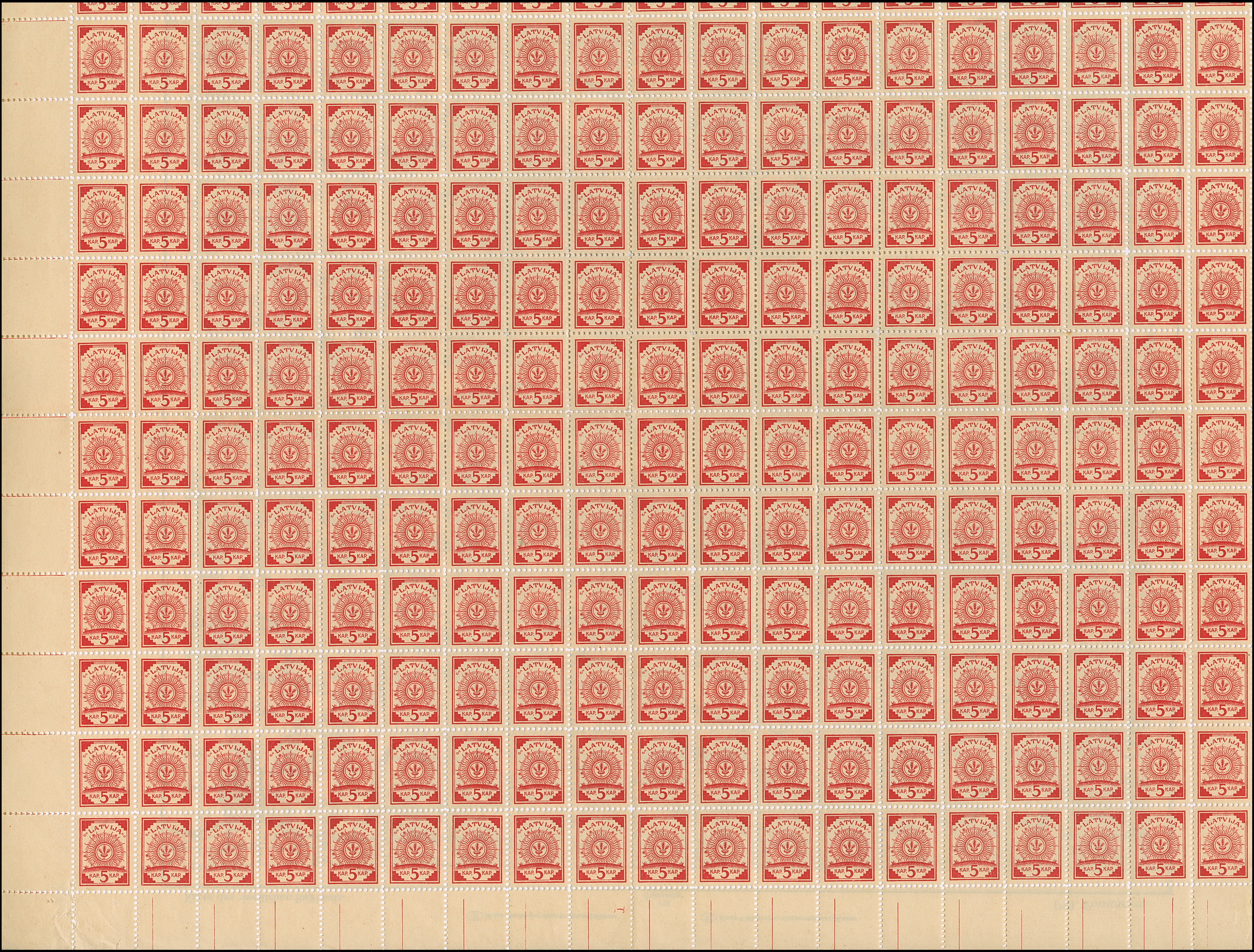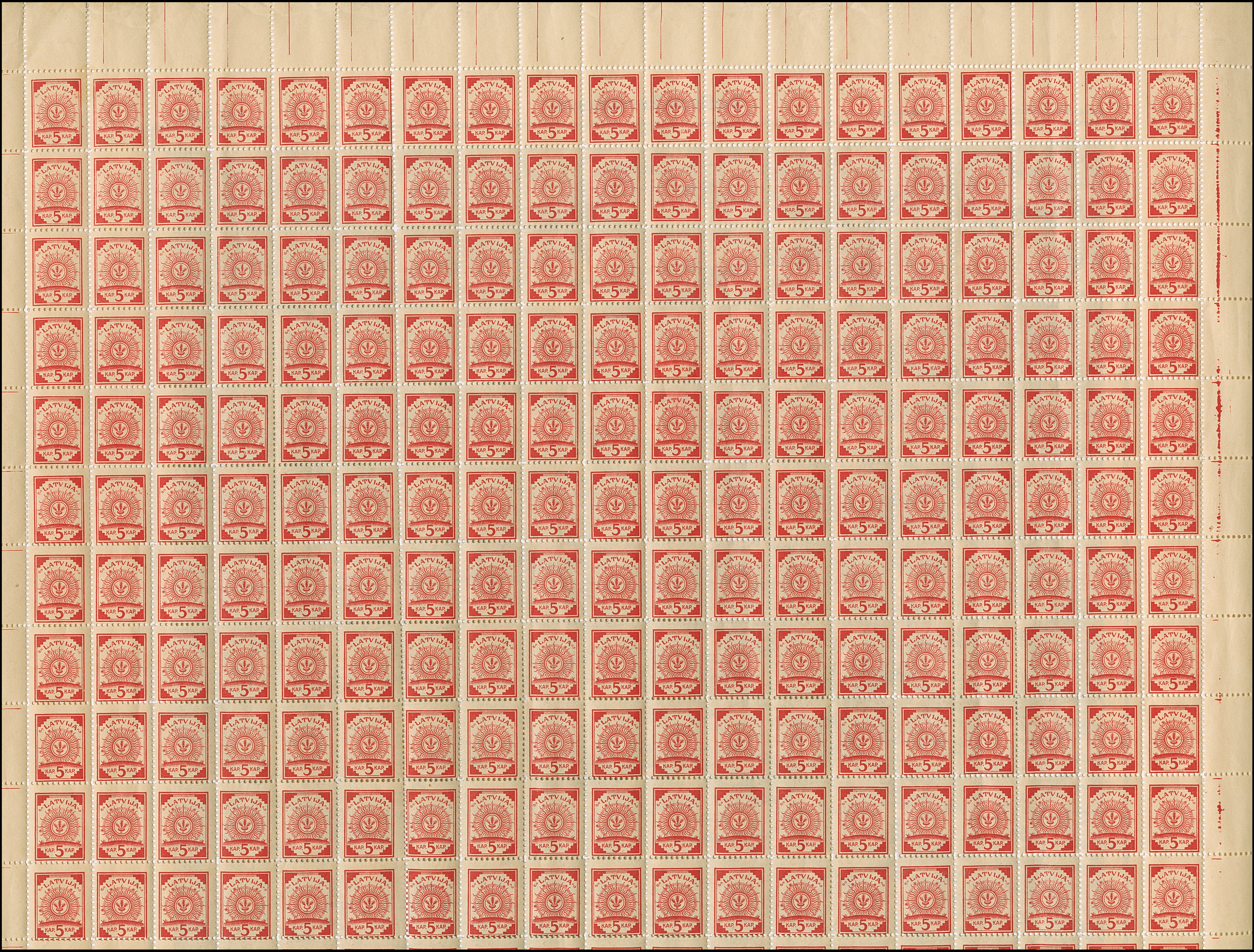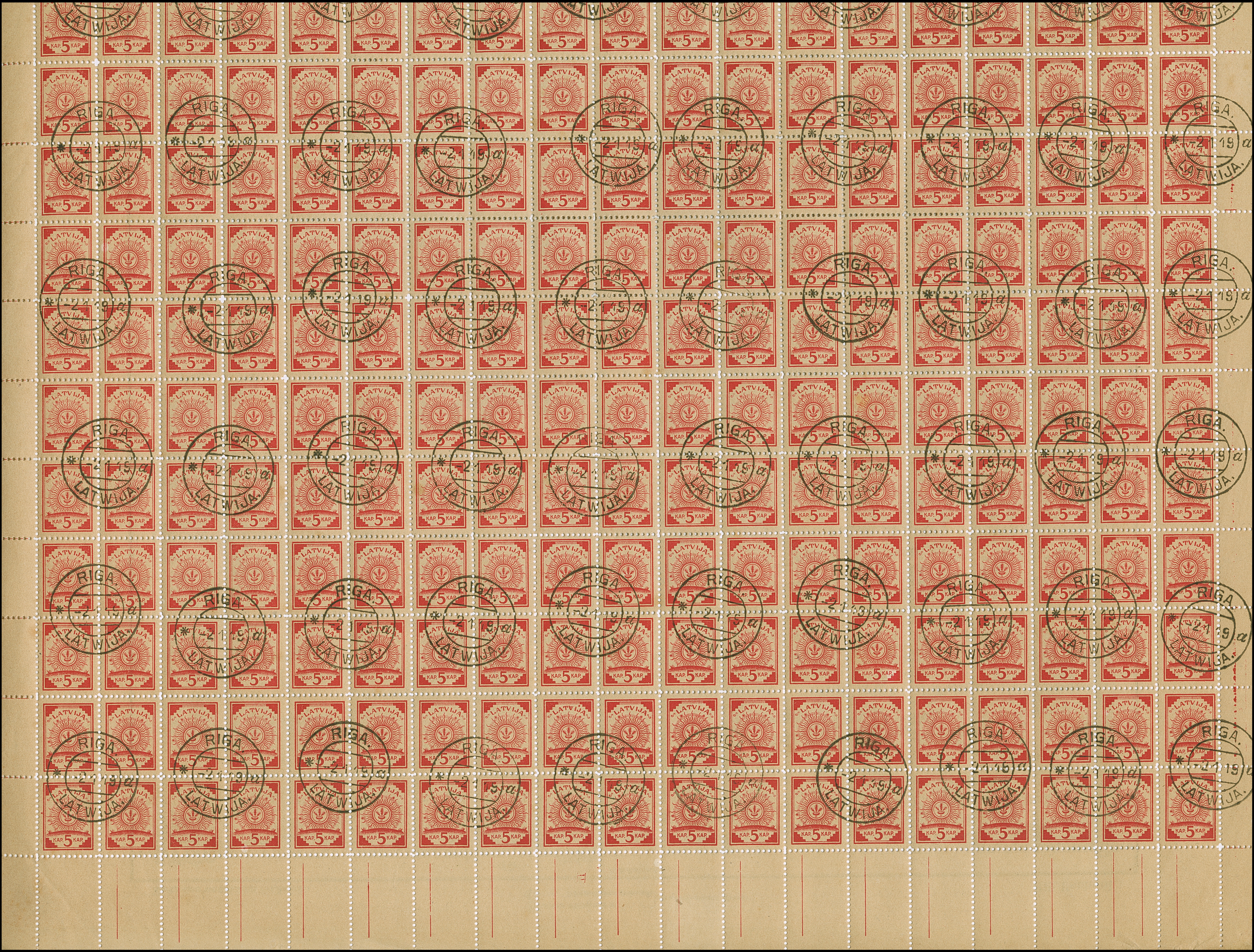 1919, Ear of corn 10 kopek red, perforated, complete sheet on map R19 Uschpol, used with cds. “RIGA -2 1 19”, some minor perf separations, otherwise fine