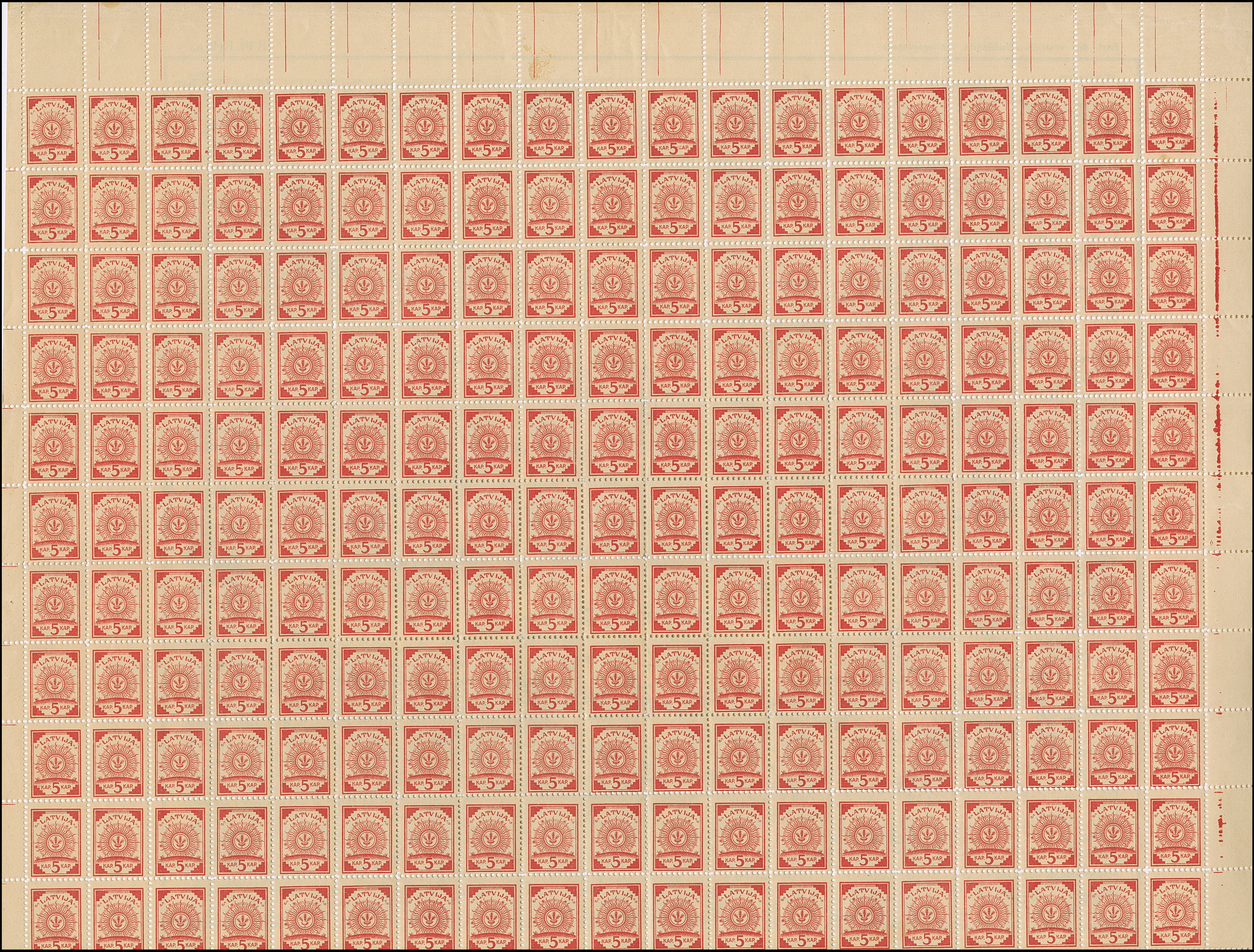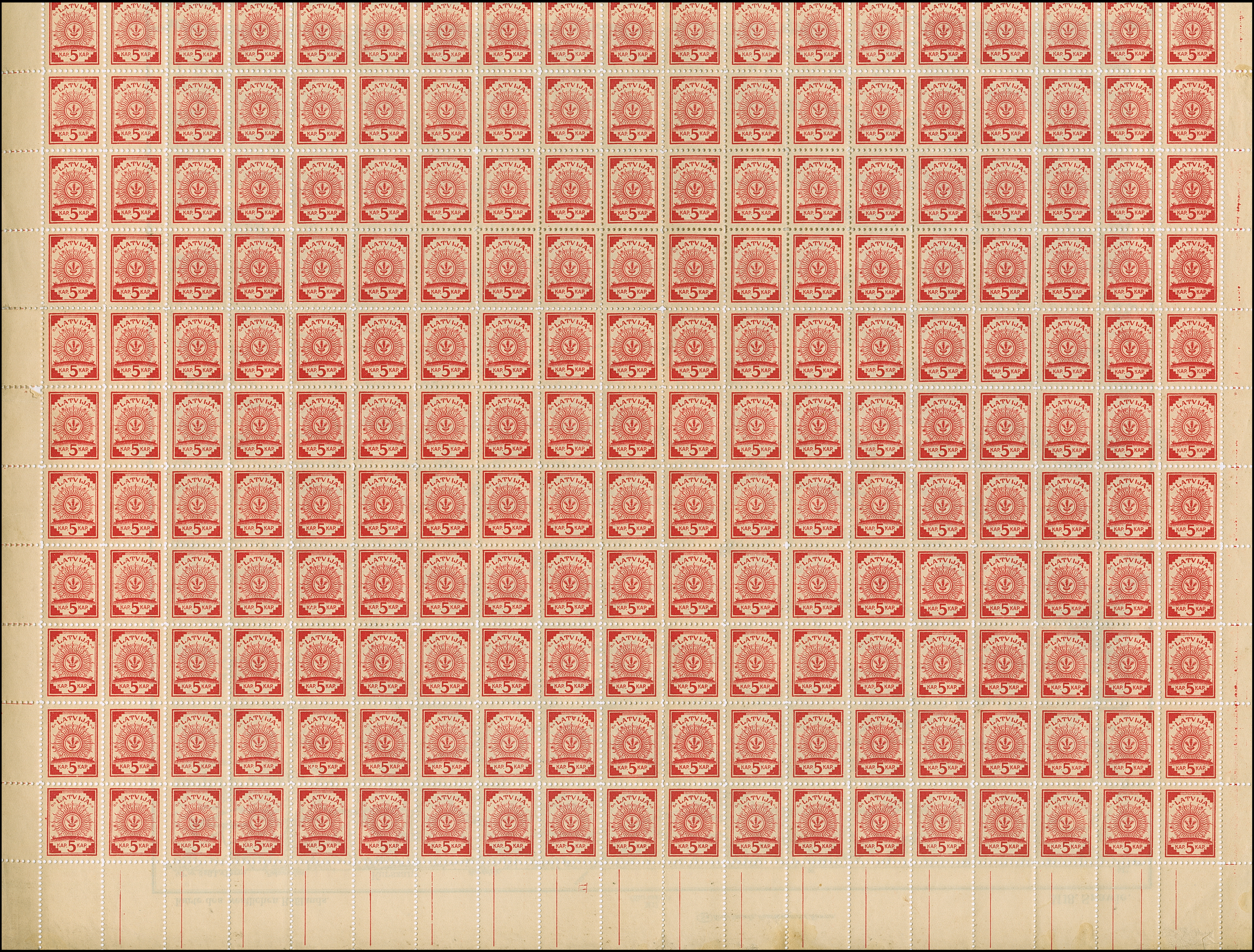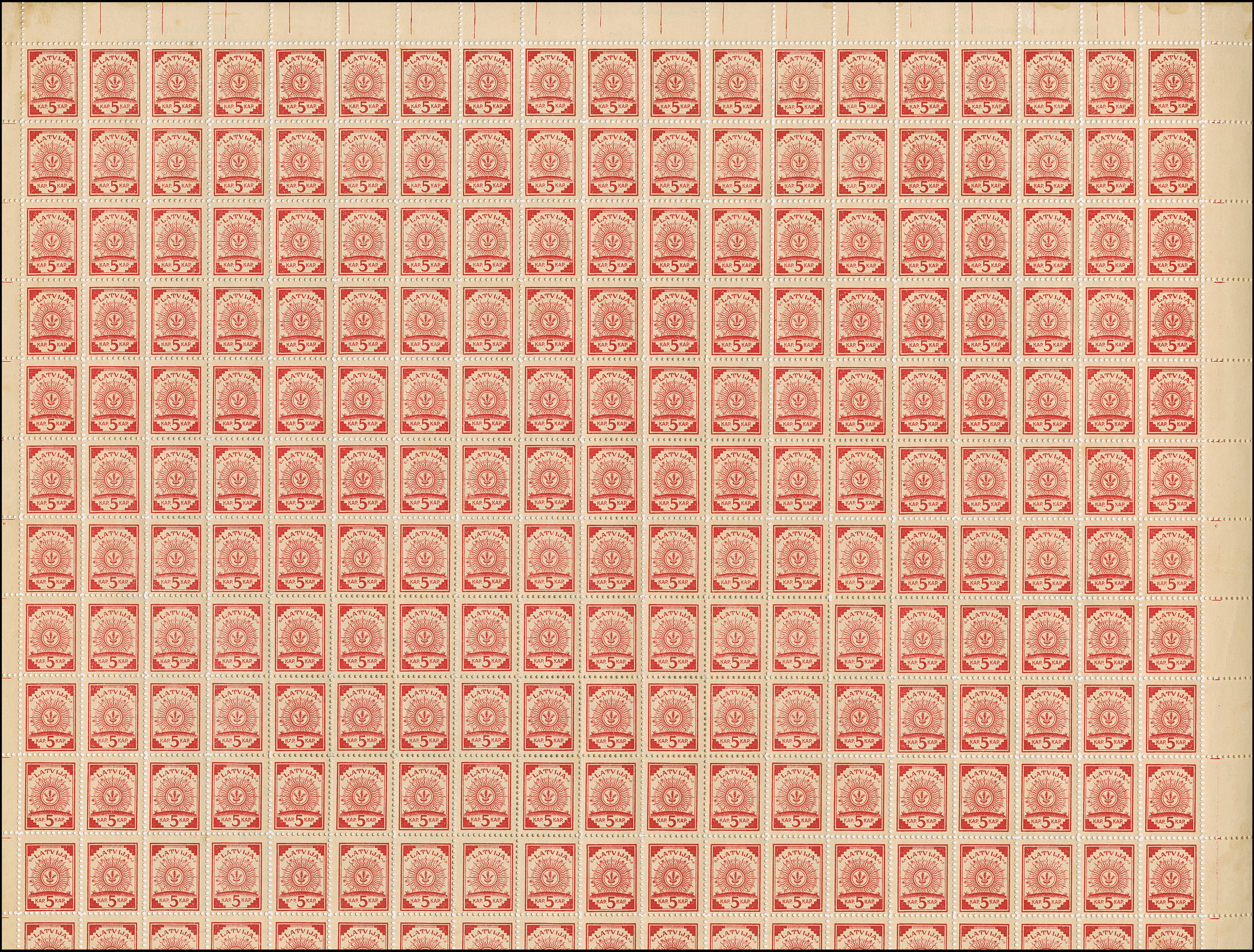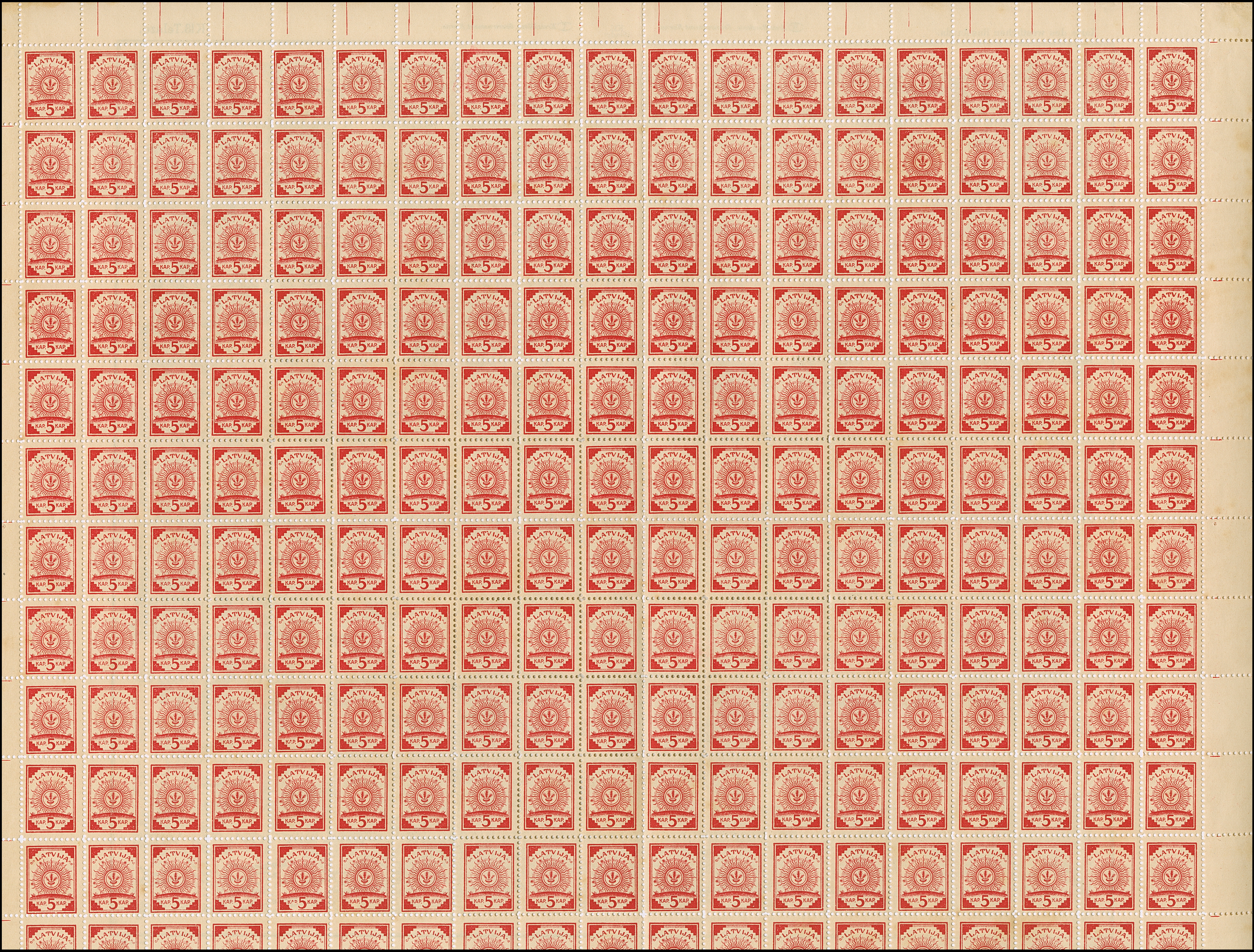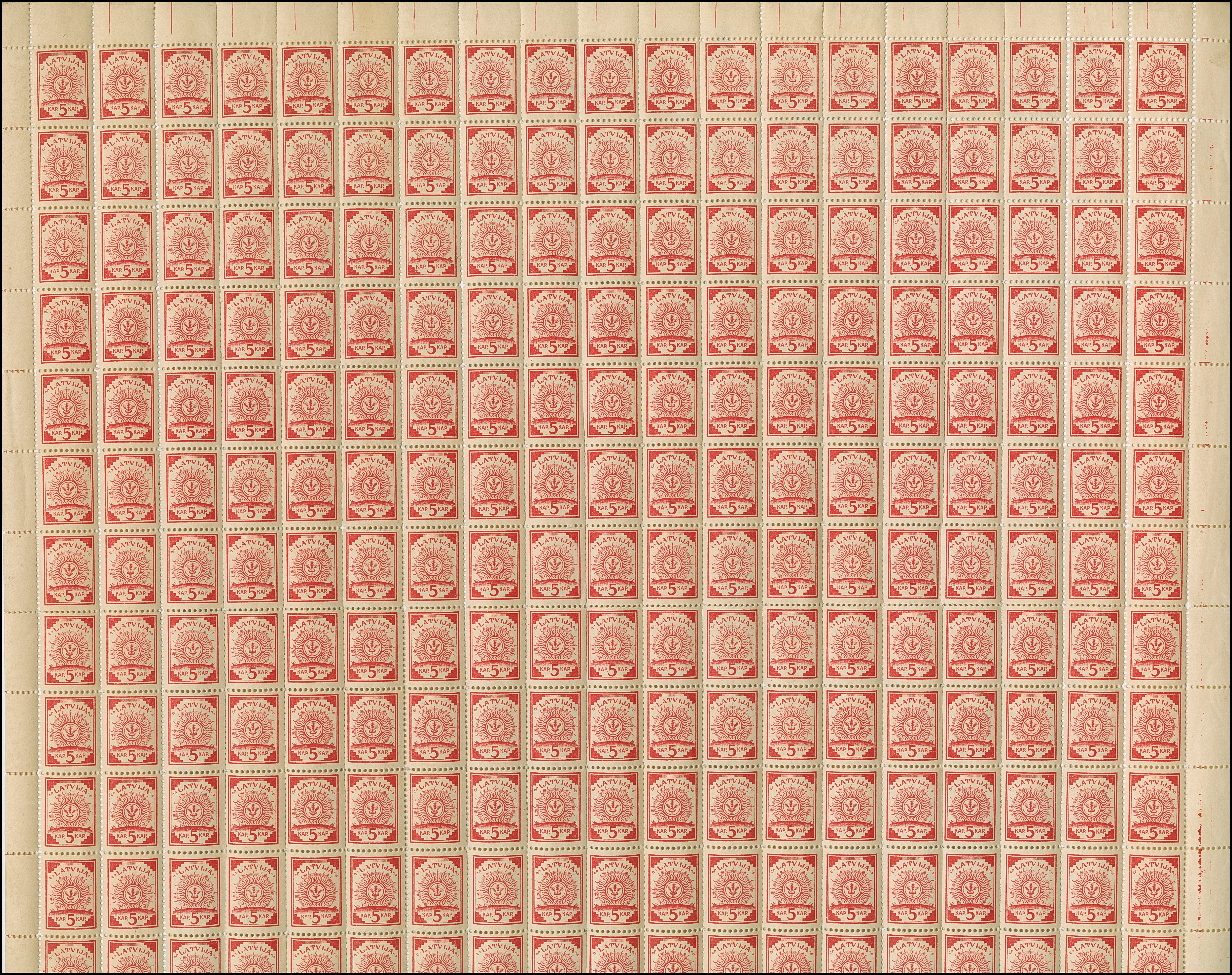 1919, Ear of corn 10 kopek red, perforated, complete sheet on map R19 Uschpol, used with cds. “RIGA -2 1 19”, some minor perf separations, otherwise fine
