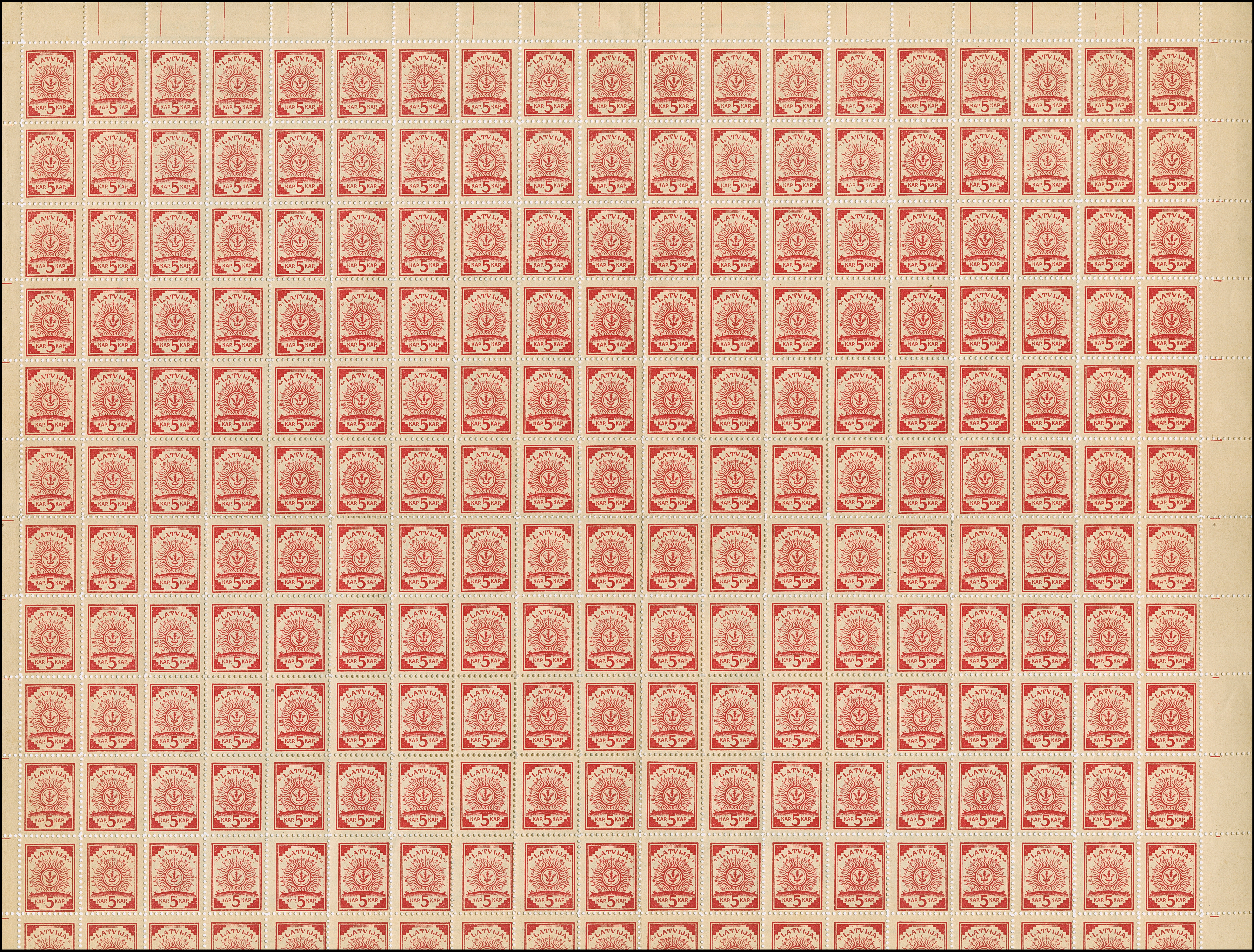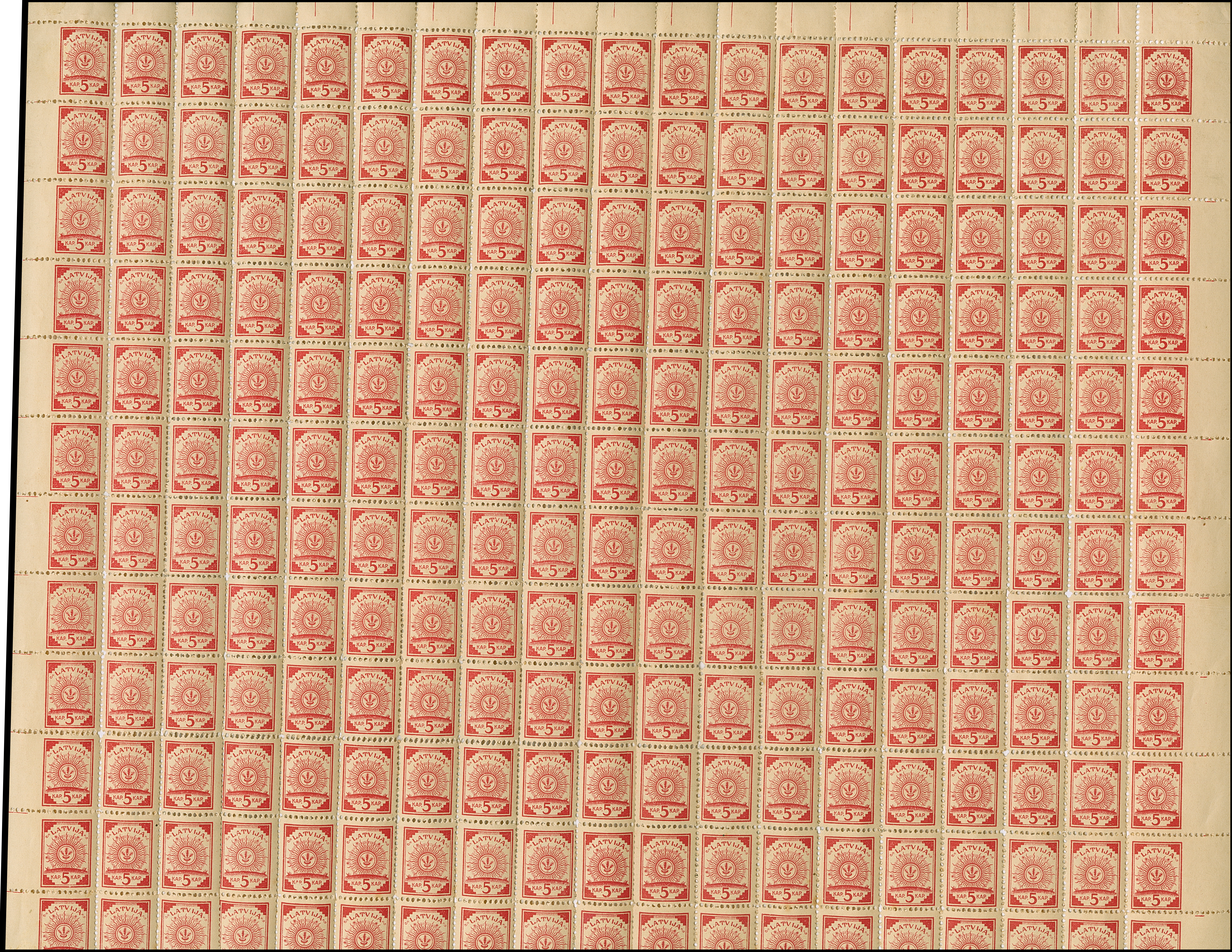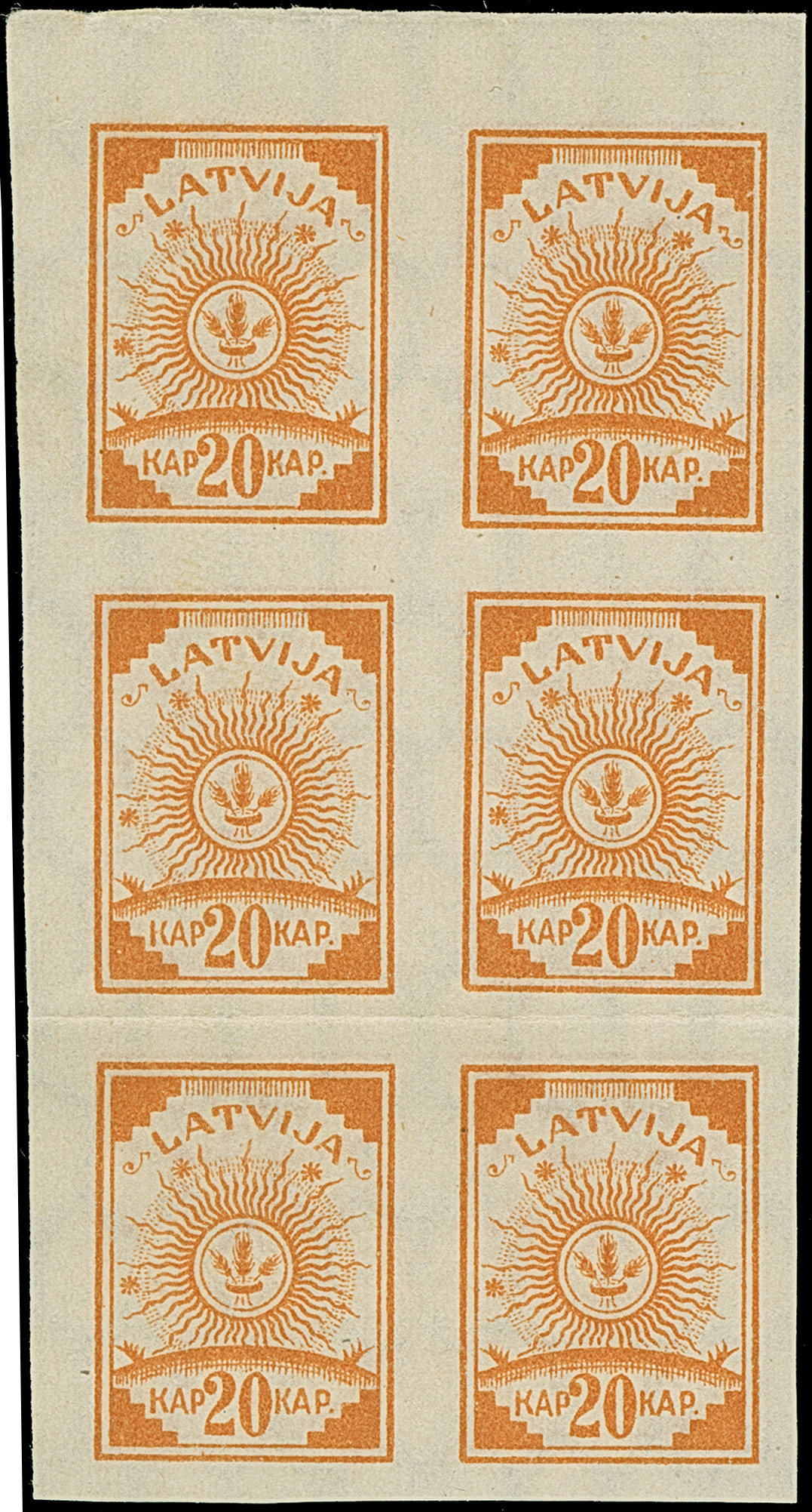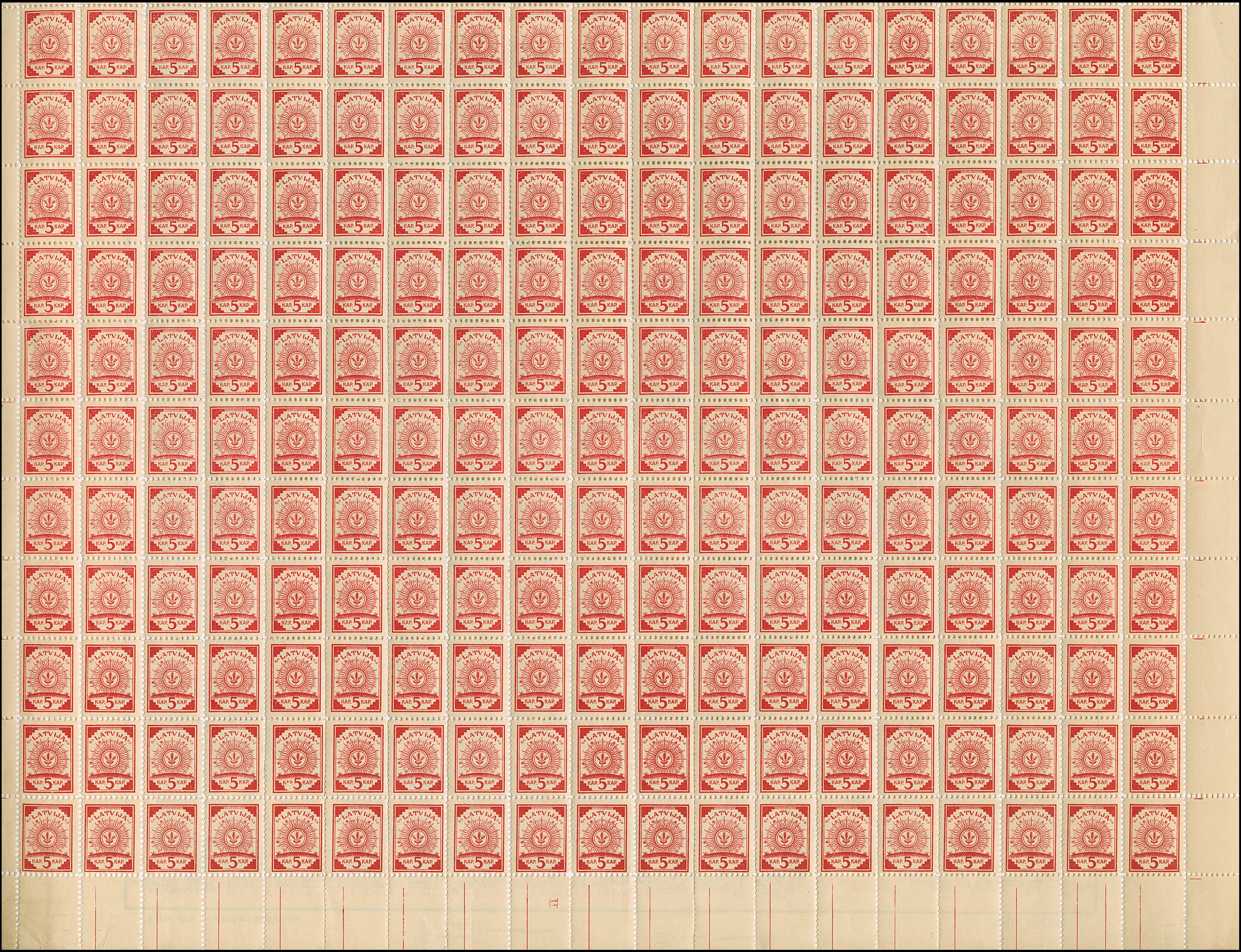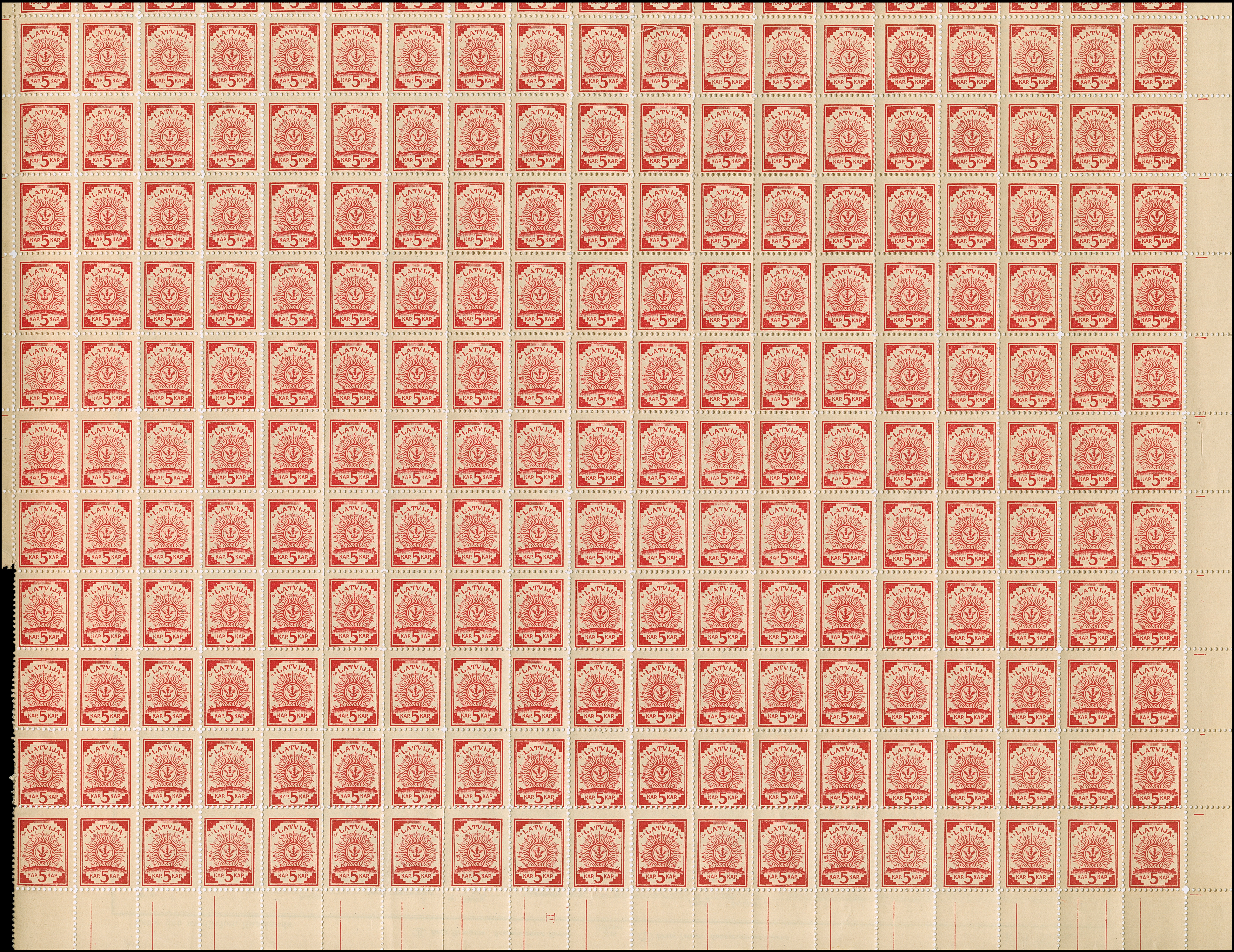 1919, Ear of corn 10 kopek red, perforated, complete sheet on map R19 Uschpol, used with cds. “RIGA -2 1 19”, some minor perf separations, otherwise fine
