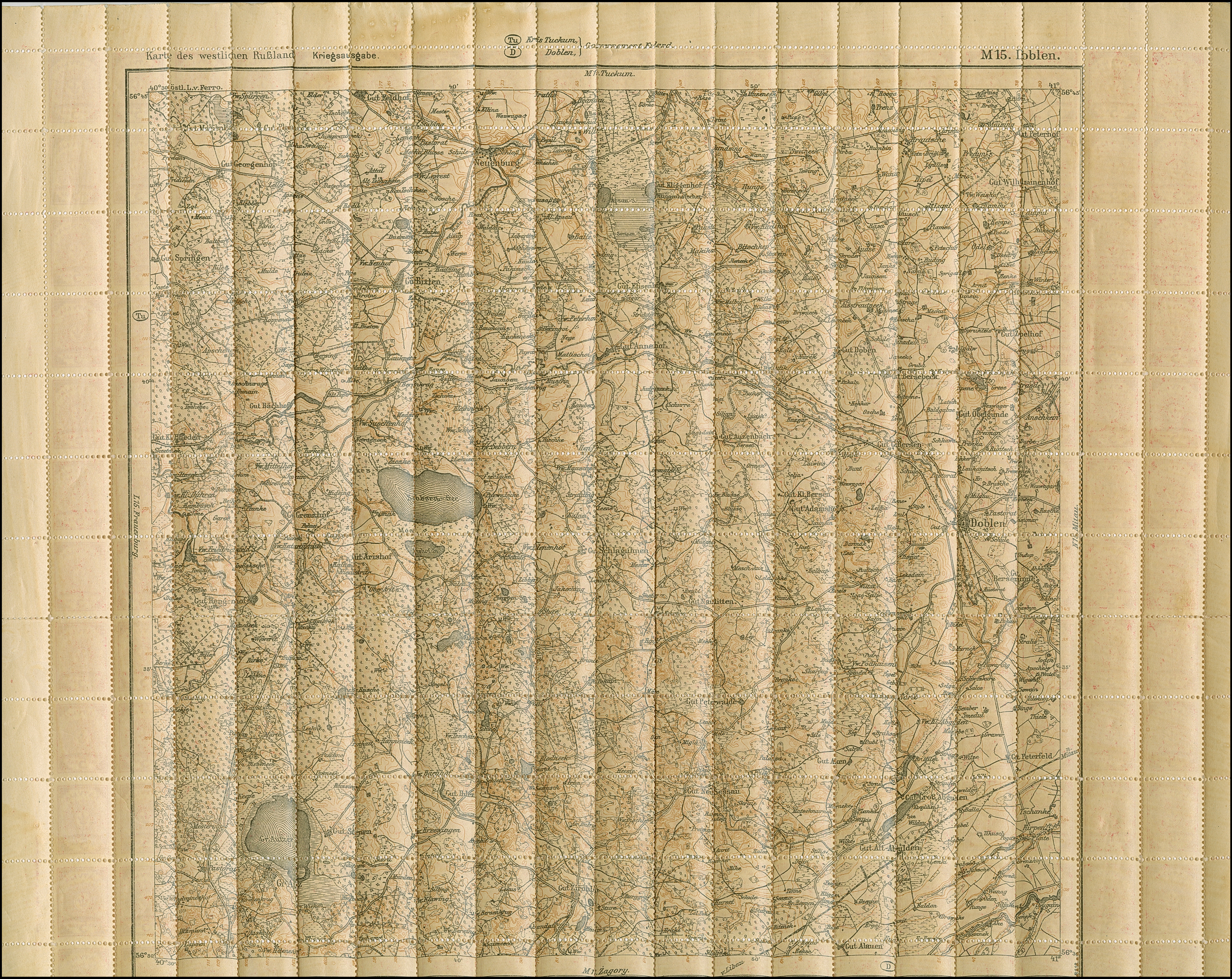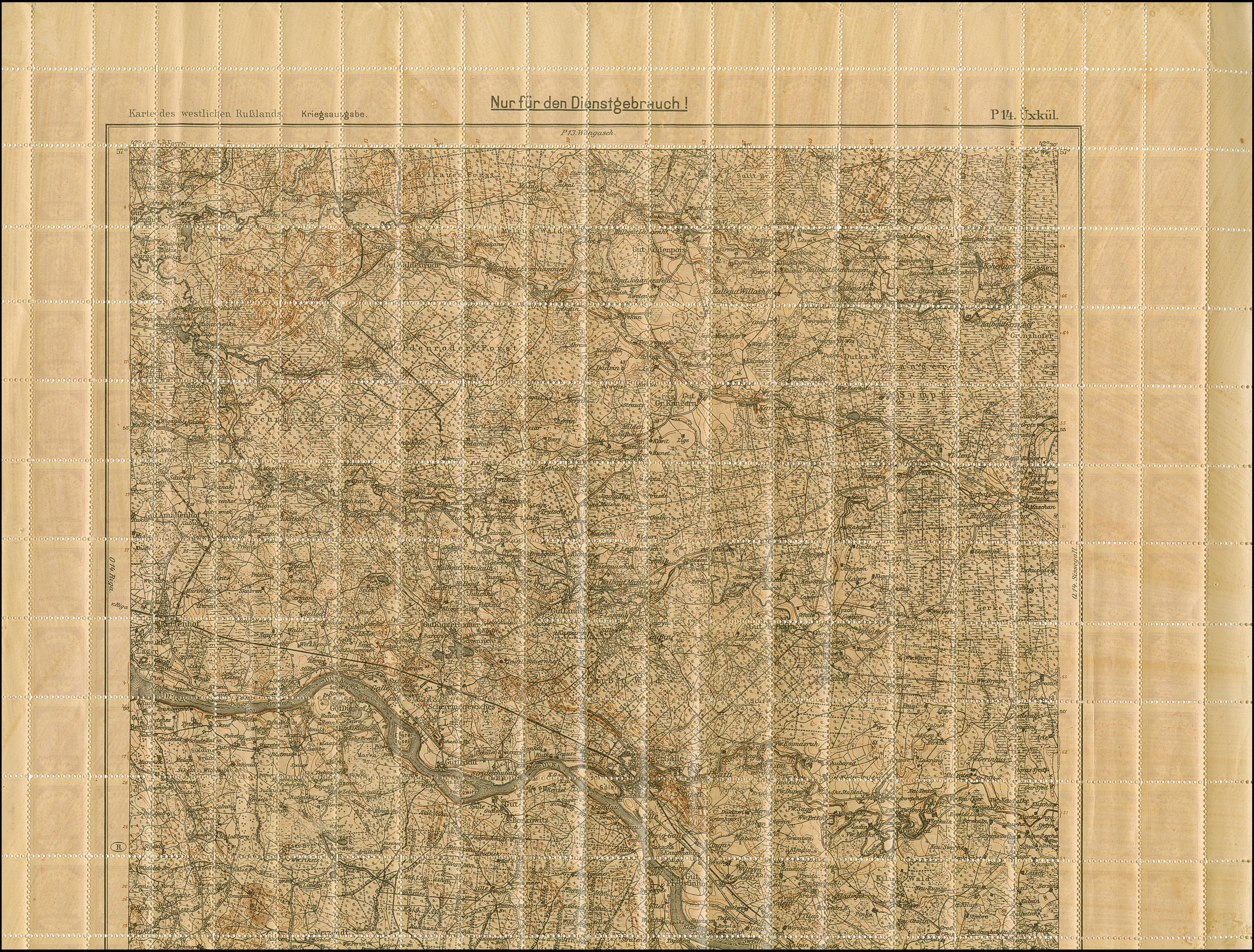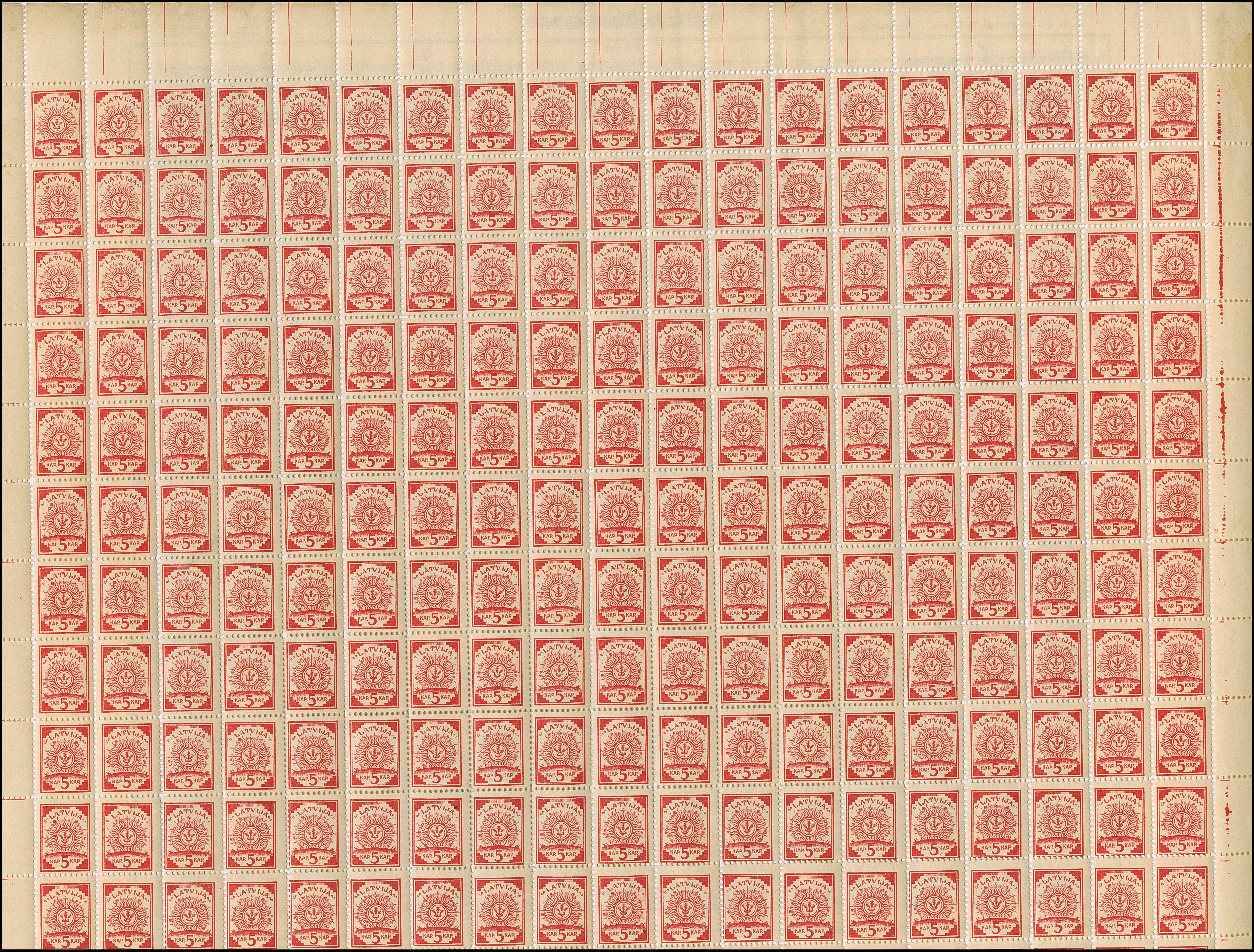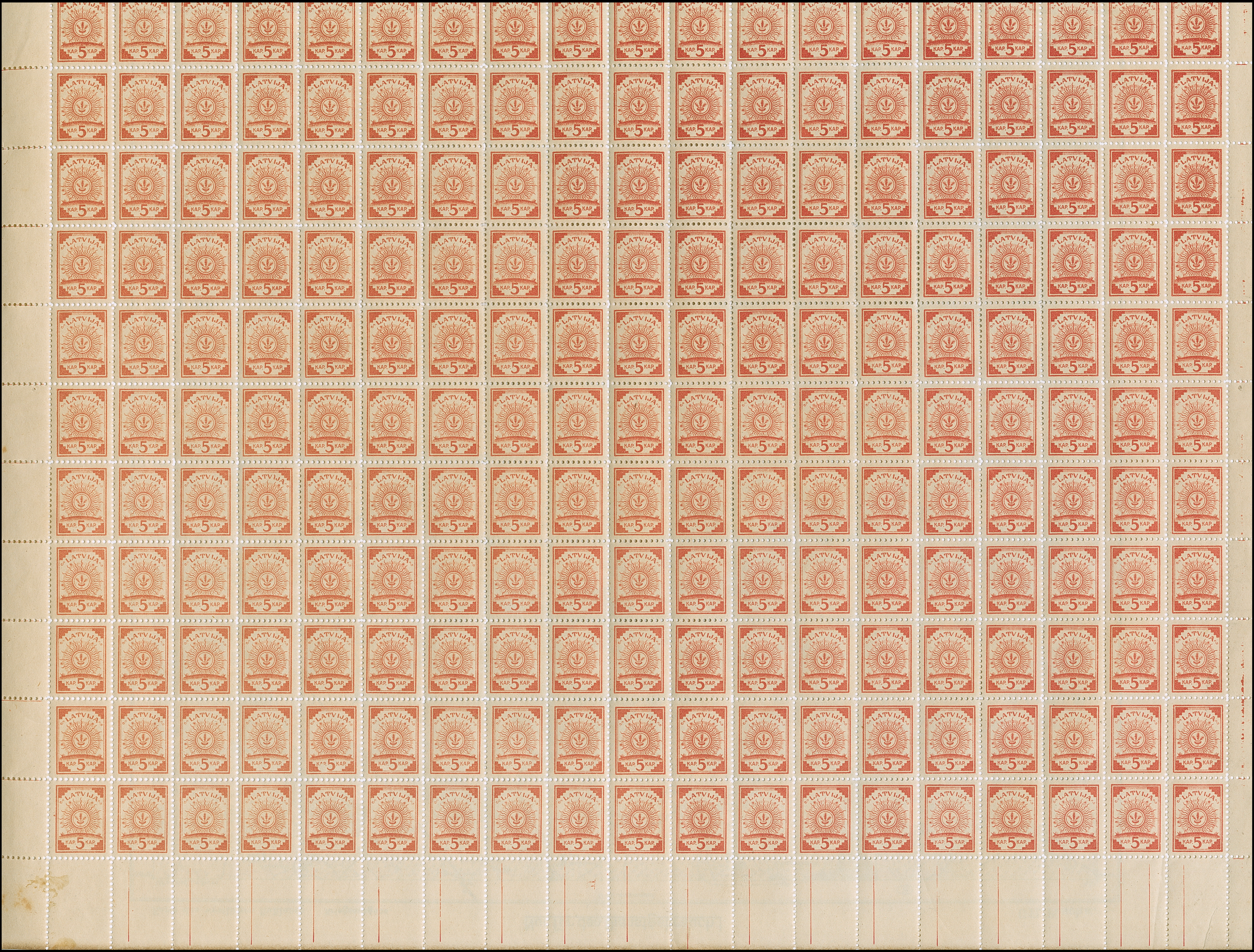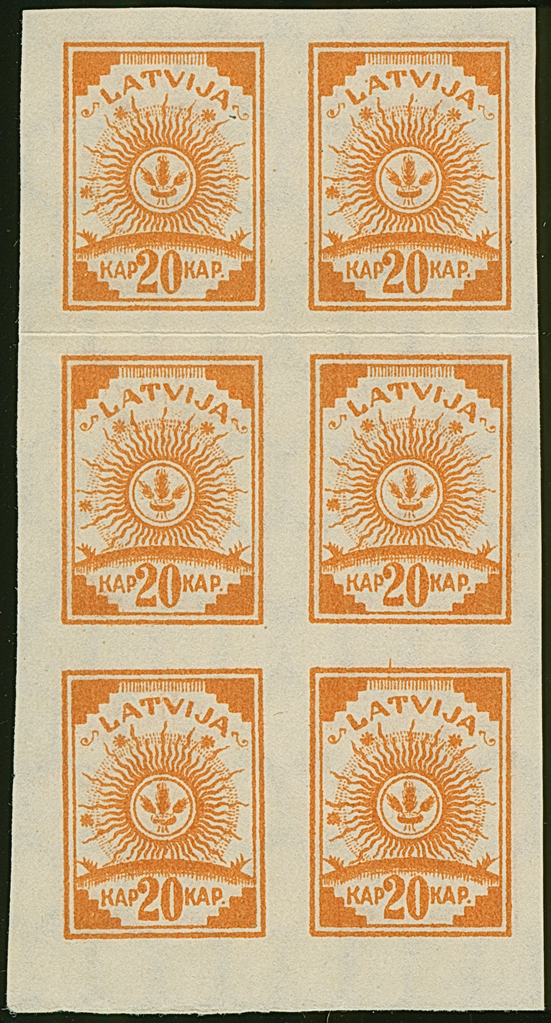 1919, Ear of corn 10 kopek red, perforated, complete sheet on map R19 Uschpol, used with cds. “RIGA -2 1 19”, some minor perf separations, otherwise fine