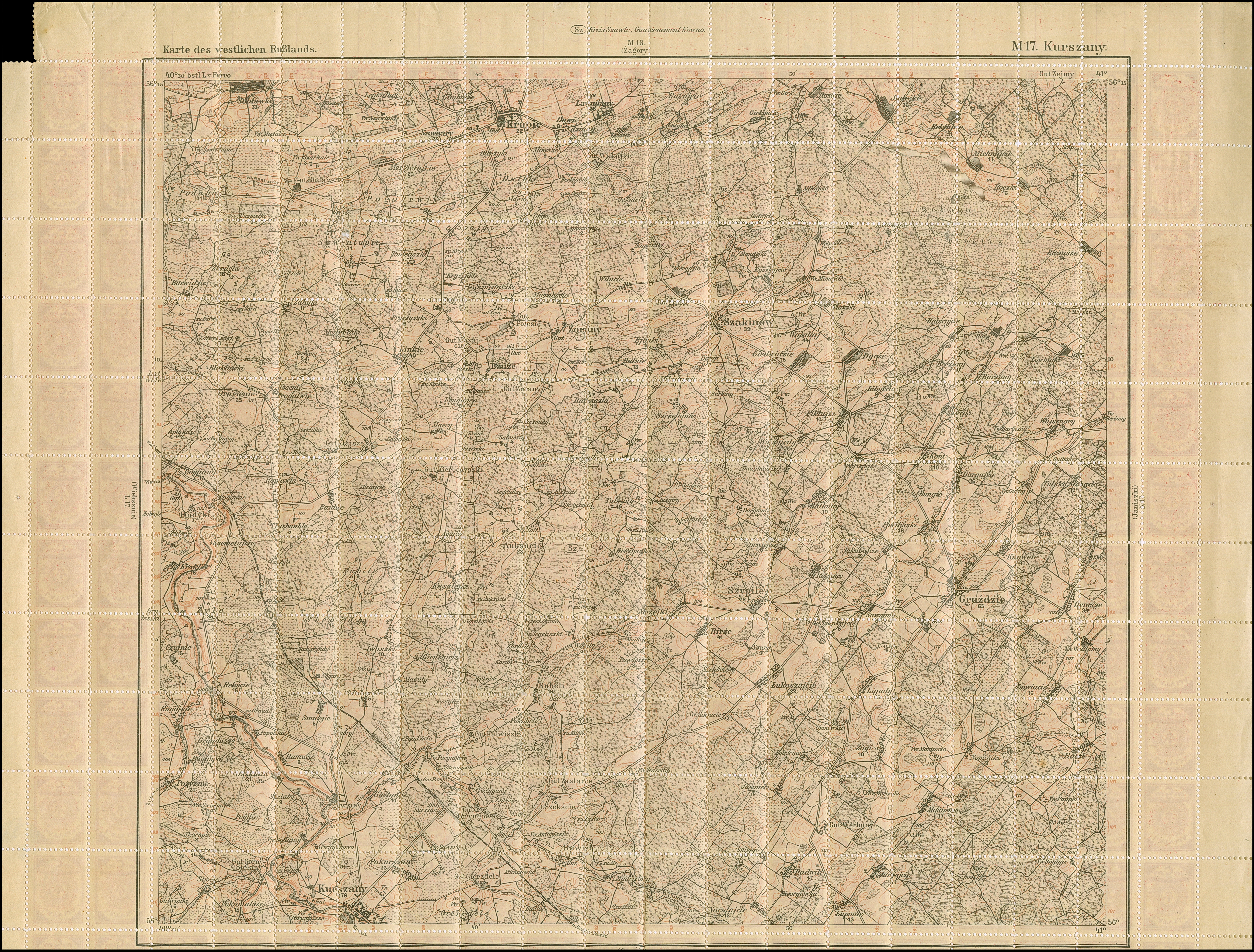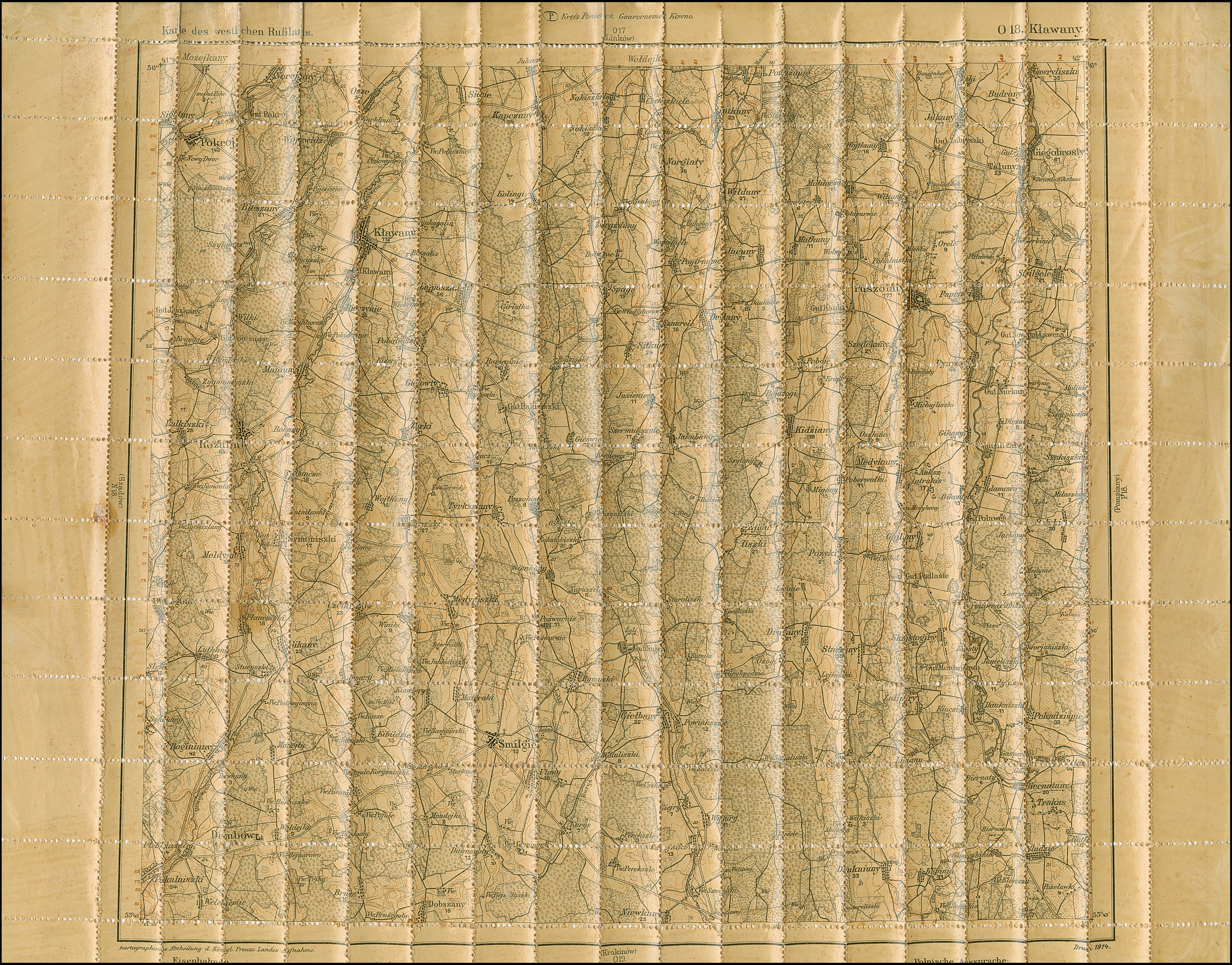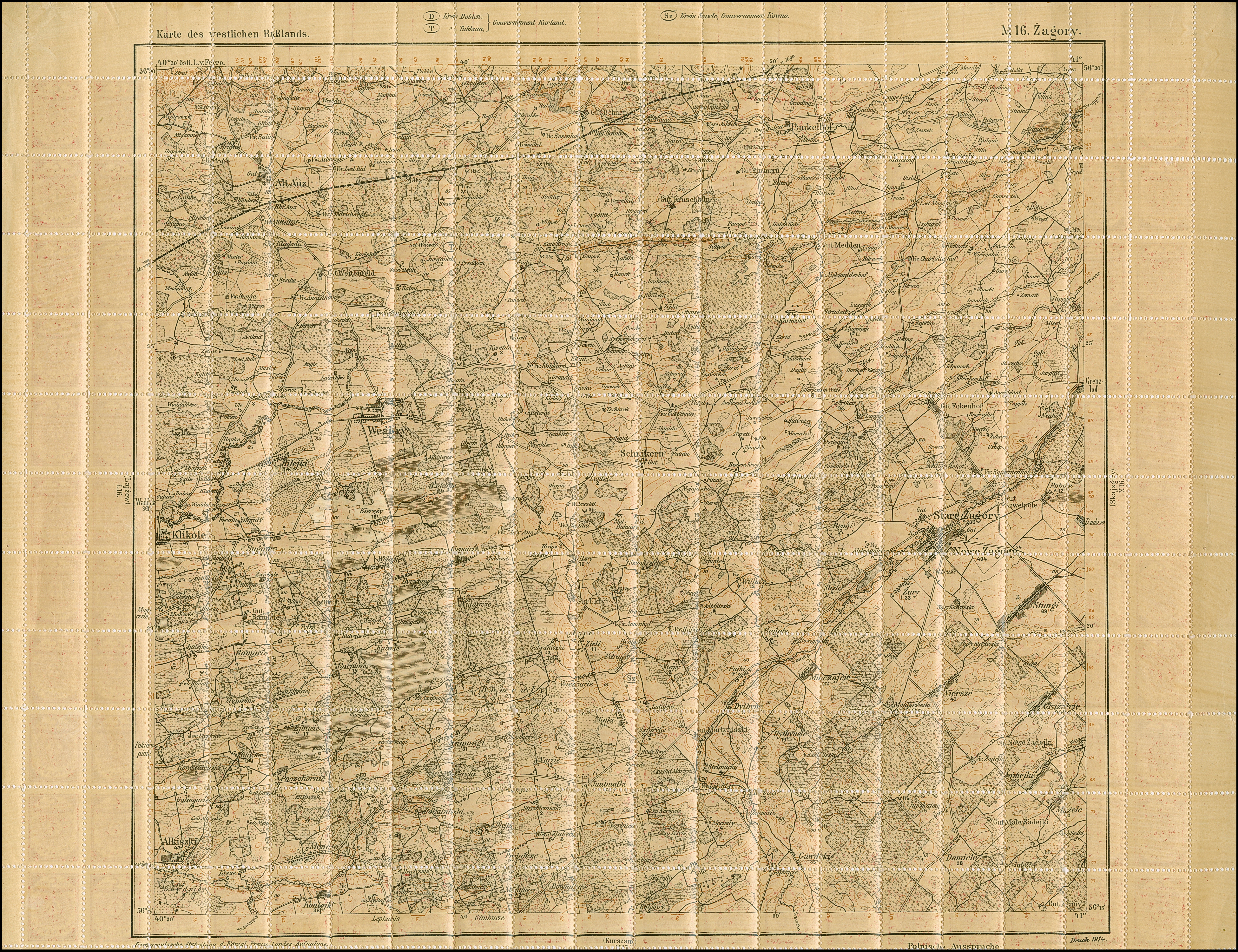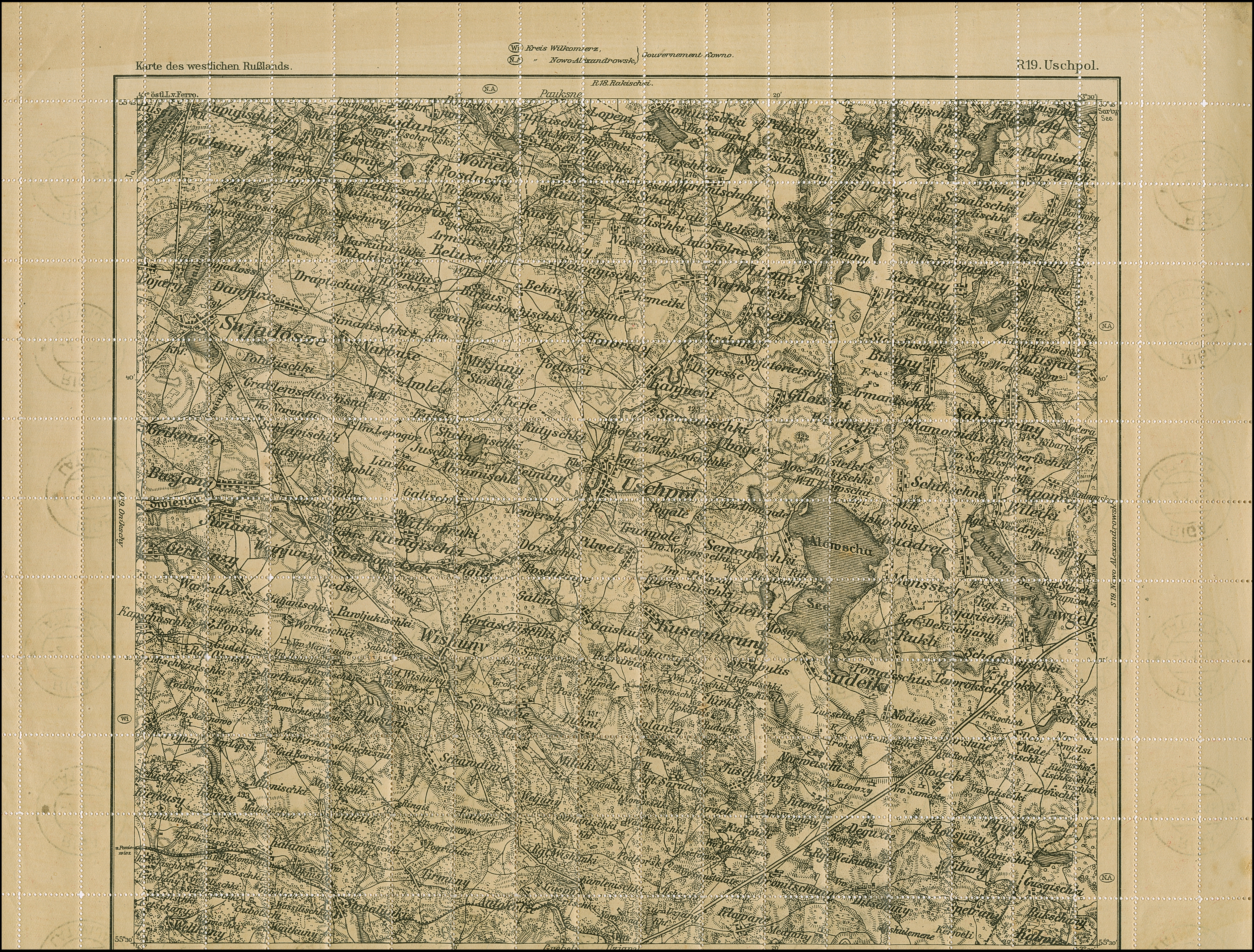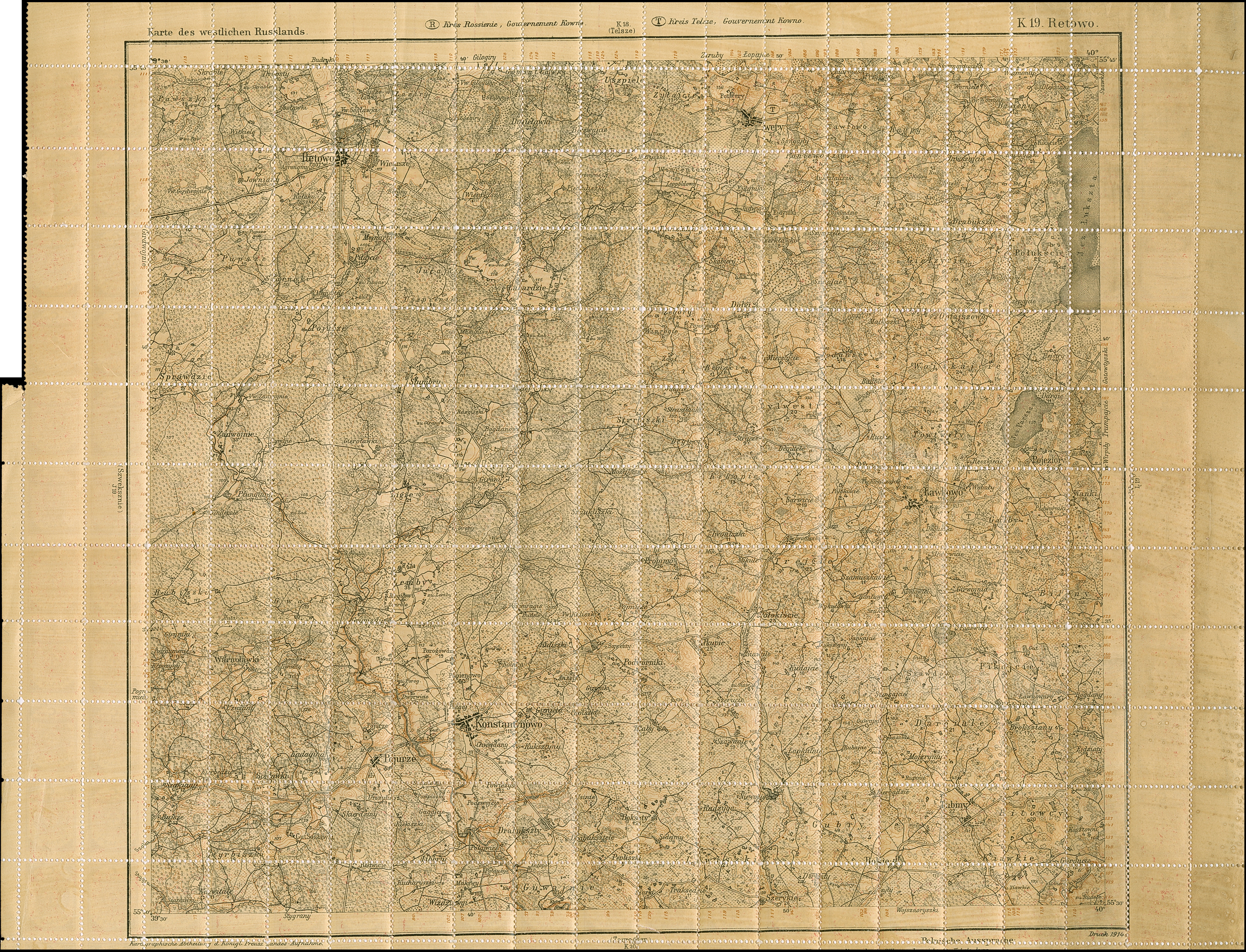 1919, Ear of corn 10 kopek red, perforated, complete sheet on map R19 Uschpol, used with cds. “RIGA -2 1 19”, some minor perf separations, otherwise fine