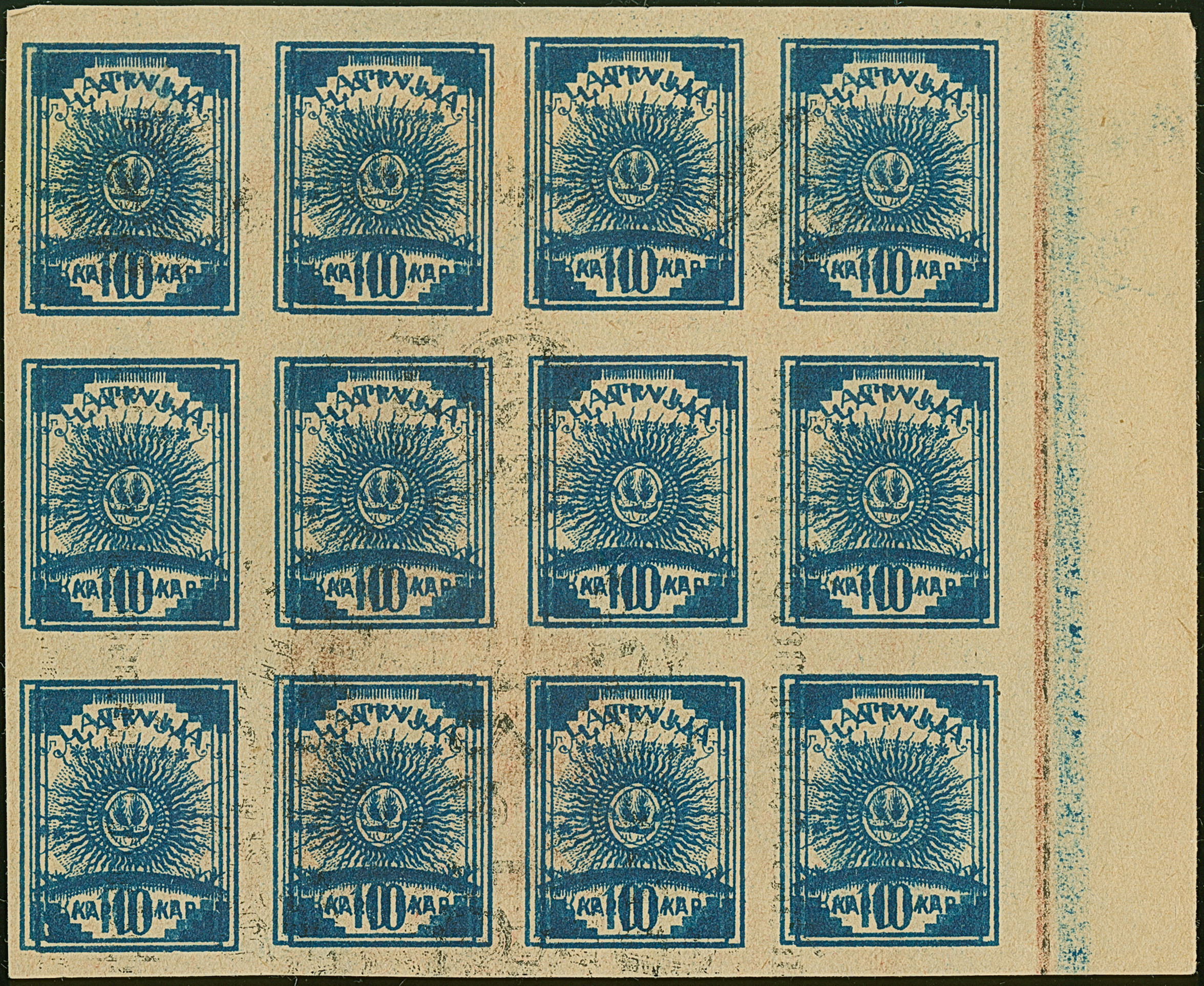 1919, Ear of corn 10 kopeks blue, double print, on multicolored label paper, block of 12 with right sheet margin, without gum, fine and attractive multiple