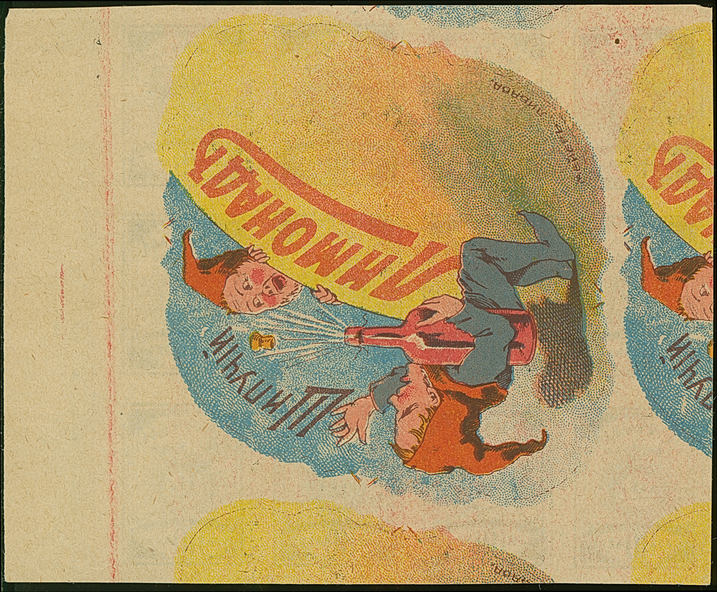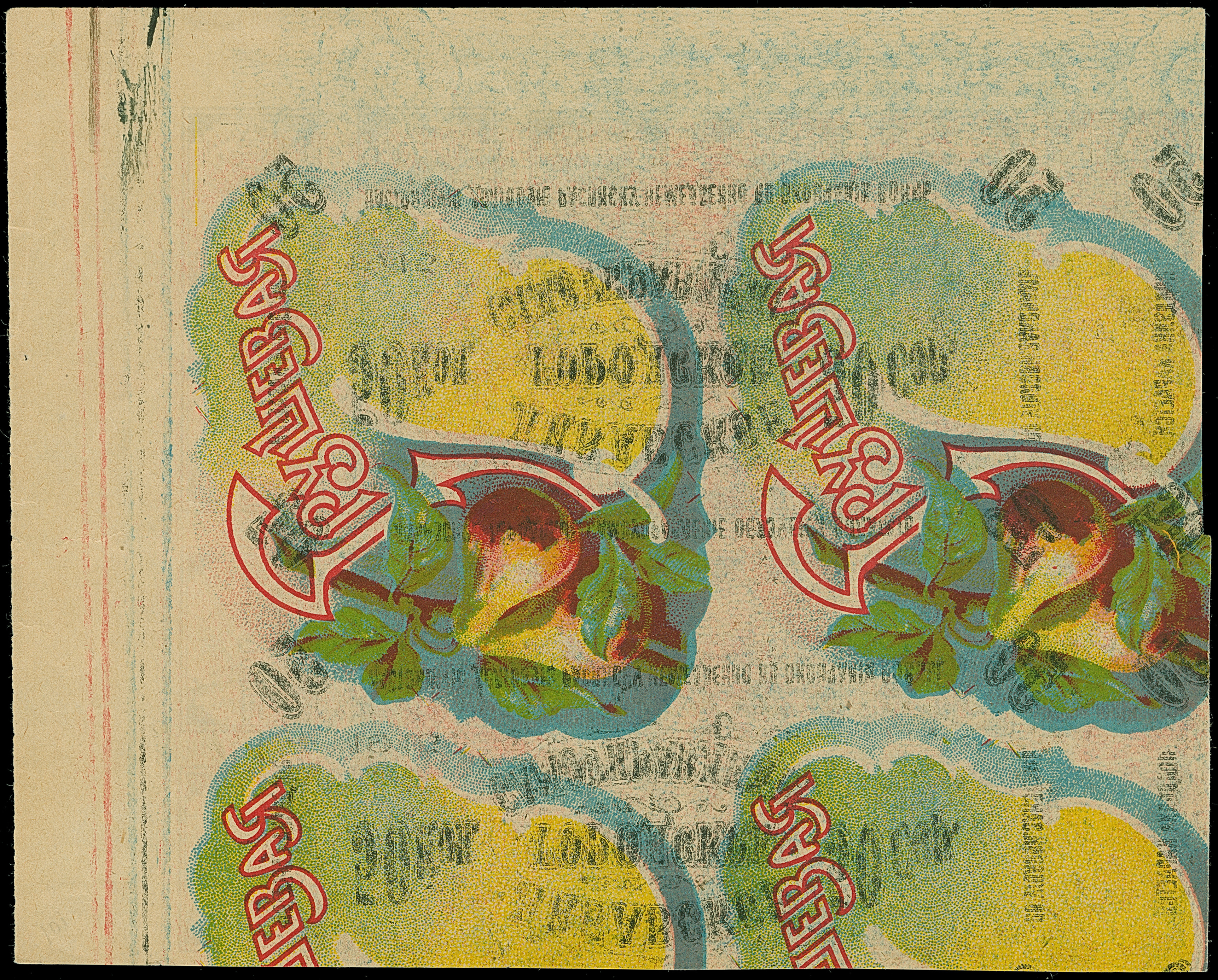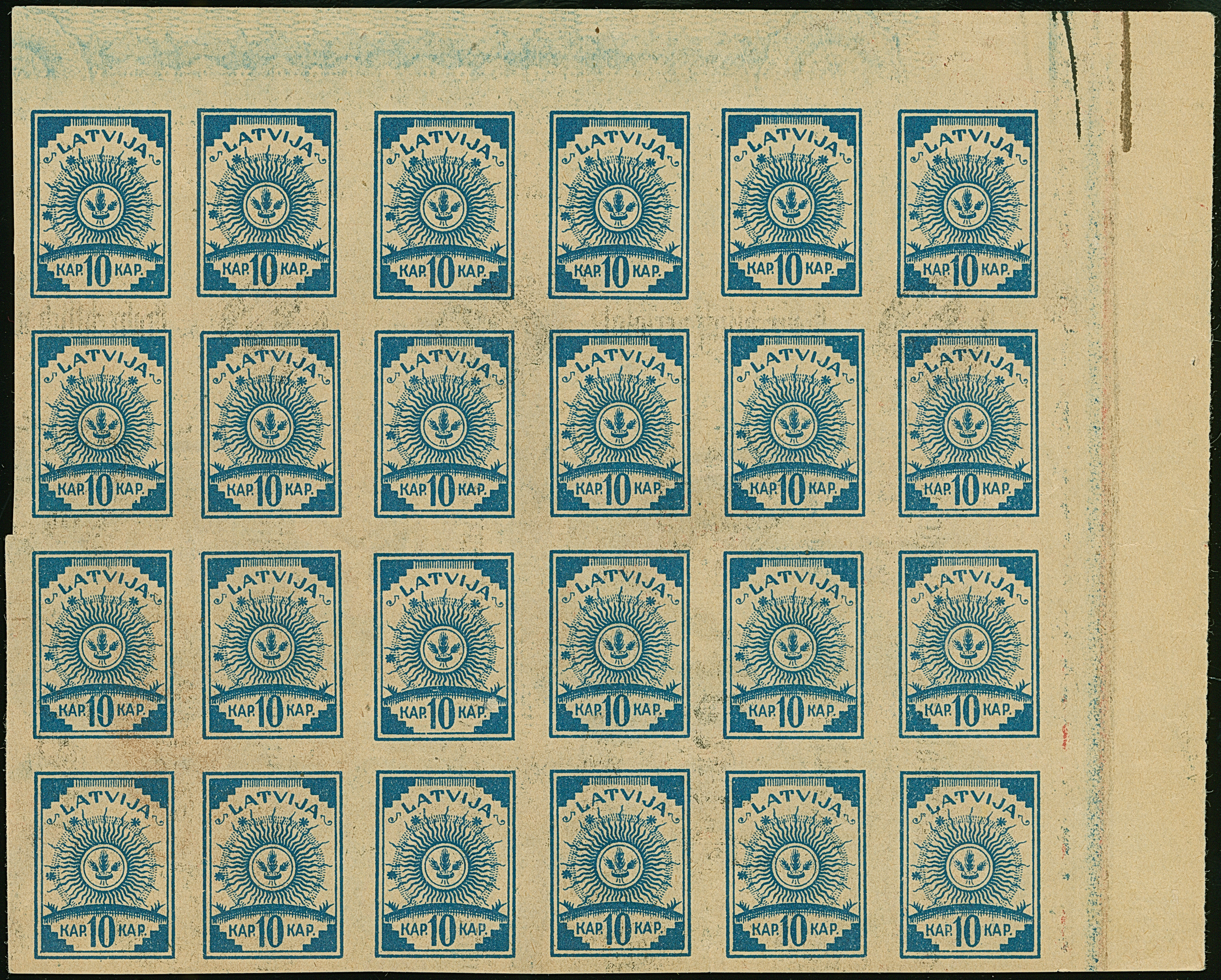 1919, Ear of corn 10 kopeks blue, on multicolored label paper, block of 24 from the upper right sheet corner, without gum, fine and attractive multiple