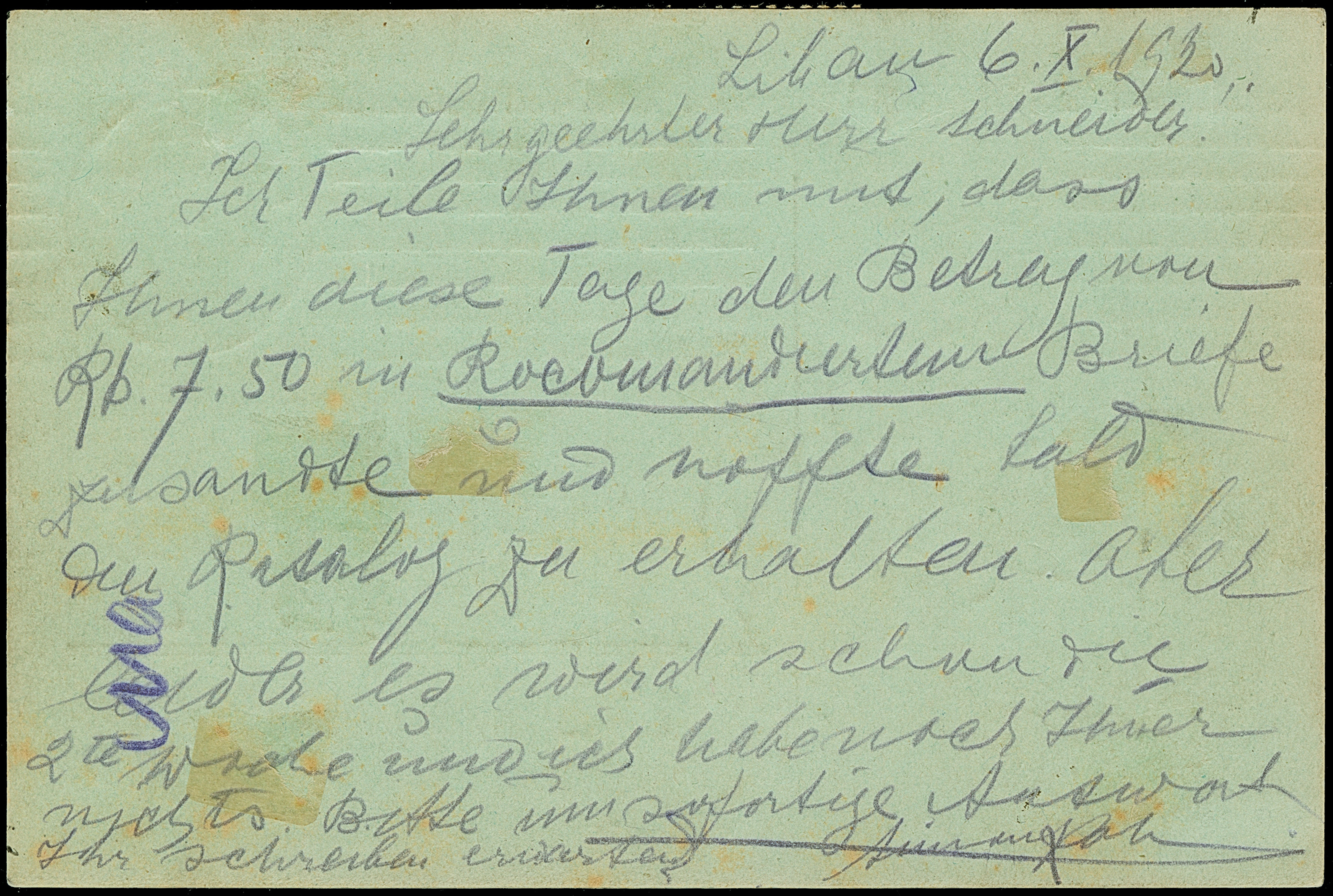 1919, Liberation of Courland 10m kopeks, diagonally bisceted with additional franking of 35 kopeks, tied by cds. "LEEPAJA LATWIJA -7.10.20" to postcard to Riga with arrival mark on front, somewhat stained, very scarce with only few known