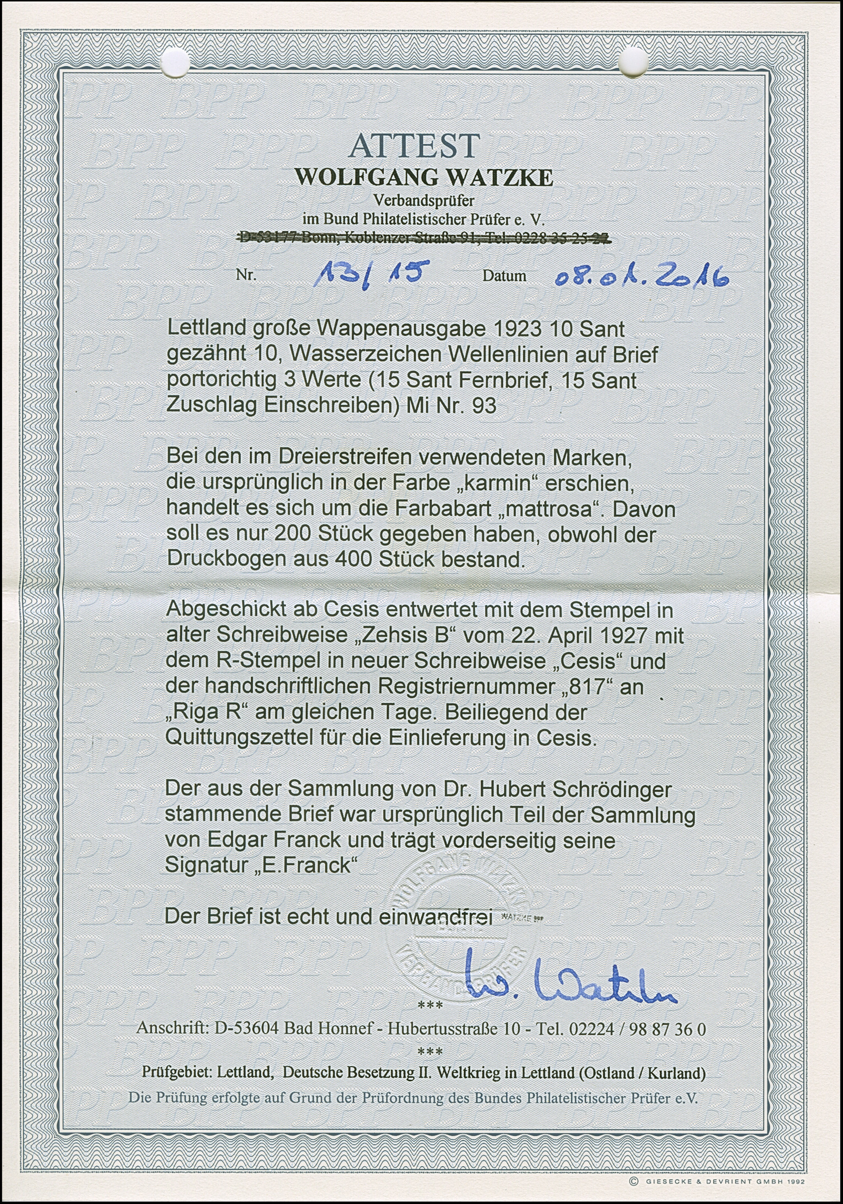 1923, Coat of arms 10 senti, Error of colour, dull pink, horizontal strip of three tied by cds. "ZEHSIS 22 4 27" to registered cover to Riga with arrival cds. on reverse, few negligible toned spots, a very attractive and unique cover, sign, E. Franck