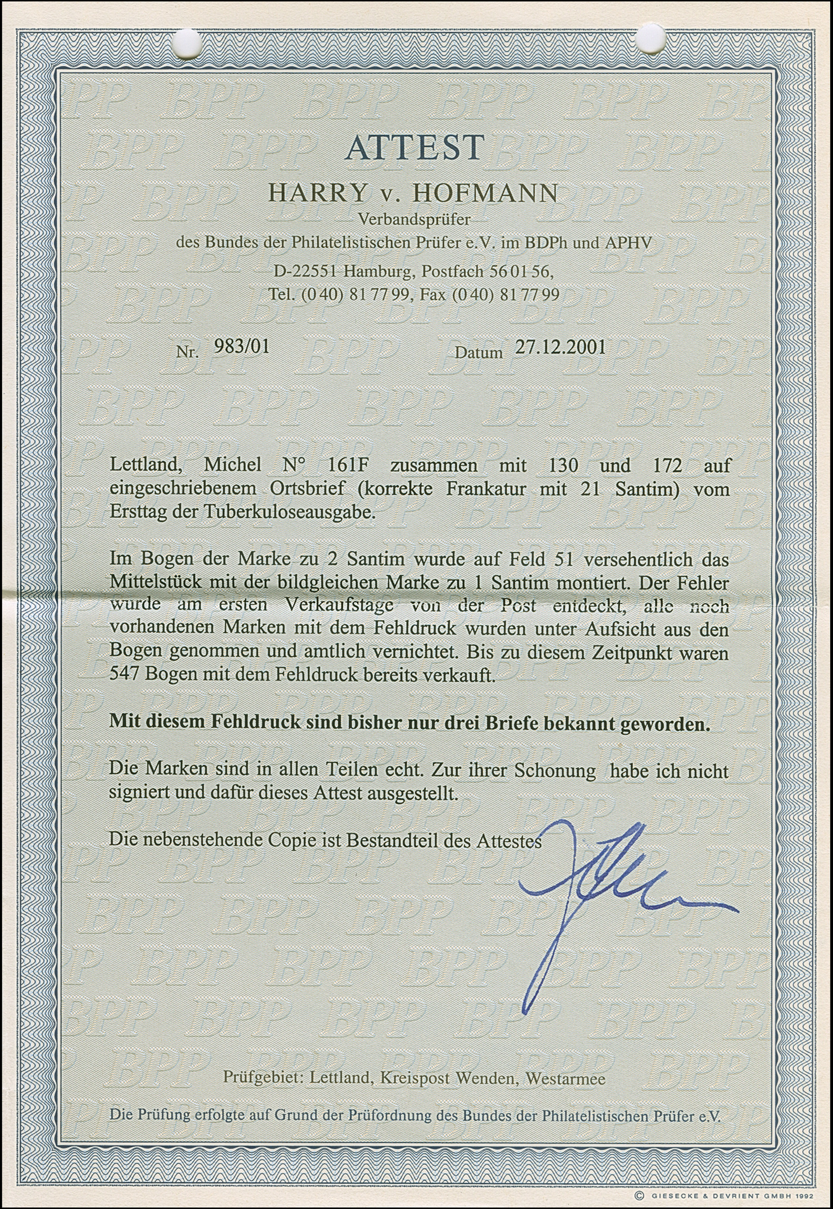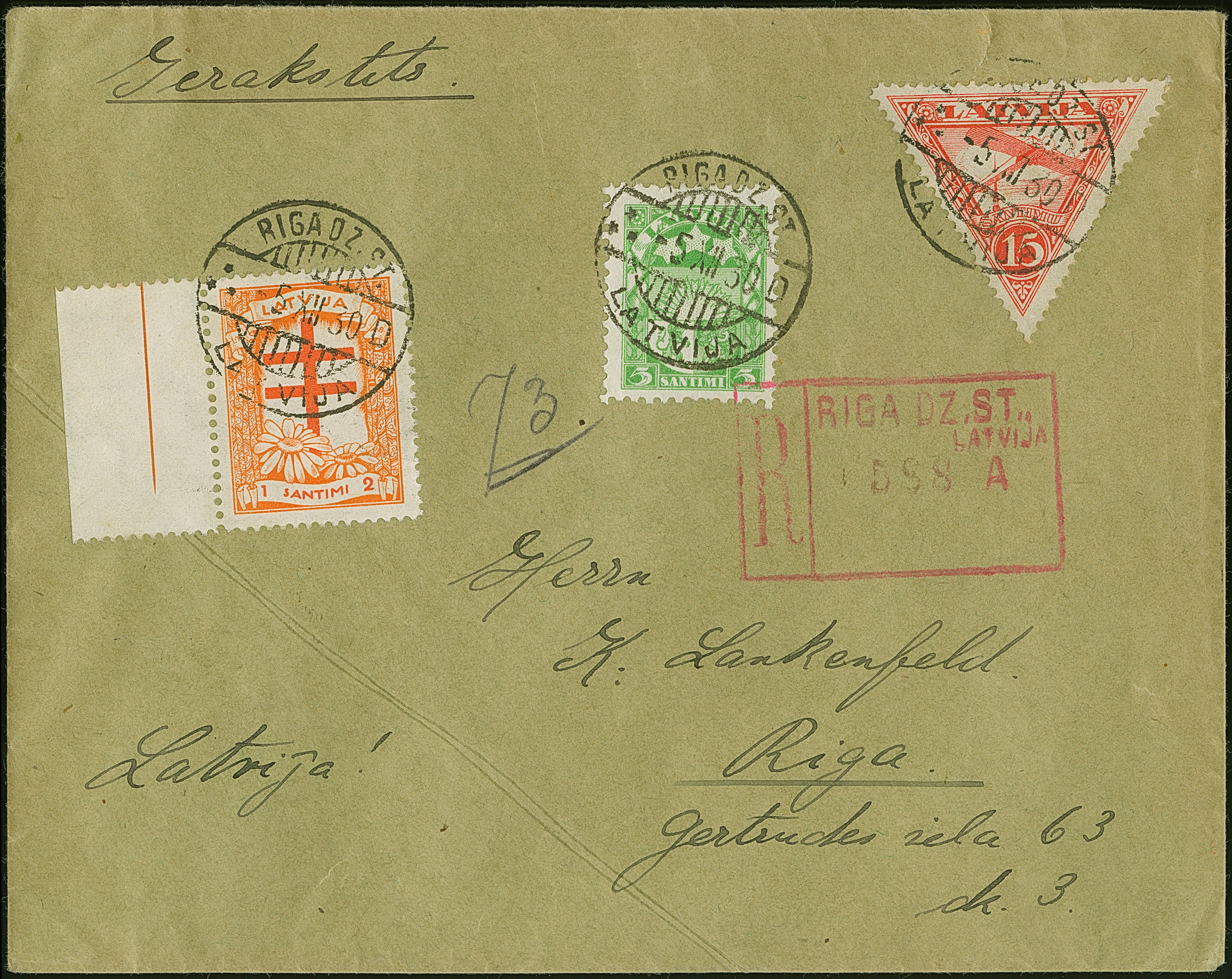 1930, Anti-Tuberculosis 1+2 senti orange/brick-red with left sheet margin, with additional franking tied by cds. "RIGA DZ. ST. -5.XII.30" to local registered letter, with receipt of posting, very fine. One of the great rarities of Latvia, this being one of only 4 covers known with this prominent error, certificate von Hofmann BPP (2001)