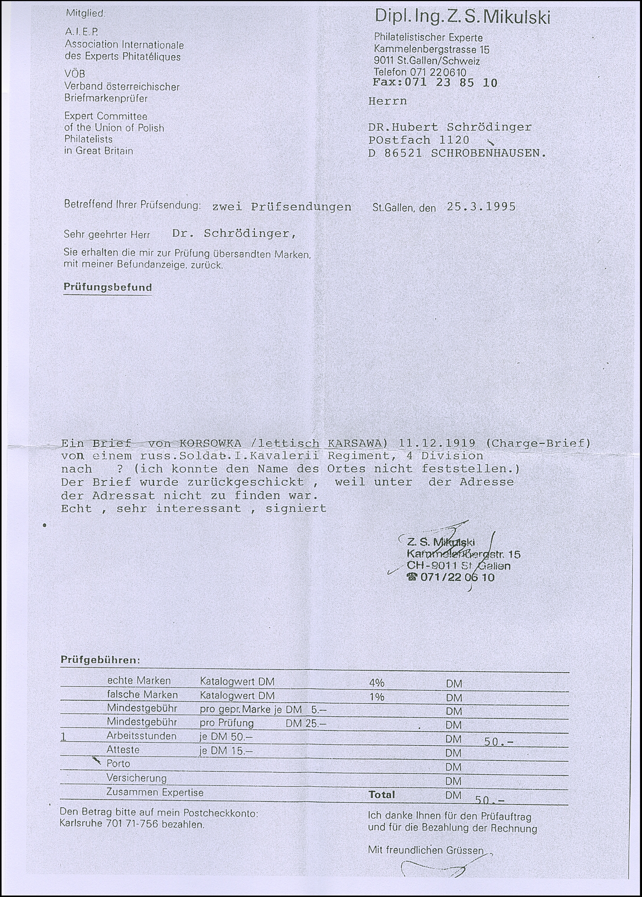 1919 December, 1 rubel imperforated, two vertical pairs, tied by post - Imperial but cyrillic cds. "KORSOVKA LATVIA " a " 11 12 19" [ von Hofmann 121 . 1 ] to reverse of slightly stained cover from a soldier who gives his address on the front of the envelope as 1 " Cavalry regiment , 4 " Division , and addresses his letter to a private residence in Rezhitsa (Latvian Rezekne ). Franked at 4 roubles, the correct RSFSR Registered letter rate (Tariff of 5 November 1919). Arrival post-Imperial but cyrillic cds. " REZHITSA LATVIA " b "[von Hofmann 216.7]. Returned to sender with improvised Spravka attached indicating that the recipient could not be found at the address given. A very rare and interesting item, signed Mikulski with his opinion (1995; copy)