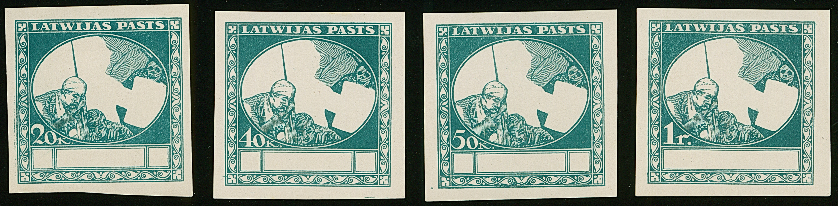 1928, Airmail 10 santimi green, imperforated archive proofs, horizontal strip of four with left sheet margin, without gum, fine