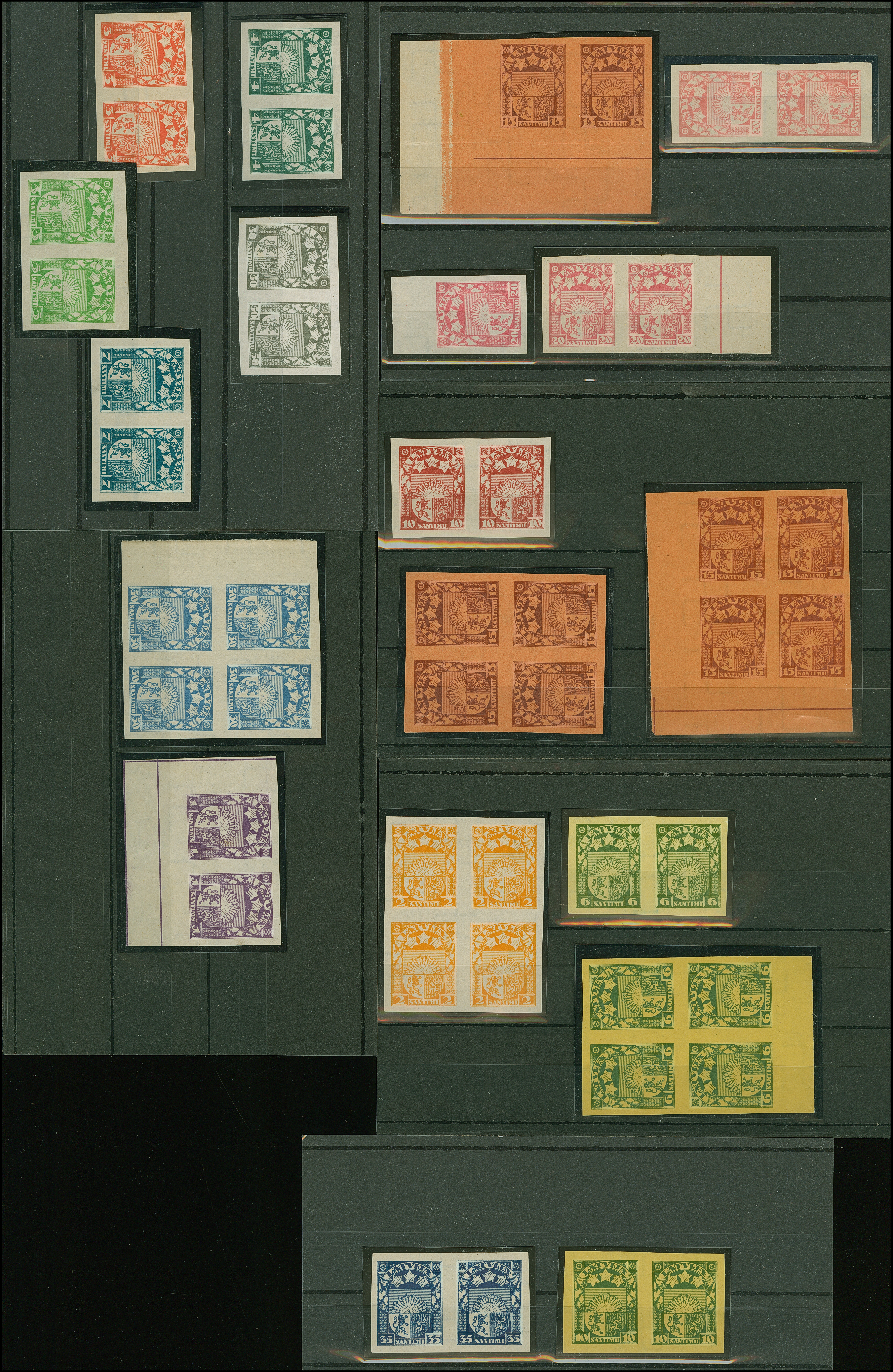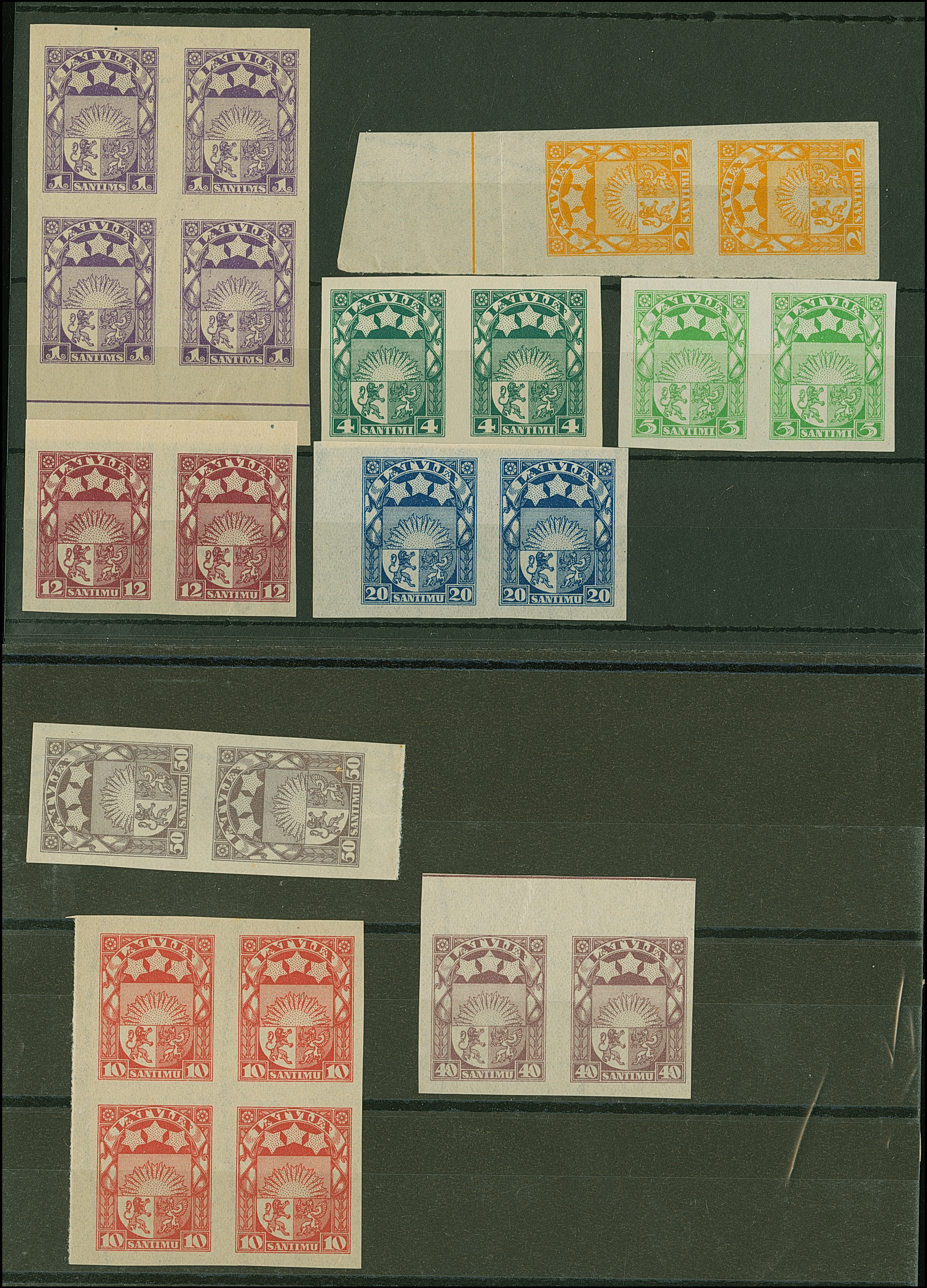1924/25, Coat of arms 1-50 santimi, imperforated archival proofs, mostly horizontal pairs, 1 and 10 santimi as block of four, without gum, fine