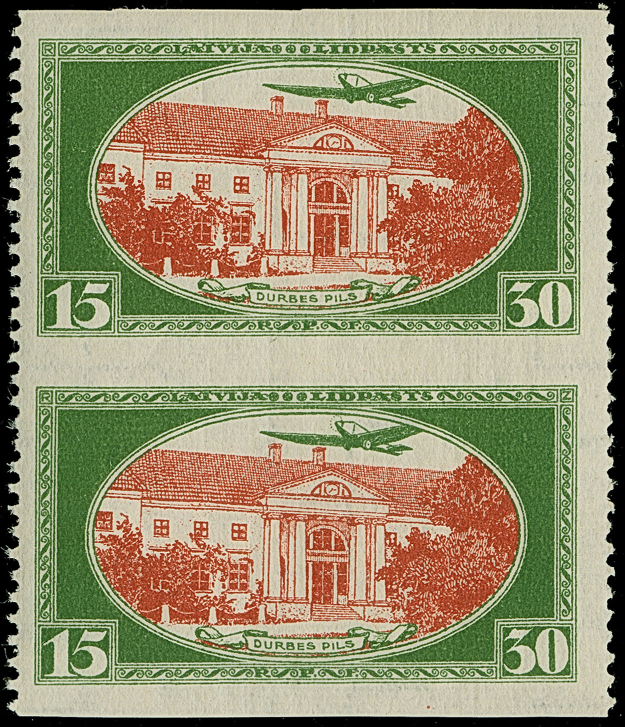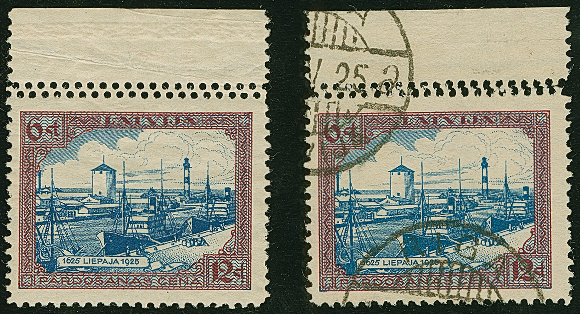 1925, Tercentenary of Liepaja 6 santimi, with upper margin with double perforation, mint never hinged and used, the latter one slightly separated, otherwise fine, scarce