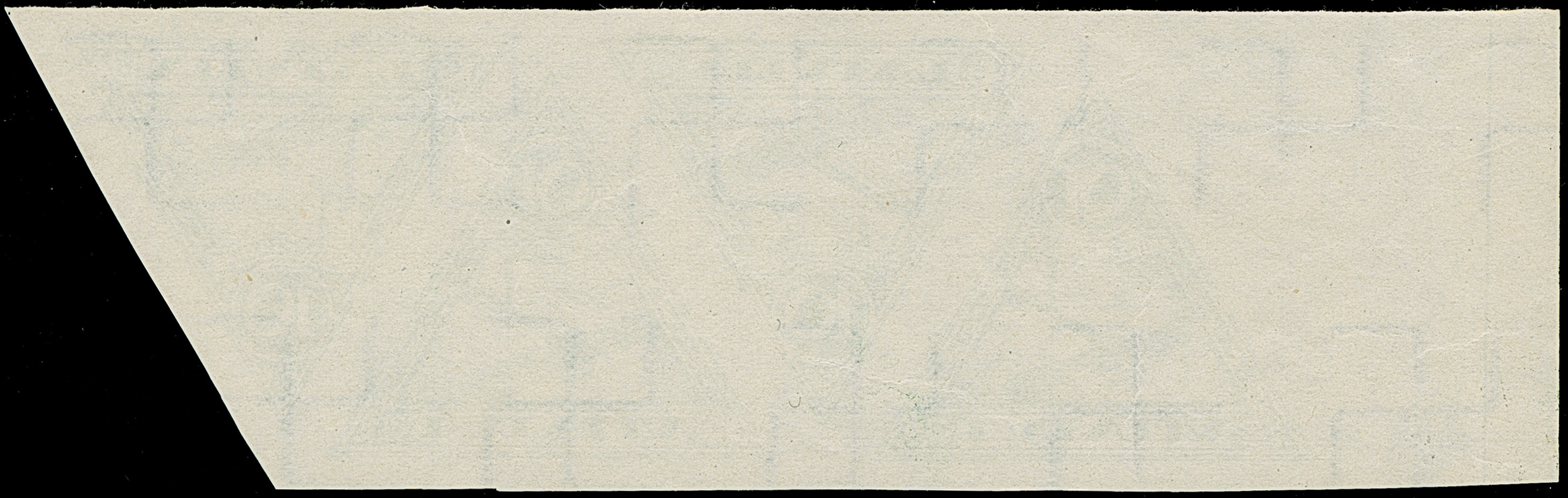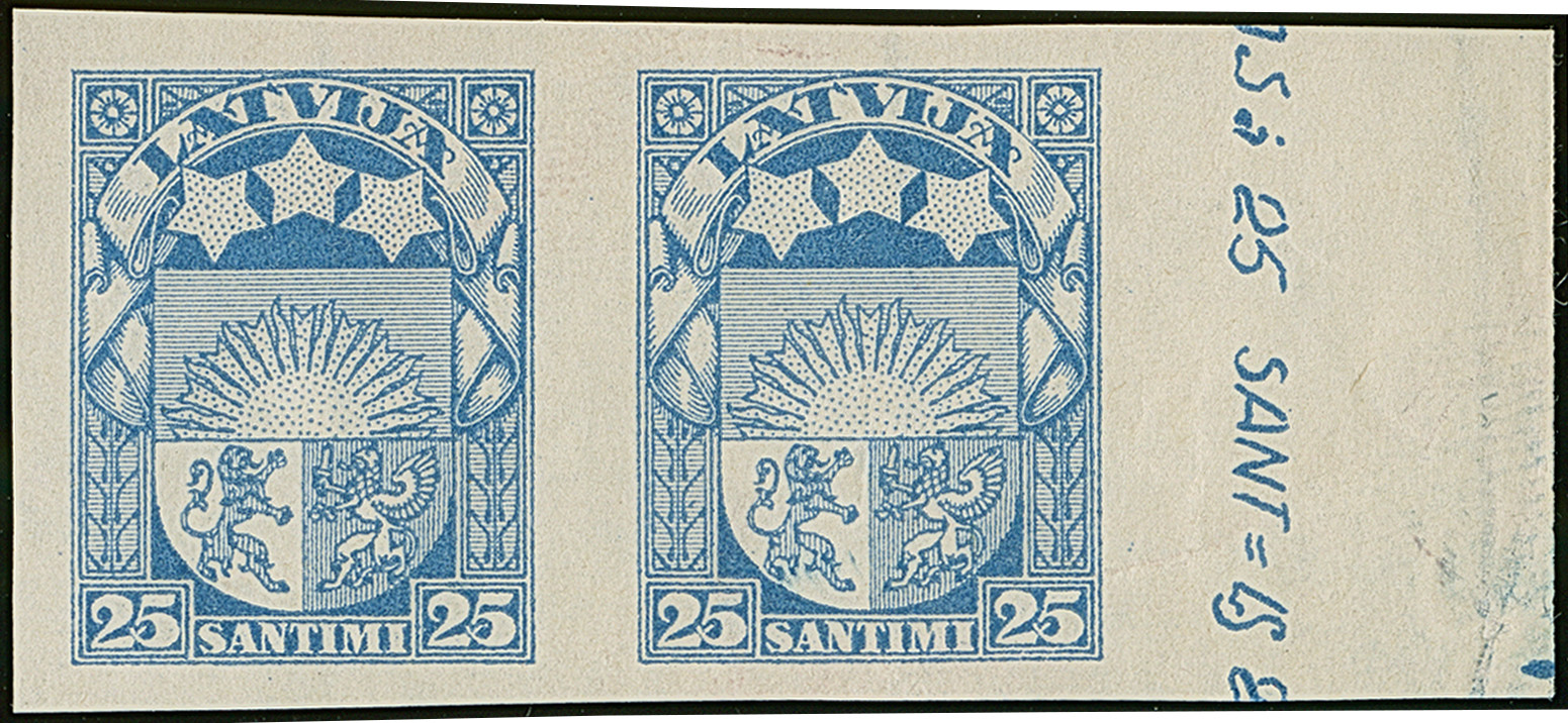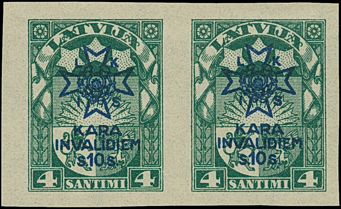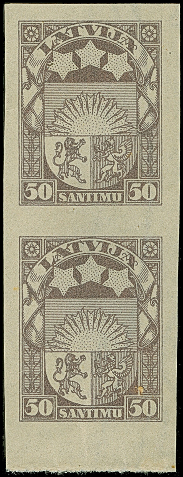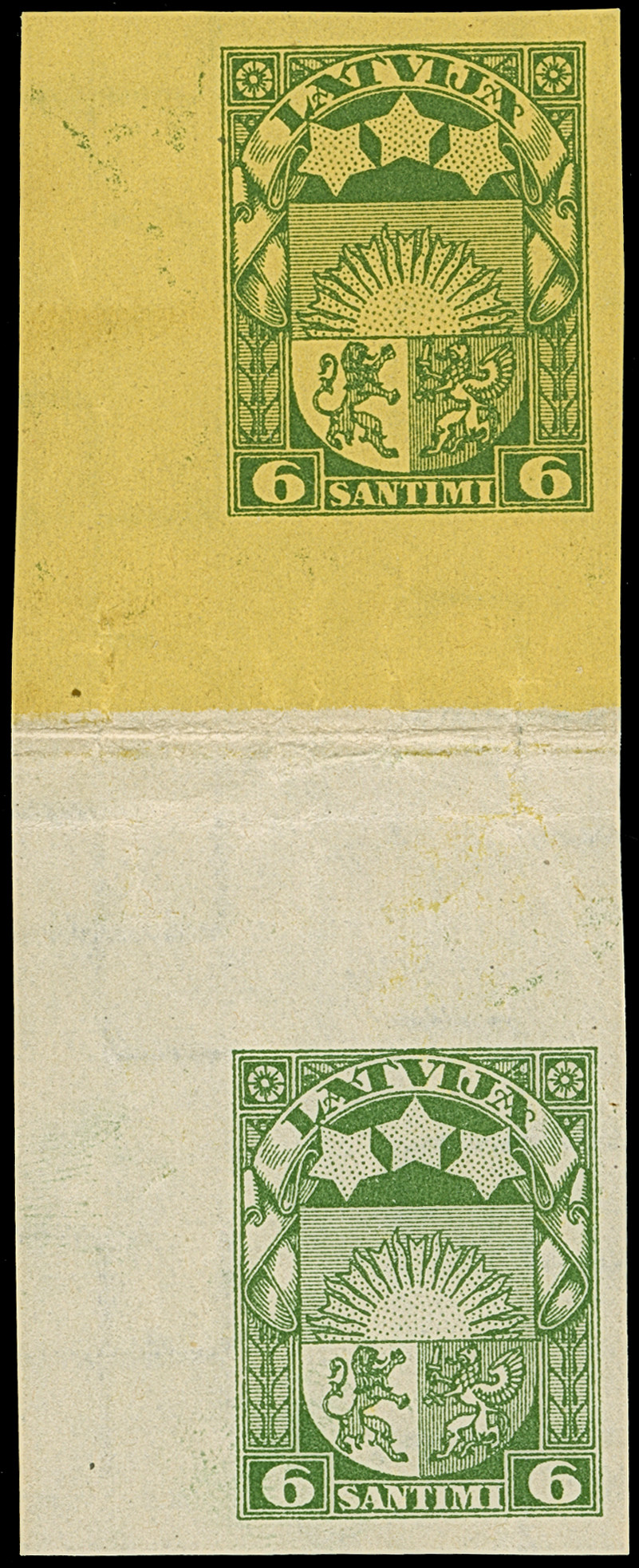 1927, Coat of arms 6 santimi, proof, imperforated vertical gutter pair, the upper stamp in green on yellow, the lower green on white, without gum, heavily folded in the gutter, very scarce, fine