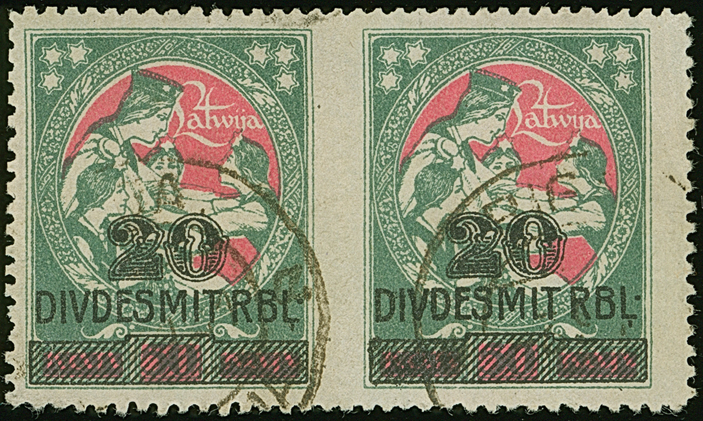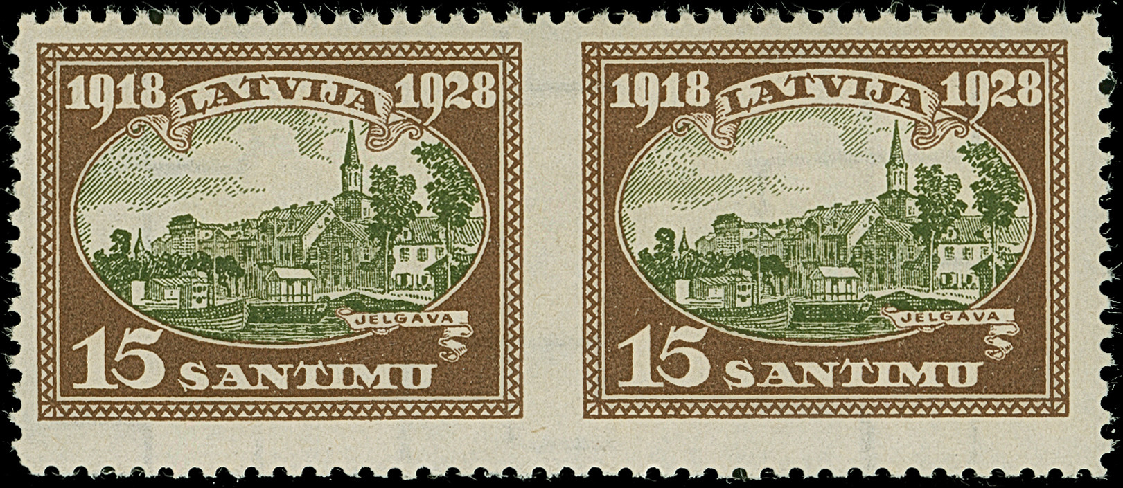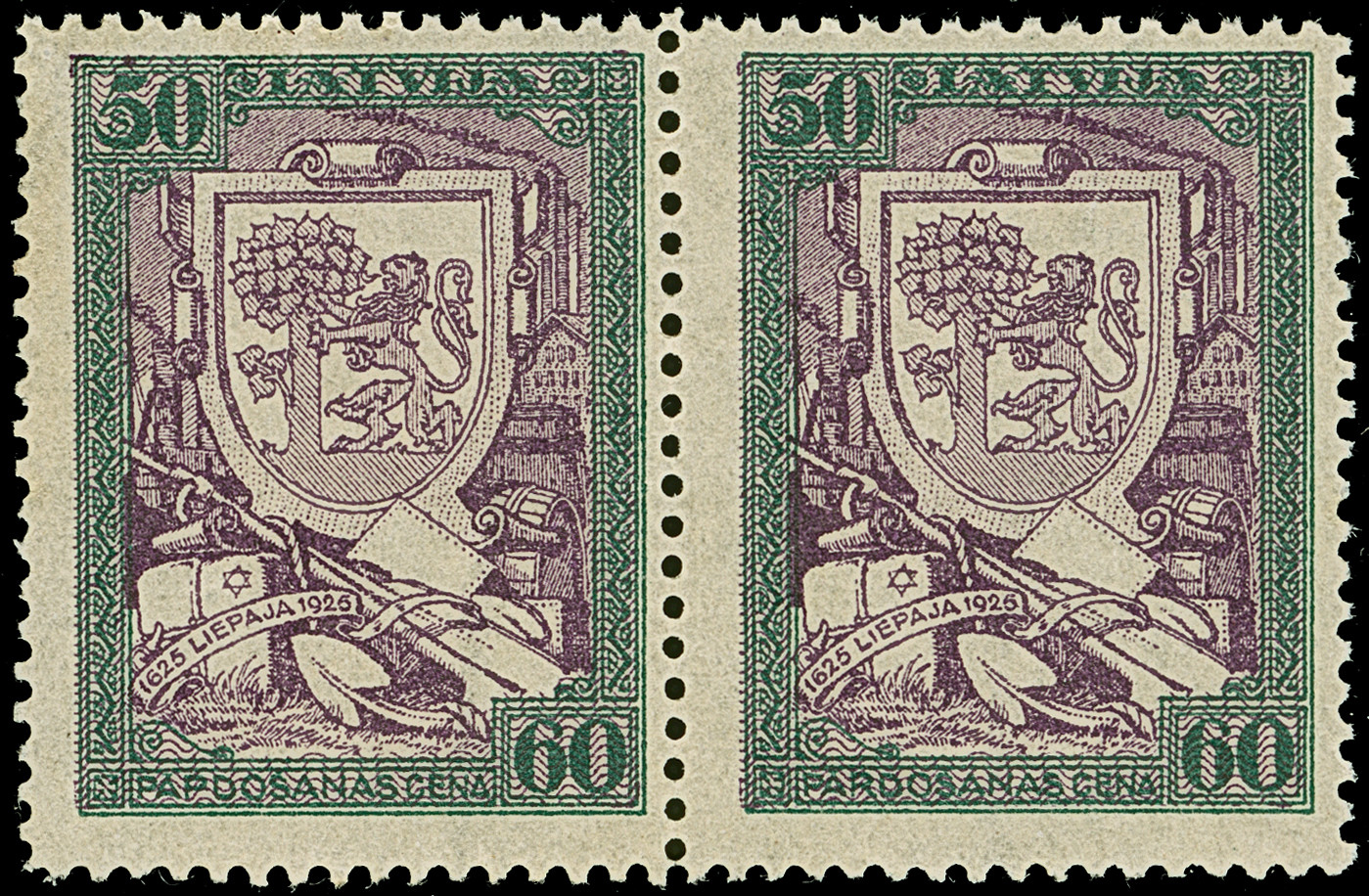 1925, Tercentenary of Liepaja 50 santimi perforated, horizontal pair, the left stamp from position 19 with plate flaw “PAPDOŠANAS instead of PARDOŠANAS”, mint never hinged, fine