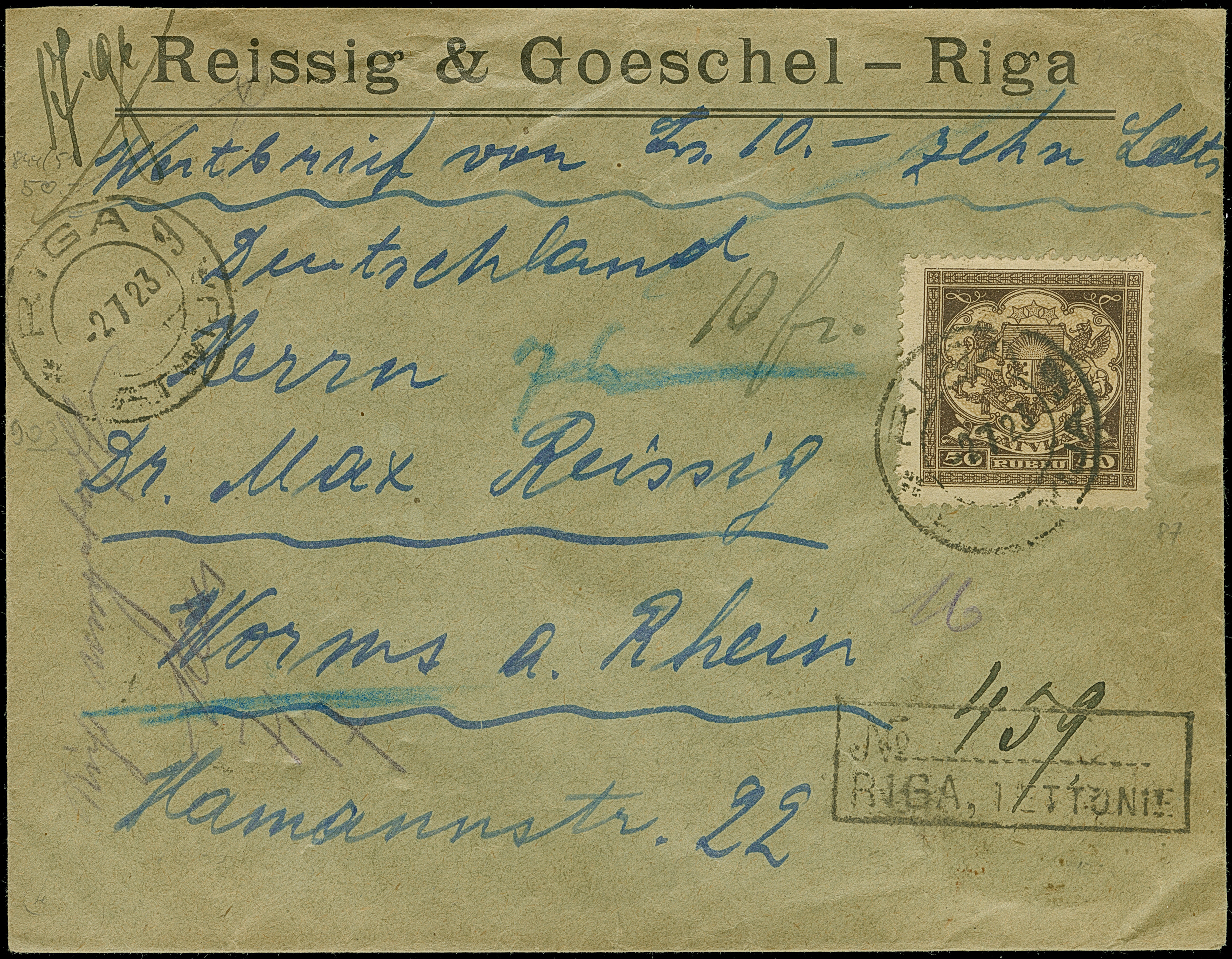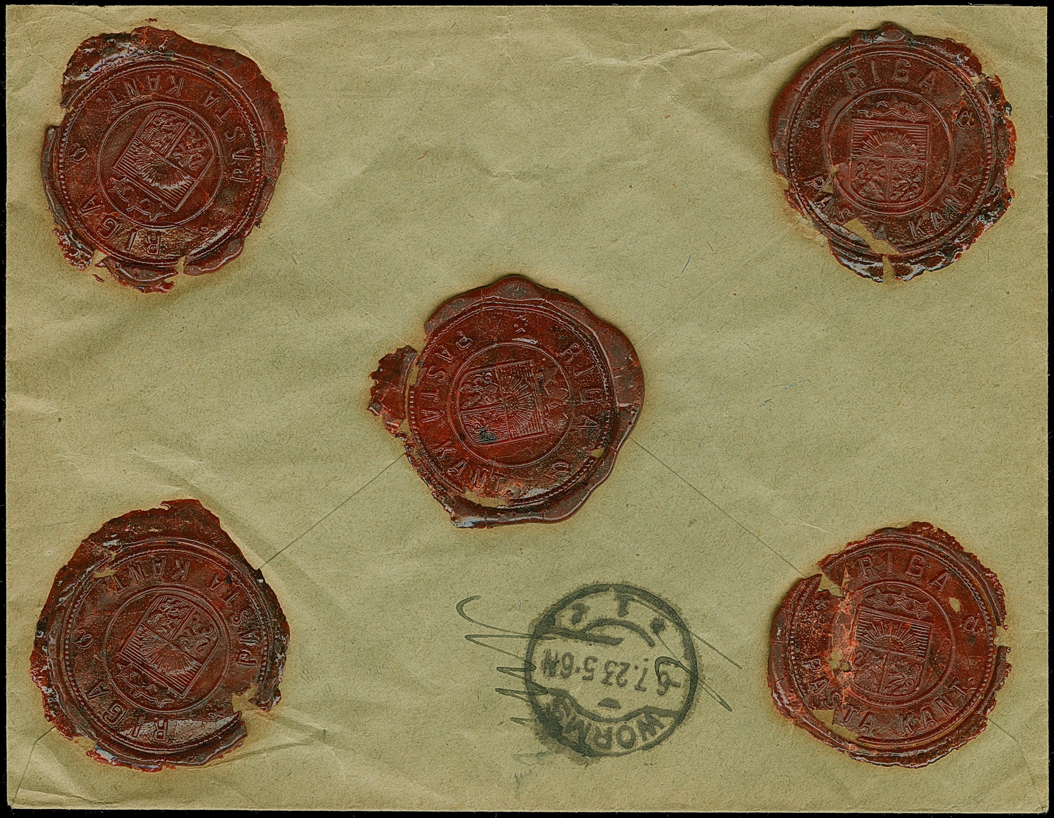 1922, Coat of arms 50 rubel brown, tied by cds. “RIGA -2 7 23” to value declared letter to Worms with arrival mark, reverse with five decorative wax seals, fine