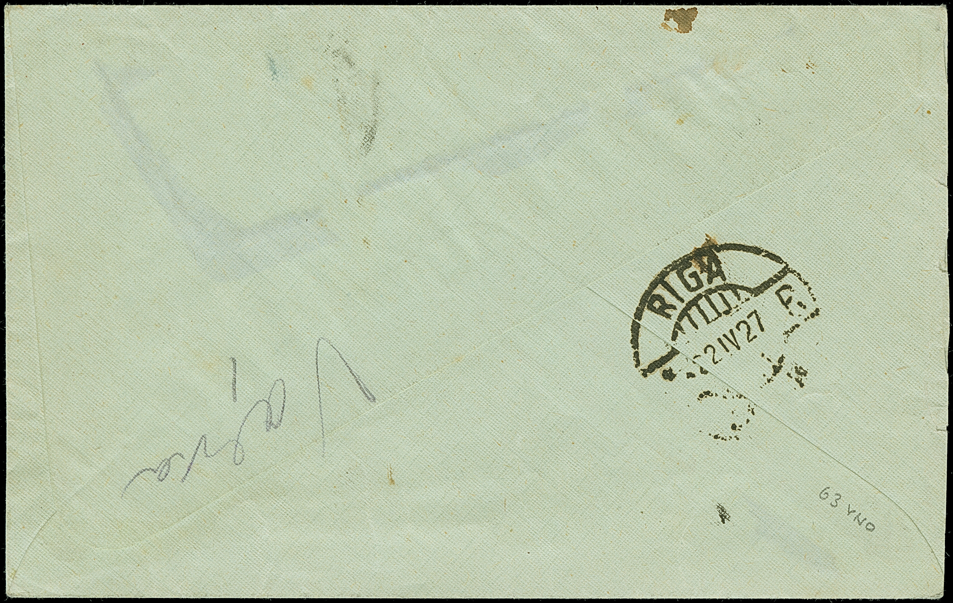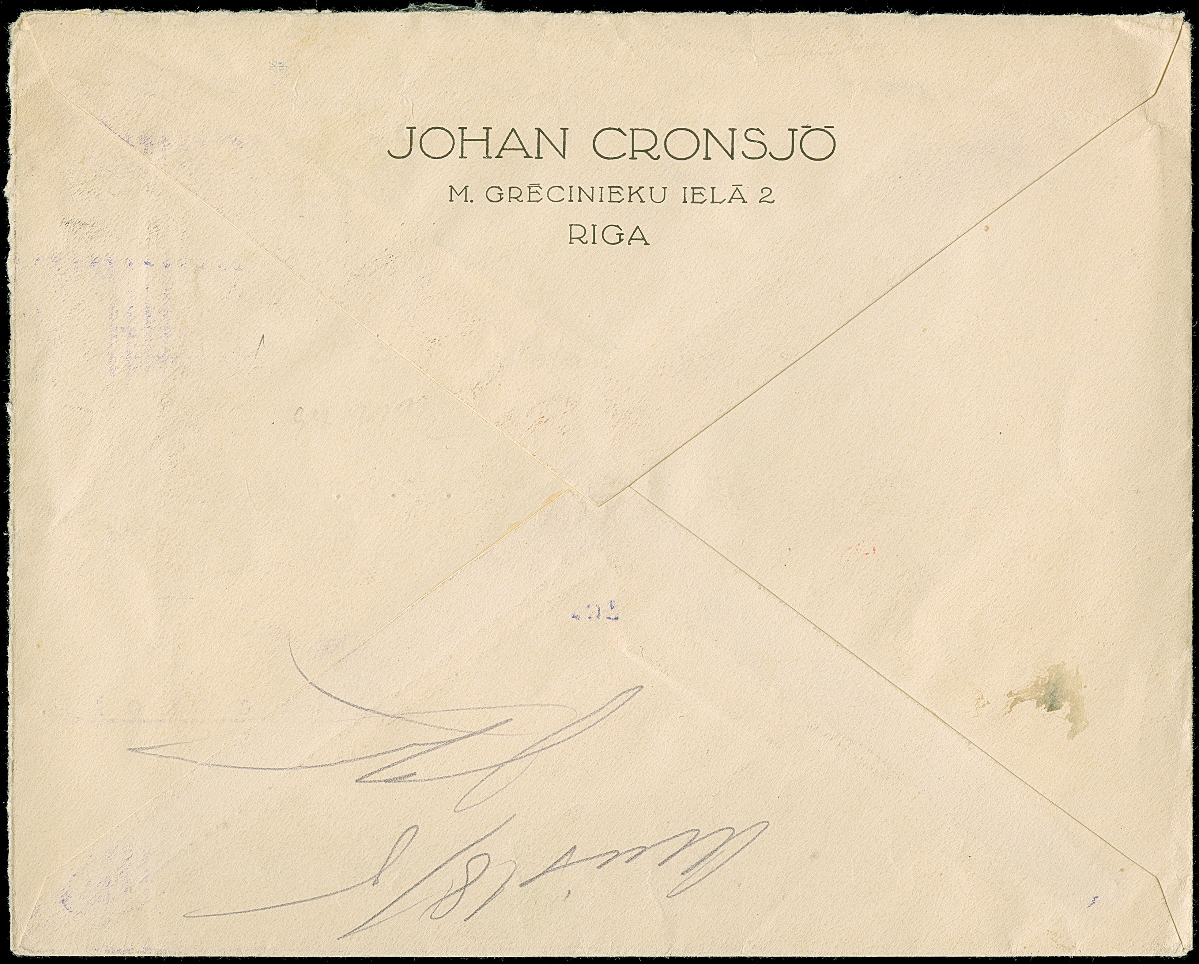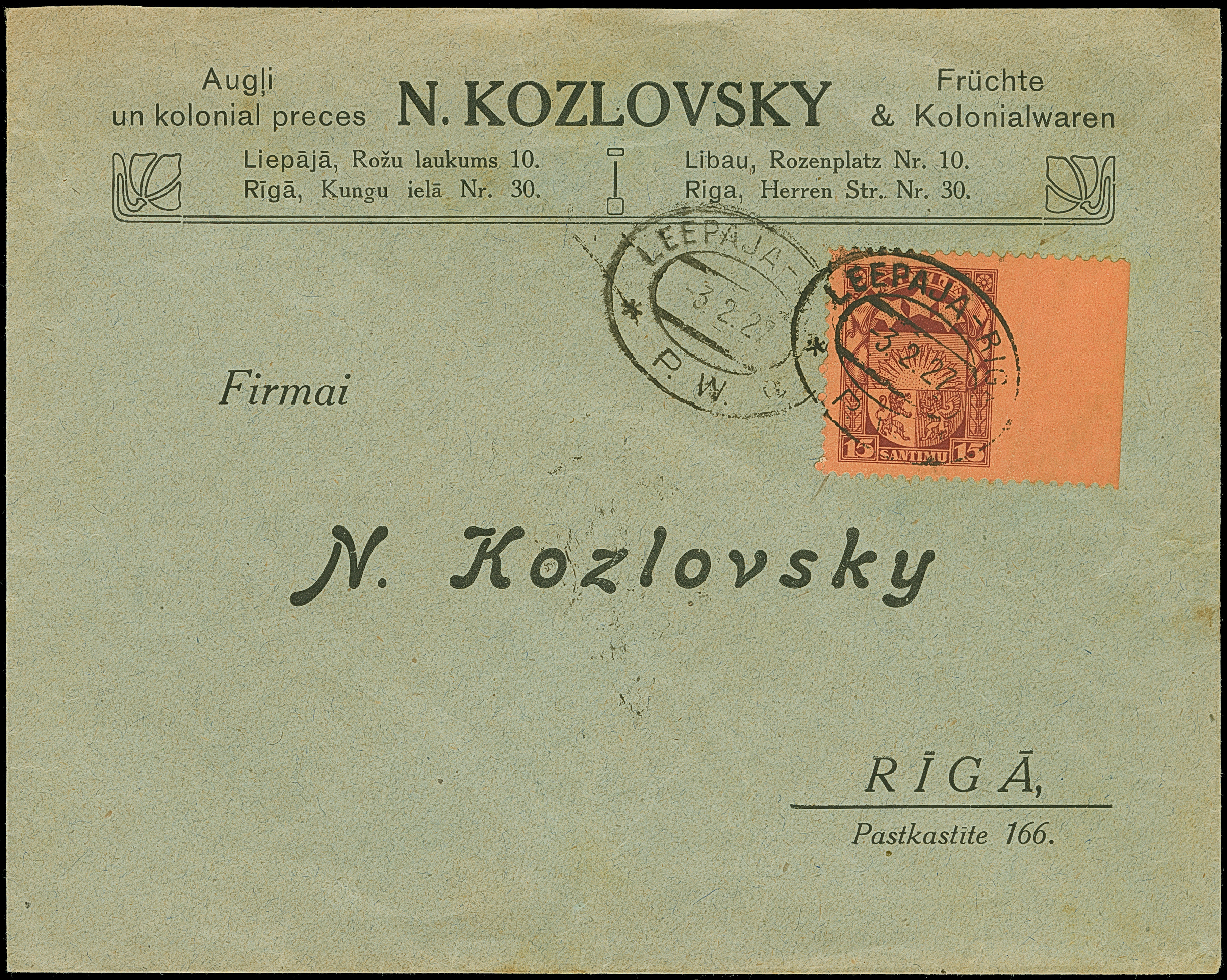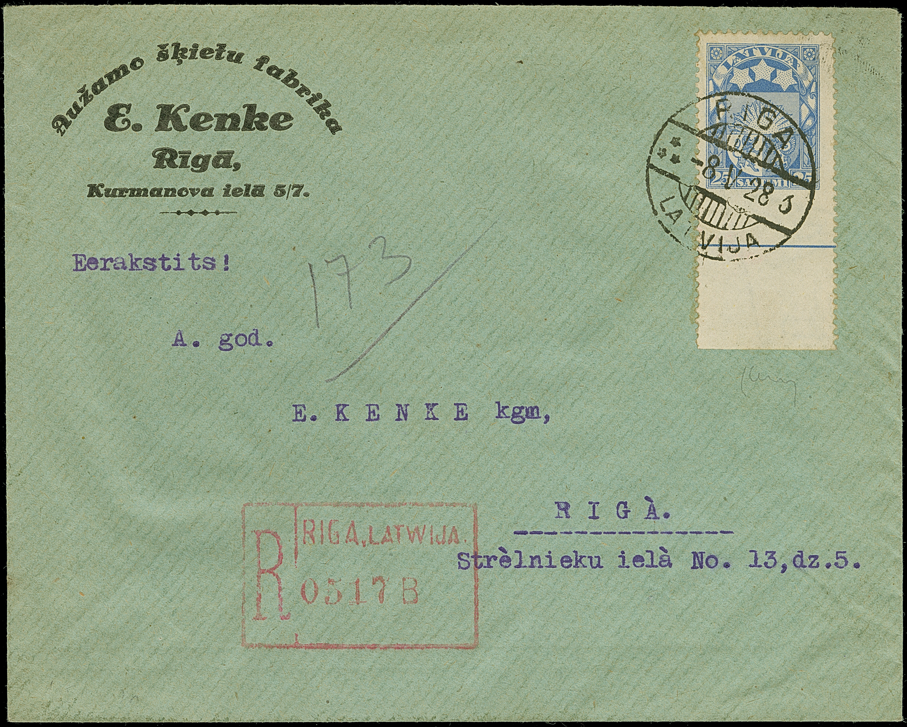 1925, Coat of arms 25 santimi blue, imperforated at bottom with large sheet margin, tied by cds. "RIGA -8.V.28" to registered local cover, scarce, fine