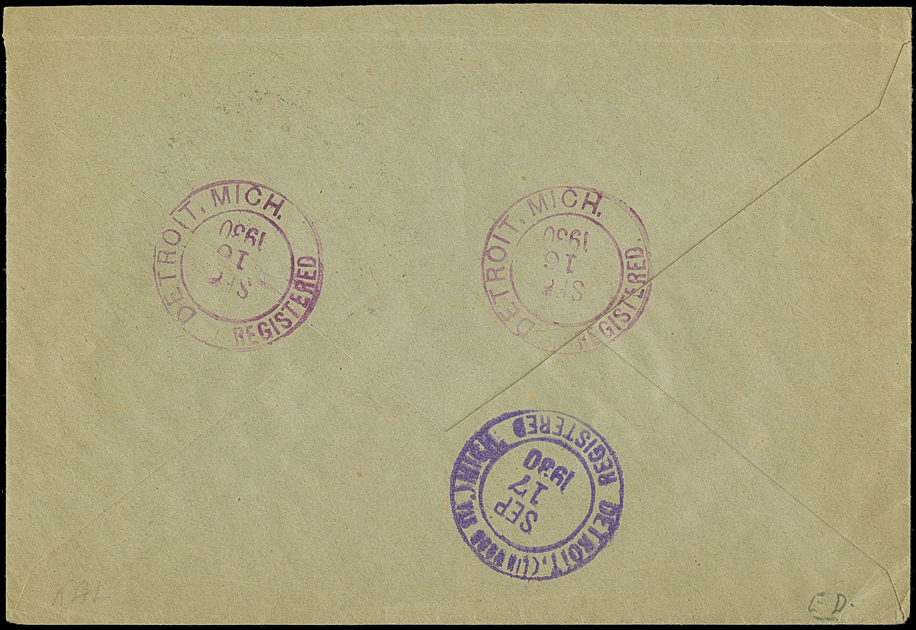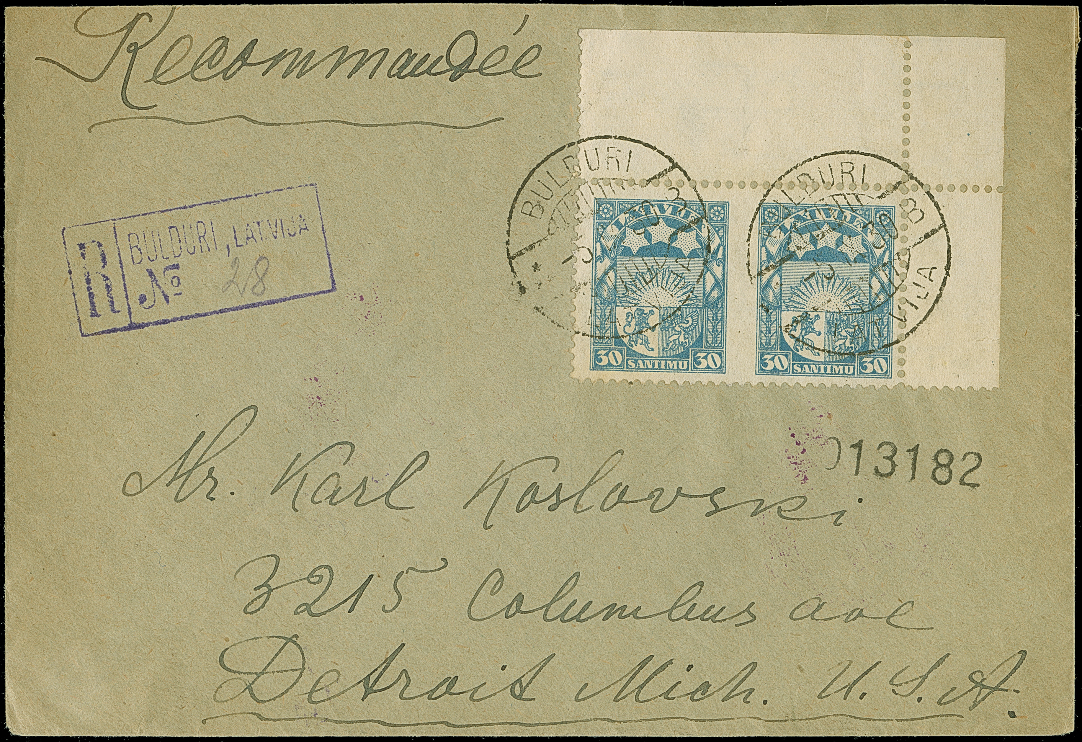 1927, Coat of arms 30 santimi blue, horizontal pair from the upper left sheet margin, imperforated at top, tied by cds. “RIGA -4.9.30” to registered cover to Detroit with arrival mark, fine and attractive