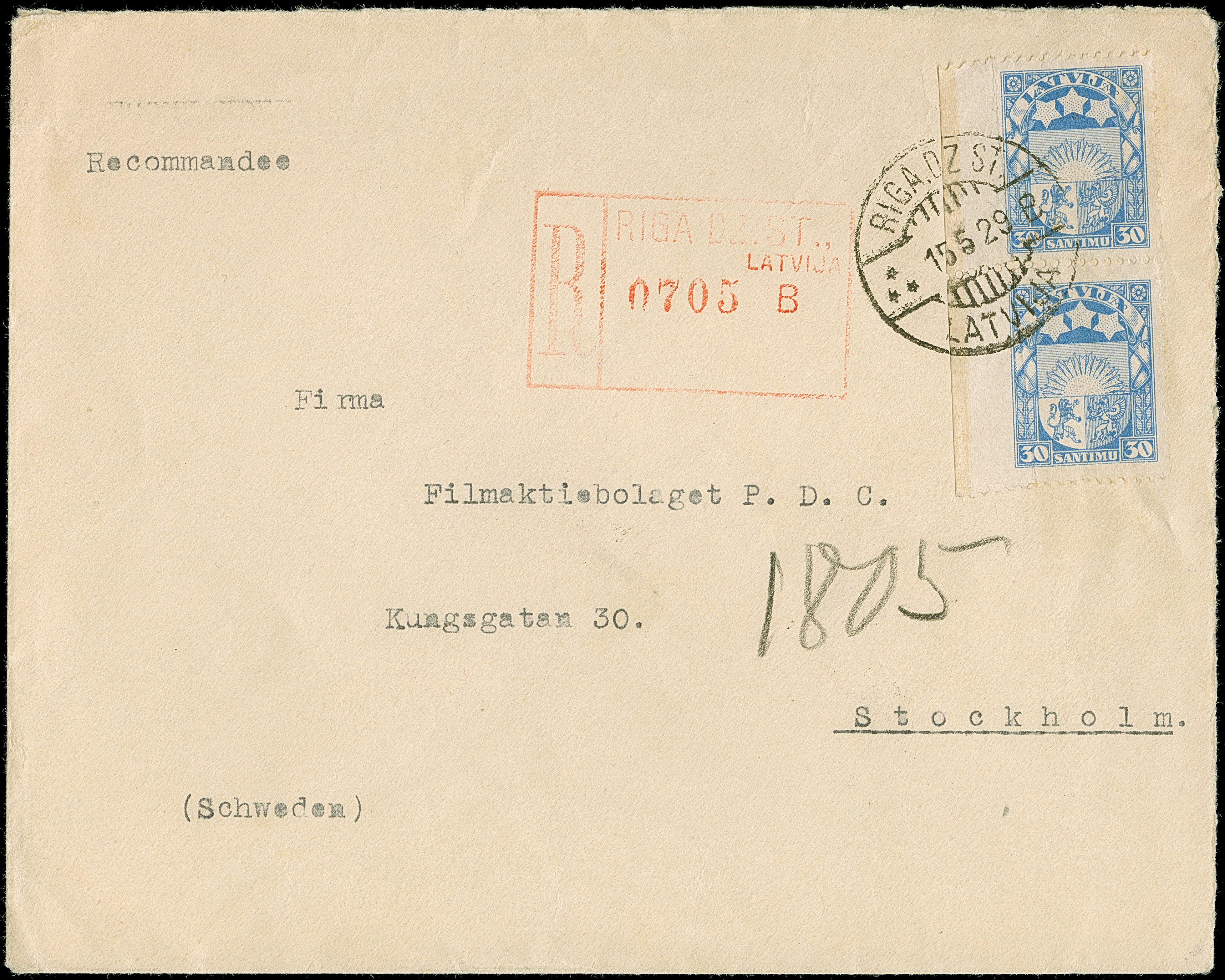 1927, Coat of arms 30 santimi blue, vertical pair with left sheet margin, imperforated at left, tied by cds. “RIGA 15 5 29” to registered cover to Stockholm, fine and attractive