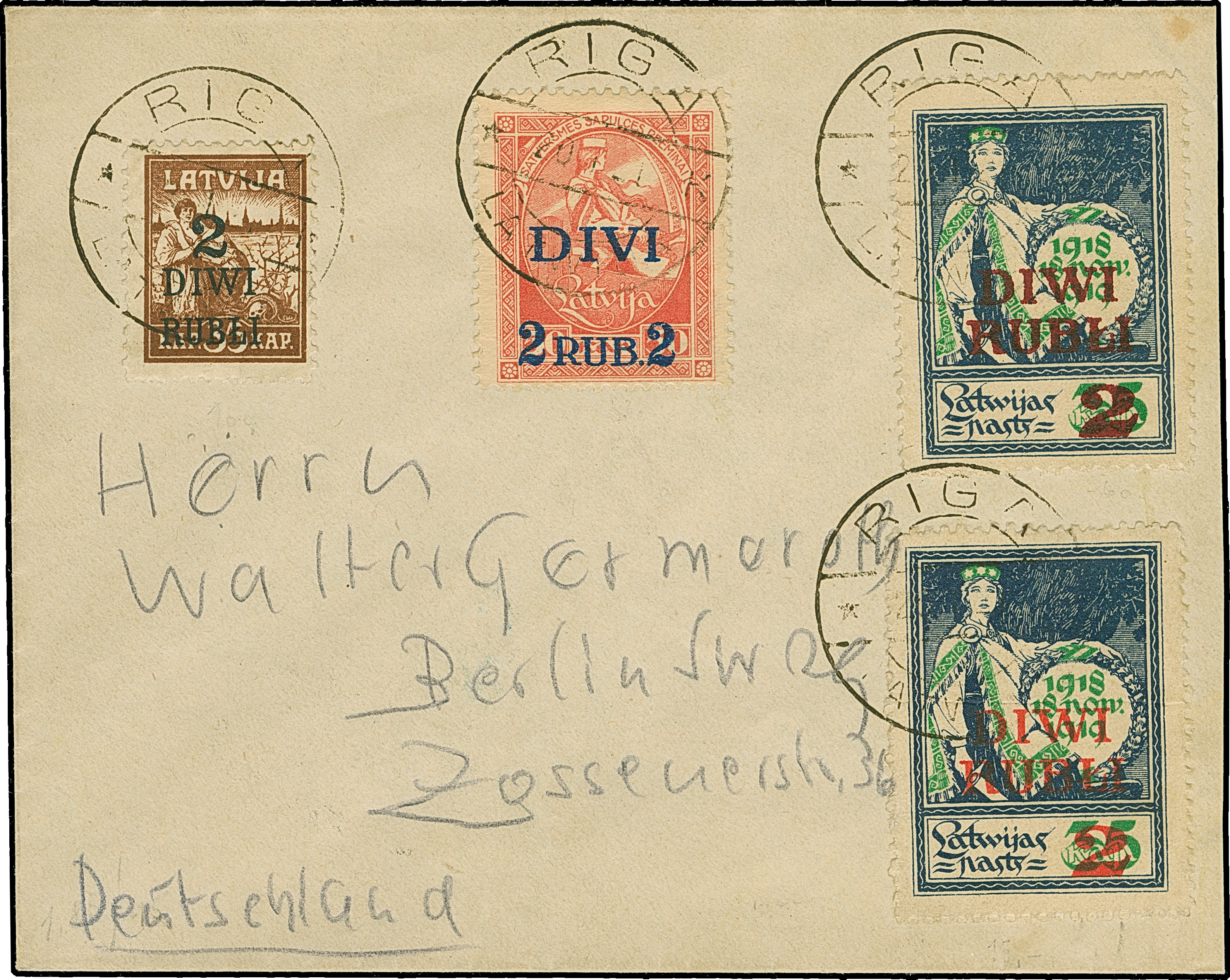 2 rubel with red-orange overprint with additional franking, tied by cds. "RIGA 20 1 21" to cover addressed to Berlin, fine