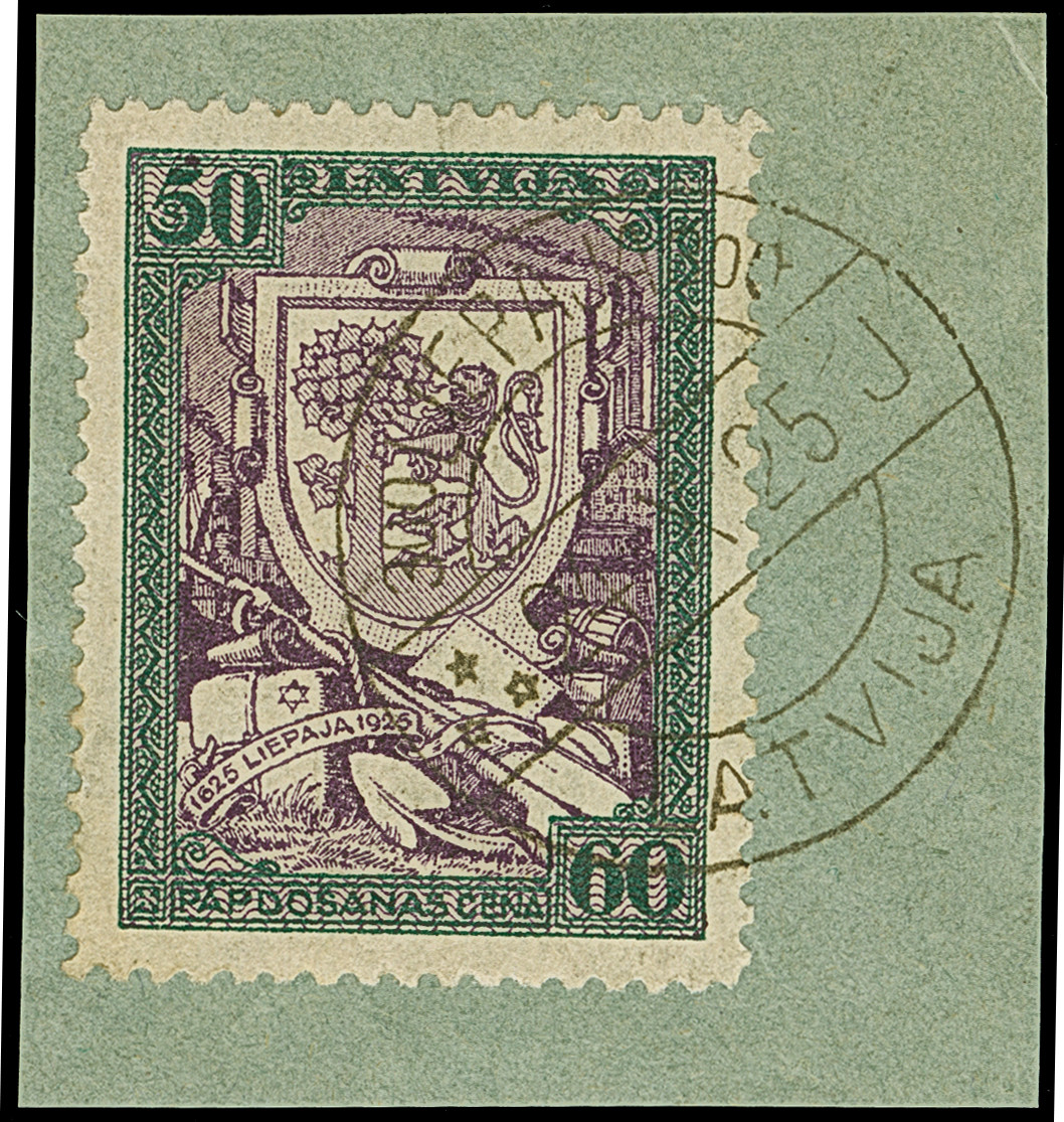 1925, Tercentenary of Liepaja 50 santimi perforated, from position 19 with plate flaw "PAPDOŠANAS instead of PARDOŠANAS", tied by special cds. to small piece, fine and attractive
