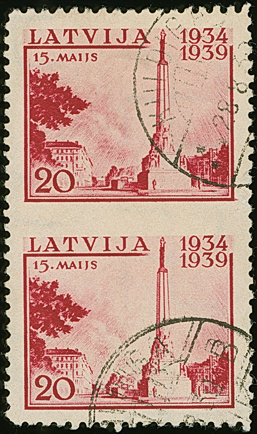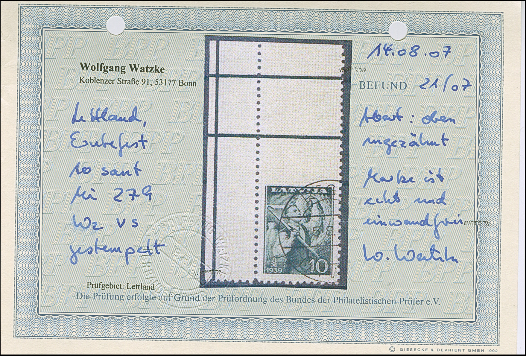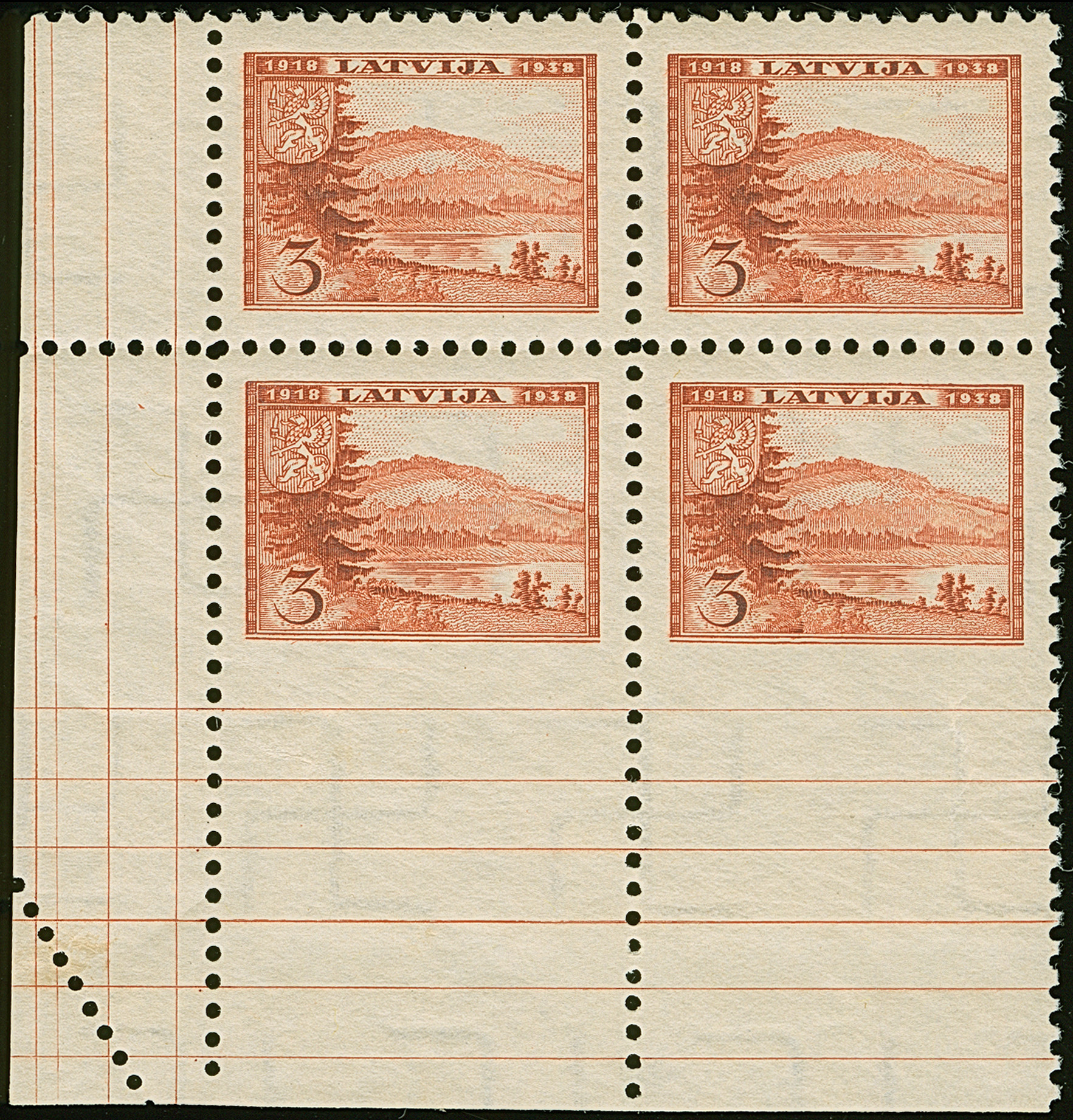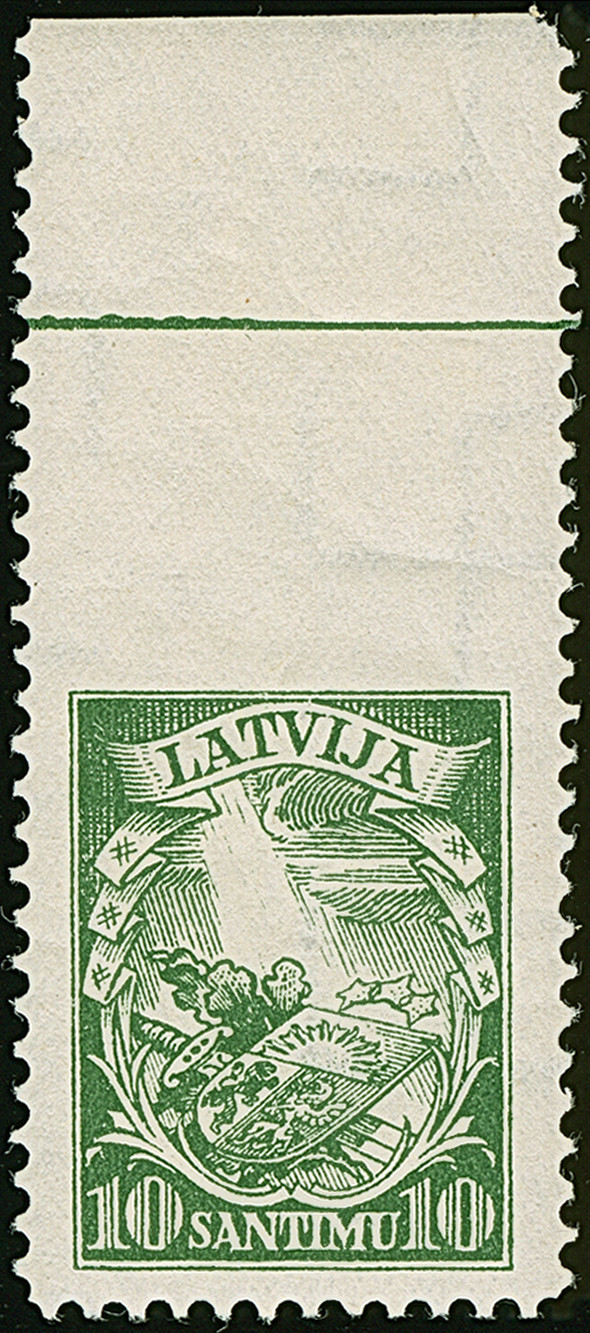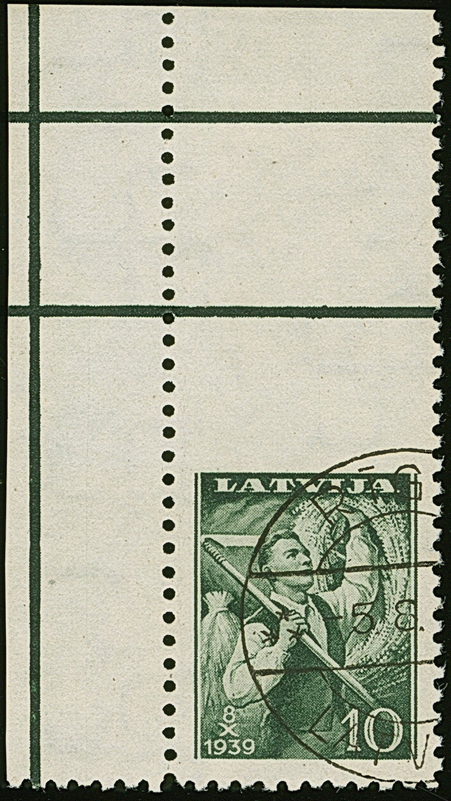 1939, Harvest Festival 10 santimi dark green, upper left sheet corner, imperforated at top, used with part cds. “RIGA”, scarce in used condition, fine, certificate Watzke BPP (2007)