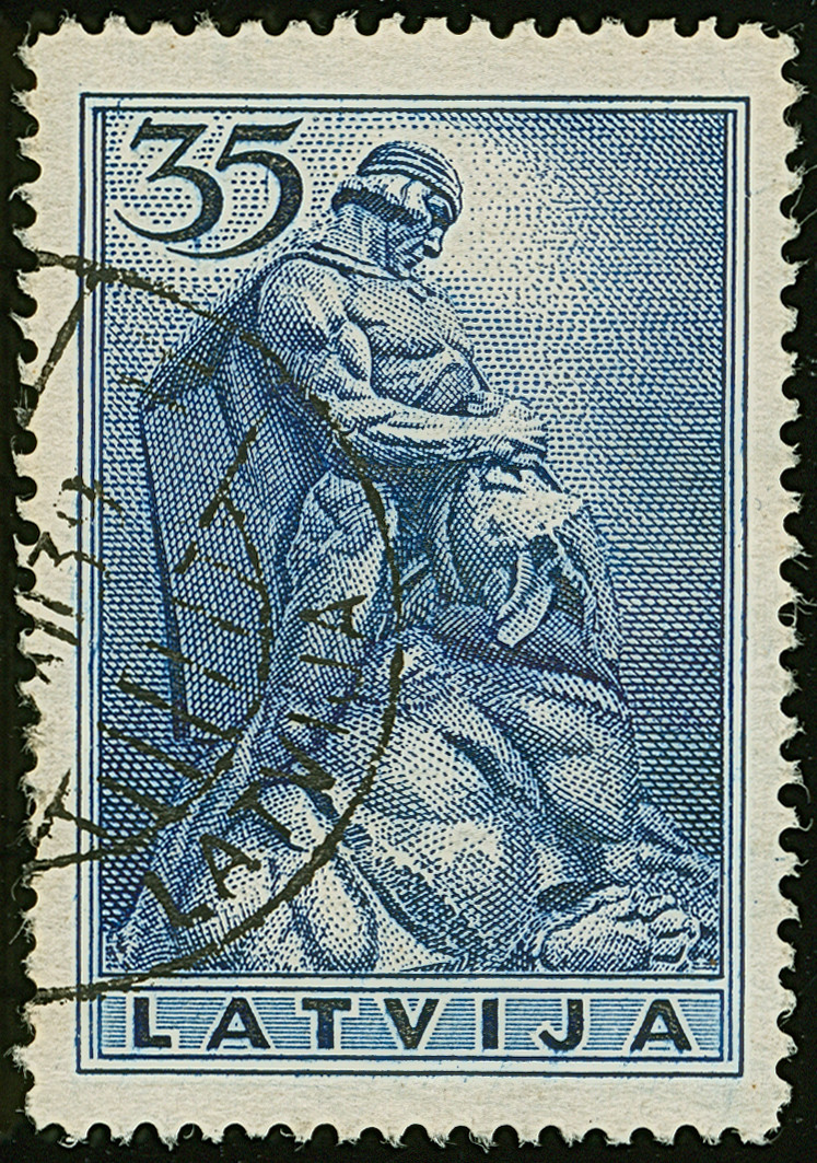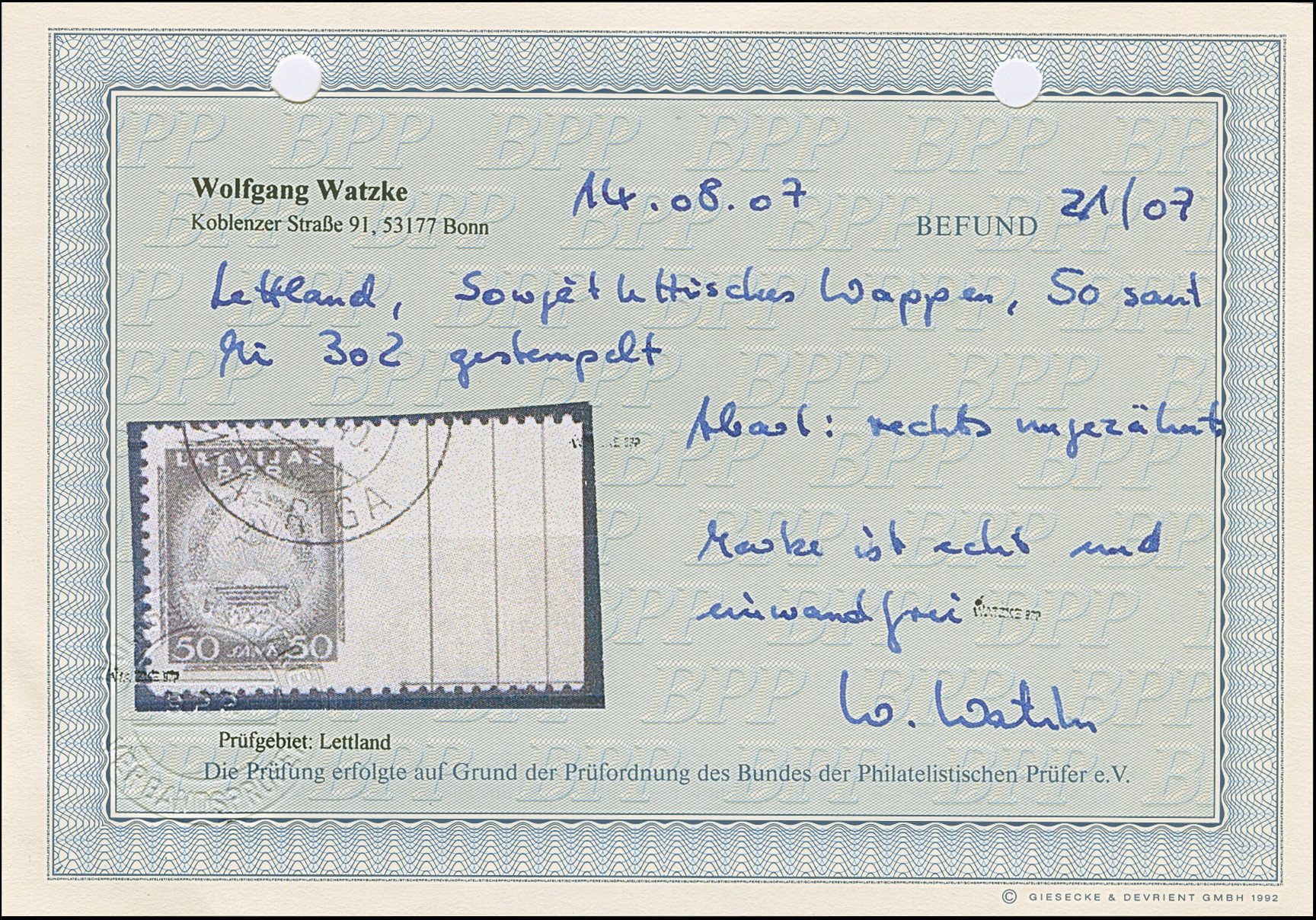 1940, Coat of arms 50 santimi gray, with right sheet margin, imperforated at right, used with part cds. “RIGA”, scarce in used condition, fine, certificate Watzke BPP (2007)