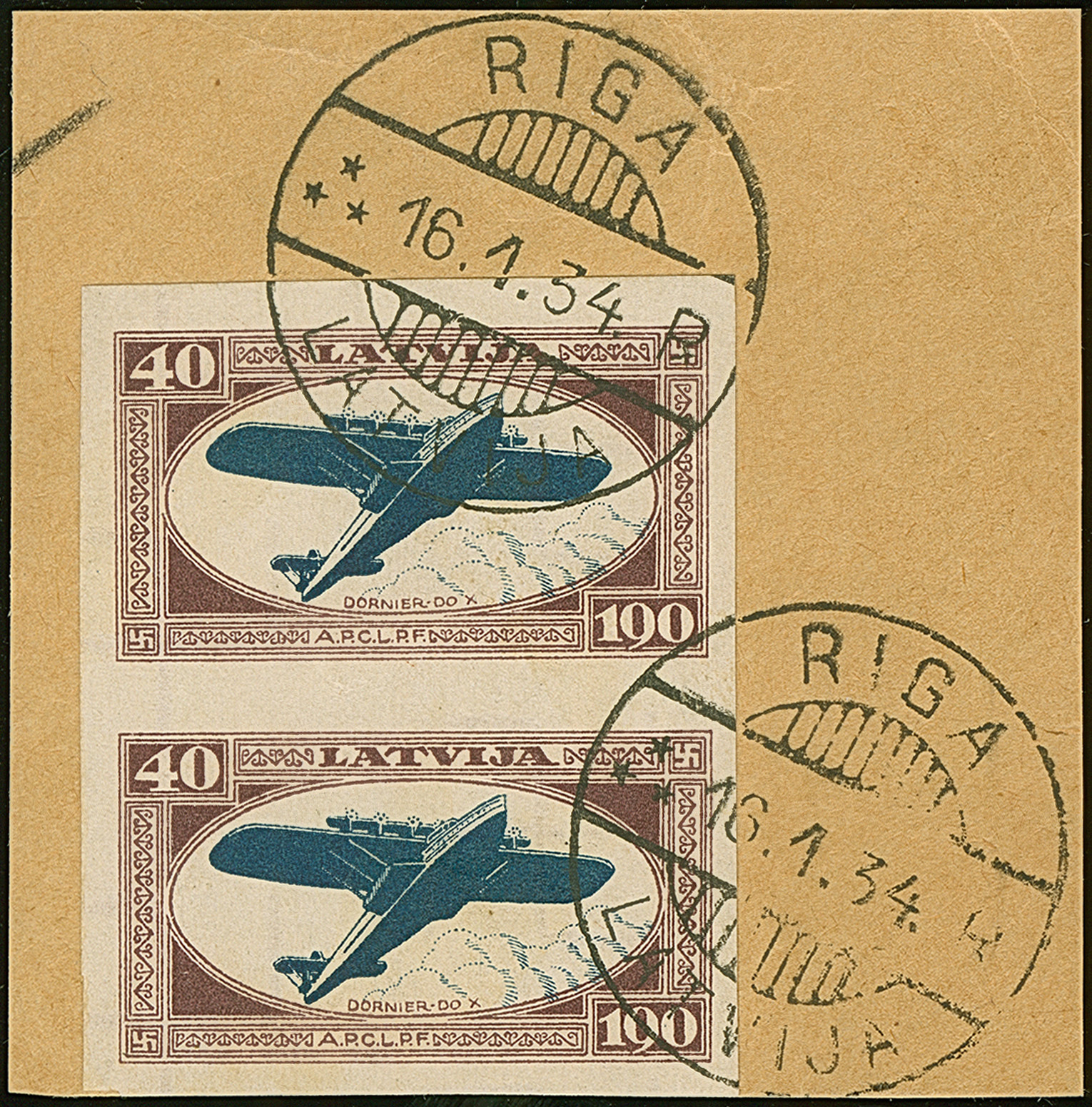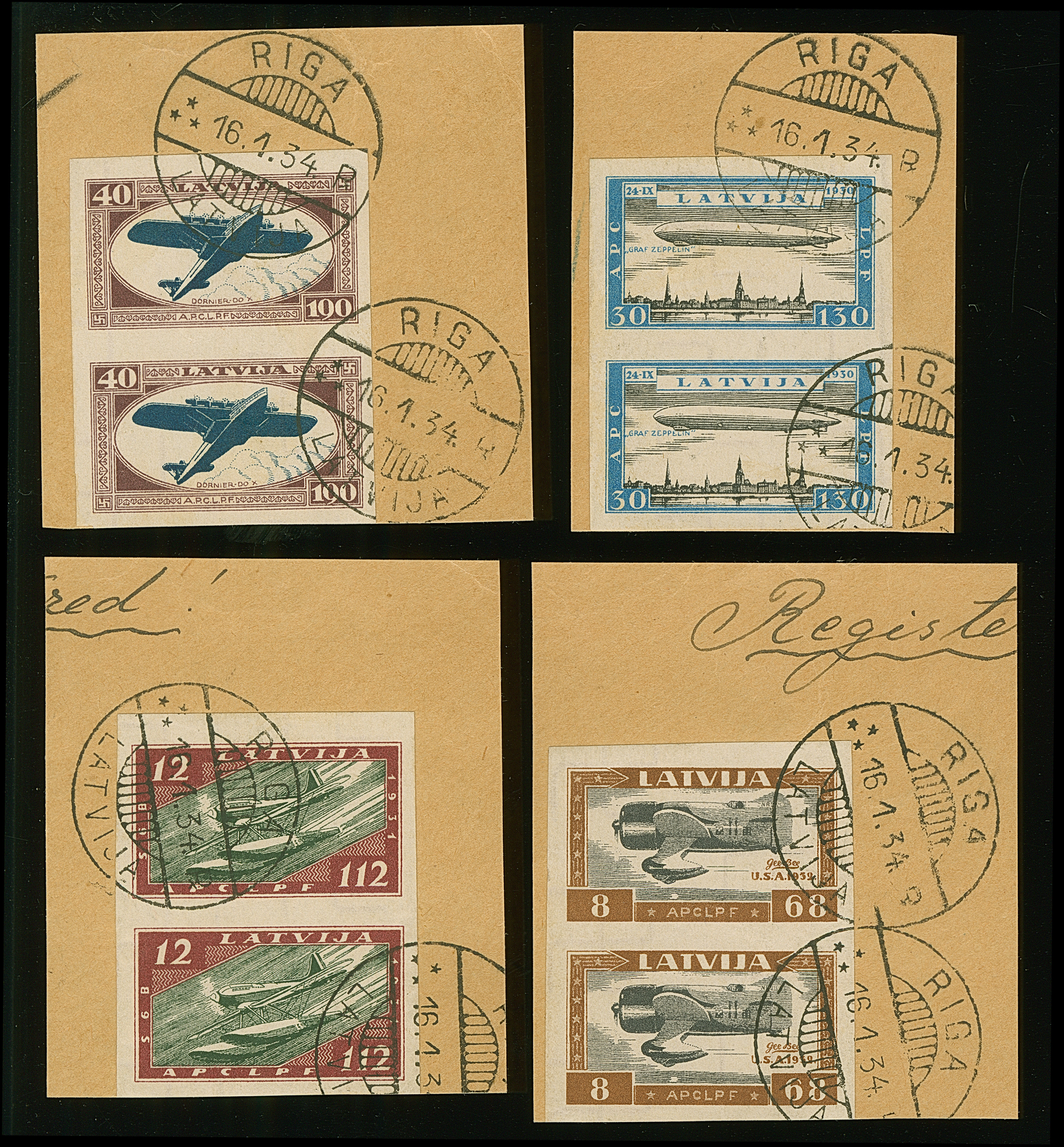 1933, Airmail Charity 8-40 santimi, imperforated vertical pairs, tied by cds. “RIGA 16.1.43” to small pieces, fine, certificate Watzke BPP (2005)